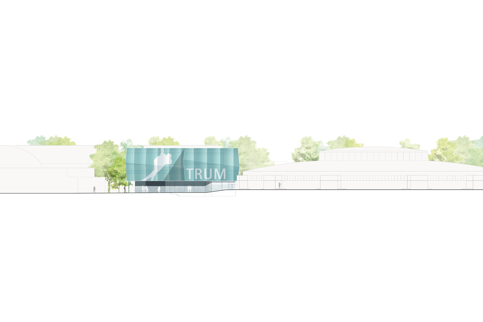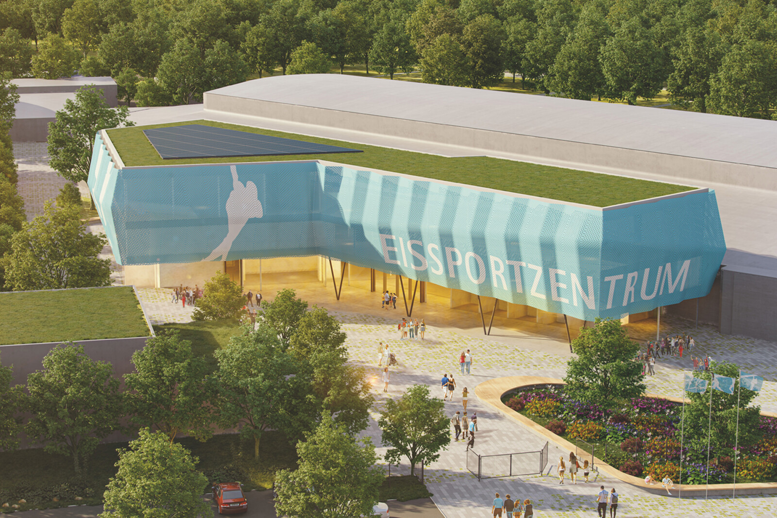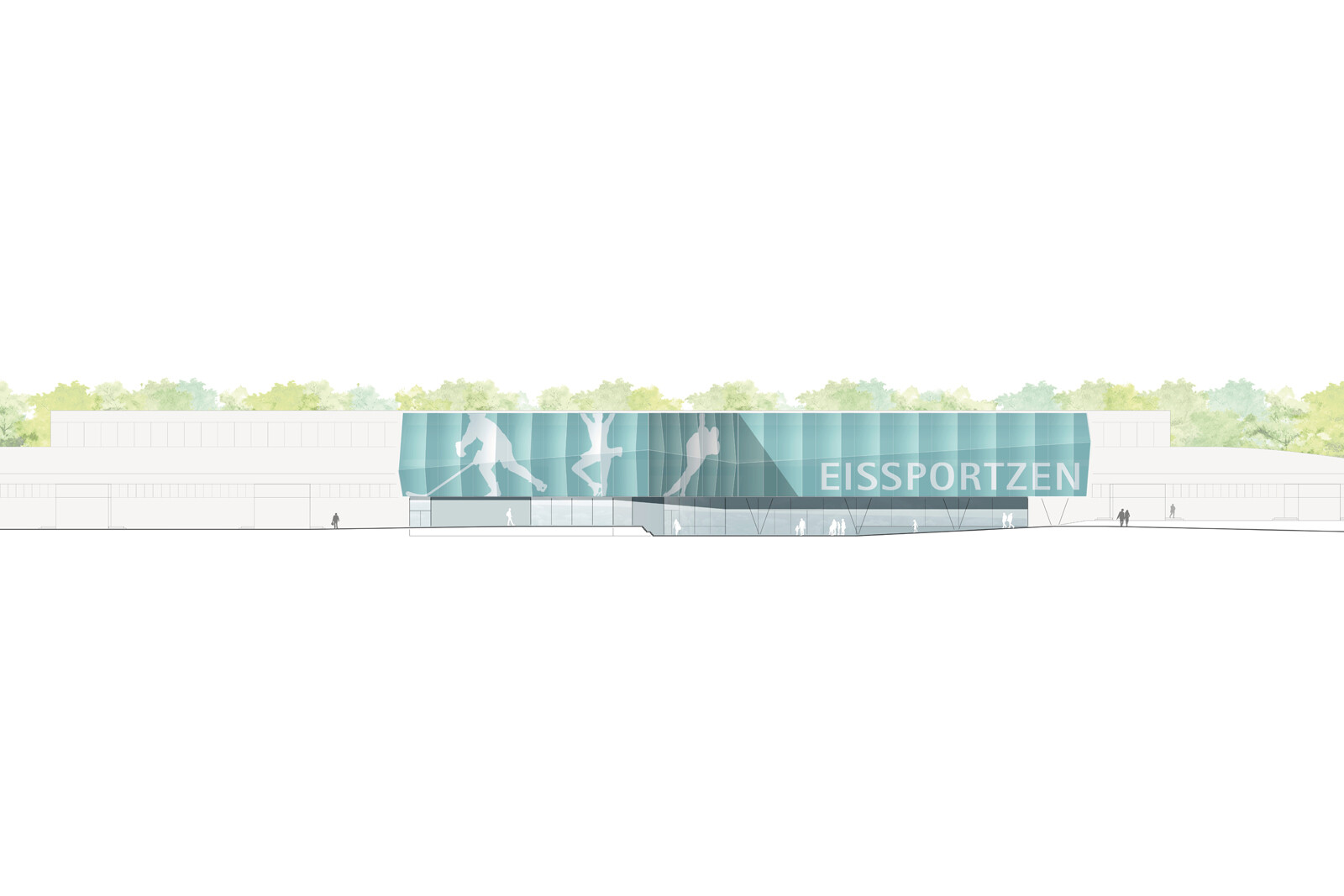 Die Erweiterung an die bestehende Eisschnelllaufhalle fügt sich als dreigeschossiger Baukörper zwischen dem Spitzensportlichen Trainingszentrum und dem Trainingshallenkomplex selbstverständlich ein. Durch die abstrahierte L-Form des Gebäudes entsteht eine einladende Geste für einen großzügigen Vorplatz, der als Treffpunkt und Versammlungsort dient. Markanter Blickfang ist eine vorgehängte, transparente Textilfassade in einem eisigen Blauton, welche die Obergeschosse kleidet. Sie verleiht dem Gebäude nicht nur eine gewisse Leichtigkeit und Dynamik, sondern schafft von außen ein identitätsstiftendes Erscheinungsbild, das der repräsentativen Adresse für den Eissport weithin Sichtbarkeit verleiht.