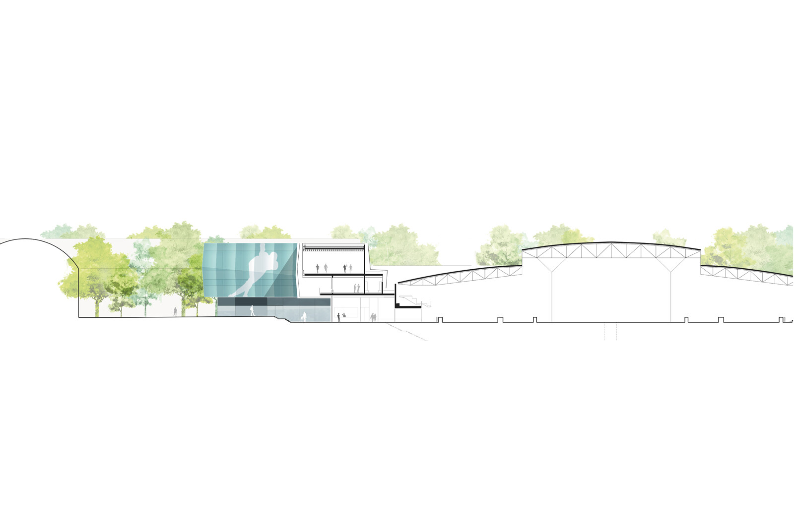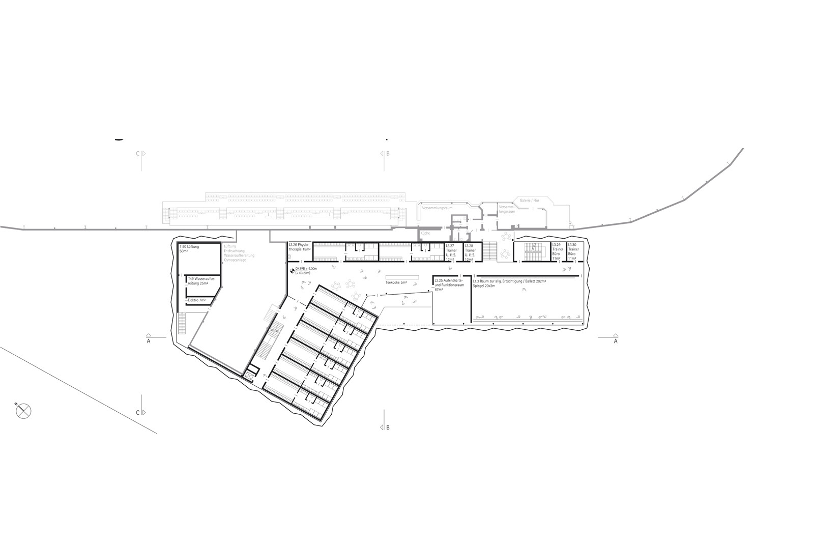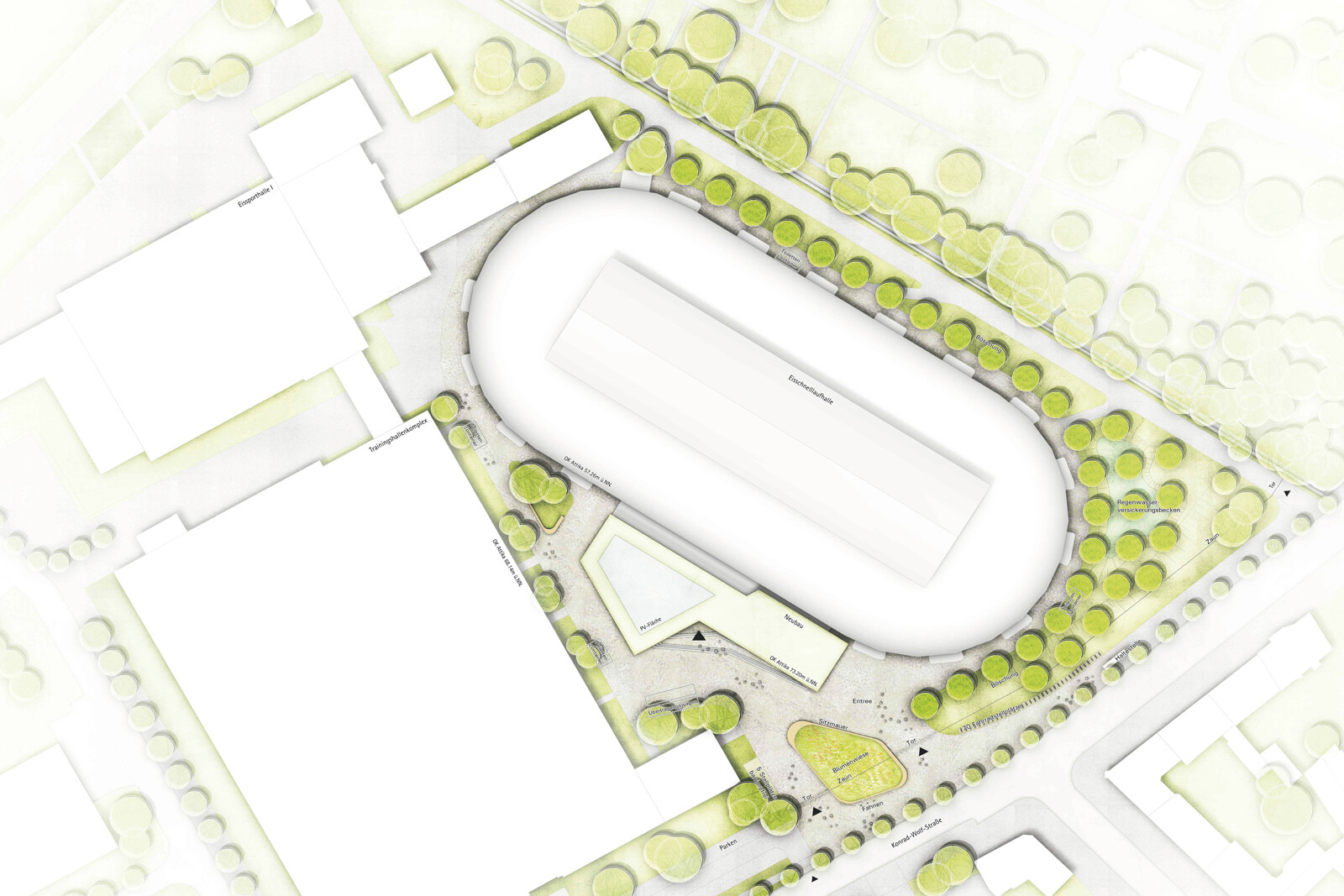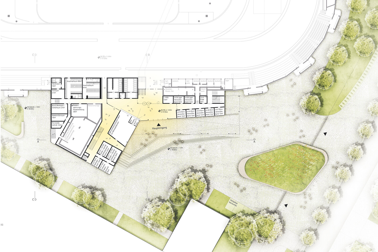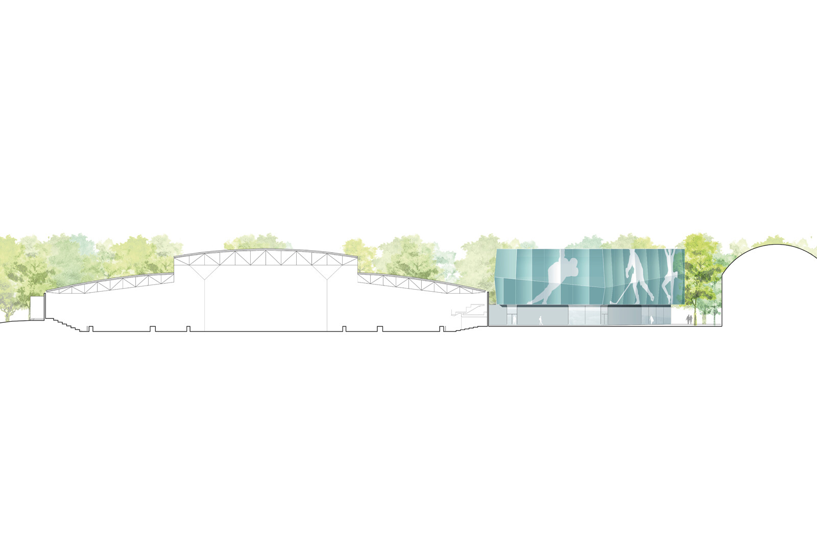 Die prägnante Textilfassade umhüllt sowohl den Neubau als auch alle Bestandsräume wie Notstromanlage, Wasseraufbereitung, Osmoseanlage usw. im Erdgeschoss und 1. Obergeschoss. Um klare Abläufe zu gewährleisten, wurden der bestehende Eingangsbereich sowie die Arzt- und Anschnallräume neu organisiert und erweitert. Im Erdgeschoss entsteht eine neue, großzügige Eingangshalle, die beim Betreten den Blick in die Eisschnelllaufhalle freigibt. Sie dient als zentrale Anlaufstelle und Orientierungspunkt für alle Bereiche des Gebäudes. Direkt an das Foyer angeschlossen sind die öffentlichen WCs, der Kassenraum, der Schlittschuhverleih und der Erste-Hilfe Raum. Zudem befindet sich hier über eine Drehkreuzanlage der Zugang zum Tunnel und zur kleinen Tribüne. Im Südosten der Eingangshalle liegen die Vereins- und Verbandsräume, die entweder über die Eingangshalle oder das neue Fluchttreppenhaus zugänglich sind. Gleiches gilt für die Aufsicht, deren Bereich hinter den Vereinen liegt. Im Nordwesten der Eingangshalle grenzen der Sportlerzugang zur Halle, die Anschnallräume, die Arzträume, die Werkstatt, der Technikbereich, der Mitarbeiterbereich und der Aufgang zu den Obergeschossen an den Eingangsbereich an. Sportler und Mitarbeiter haben die Möglichkeit, über einen eigenen Eingang in ihre Bereiche zu gelangen, sind aber auch an die Eingangshalle angeschlossen. Somit können alle Bereiche von der Eingangshalle aus erschlossen werden, bieten aber auch ihre eigenen Zugänge. Damit ist gewährleistet, dass sich die Wege der einzelnen Nutzergruppen sowohl im Alltag als auch an Wettkampftagen nur an den notwendigen Stellen kreuzen. Im 1. Obergeschoss befindet sich die Bestandstechnik und auch neue Technikräume, die über eine Treppe aus dem Erdgeschoss mit separatem Zugang erschlossen werden können. An die Bestandstechnik grenzen im Südosten die Umkleide- und Sanitärbereiche der Sportler, der Physioraum, der Aufenthaltsraum mit Teeküche, der Ballettraum und die Trainerräume an. Dieser Bereich wird über die zentrale Treppe und den Aufzug erschlossen und bietet im Flurbereich bei der Teeküche Aufenthaltsflächen und einen Balkon. Die Trainer können über das zweite Treppenhaus schnell zu ihren Räumen gelangen. Im 2. Obergeschoss sind der Laufbereich mit kleinem Außenbereich, der Ergometrieraum, der Kraftraum und das Lager angeordnet, die alle zentral vom Treppenhaus und somit auch schnell von den Umkleiden aus erreichbar sind.