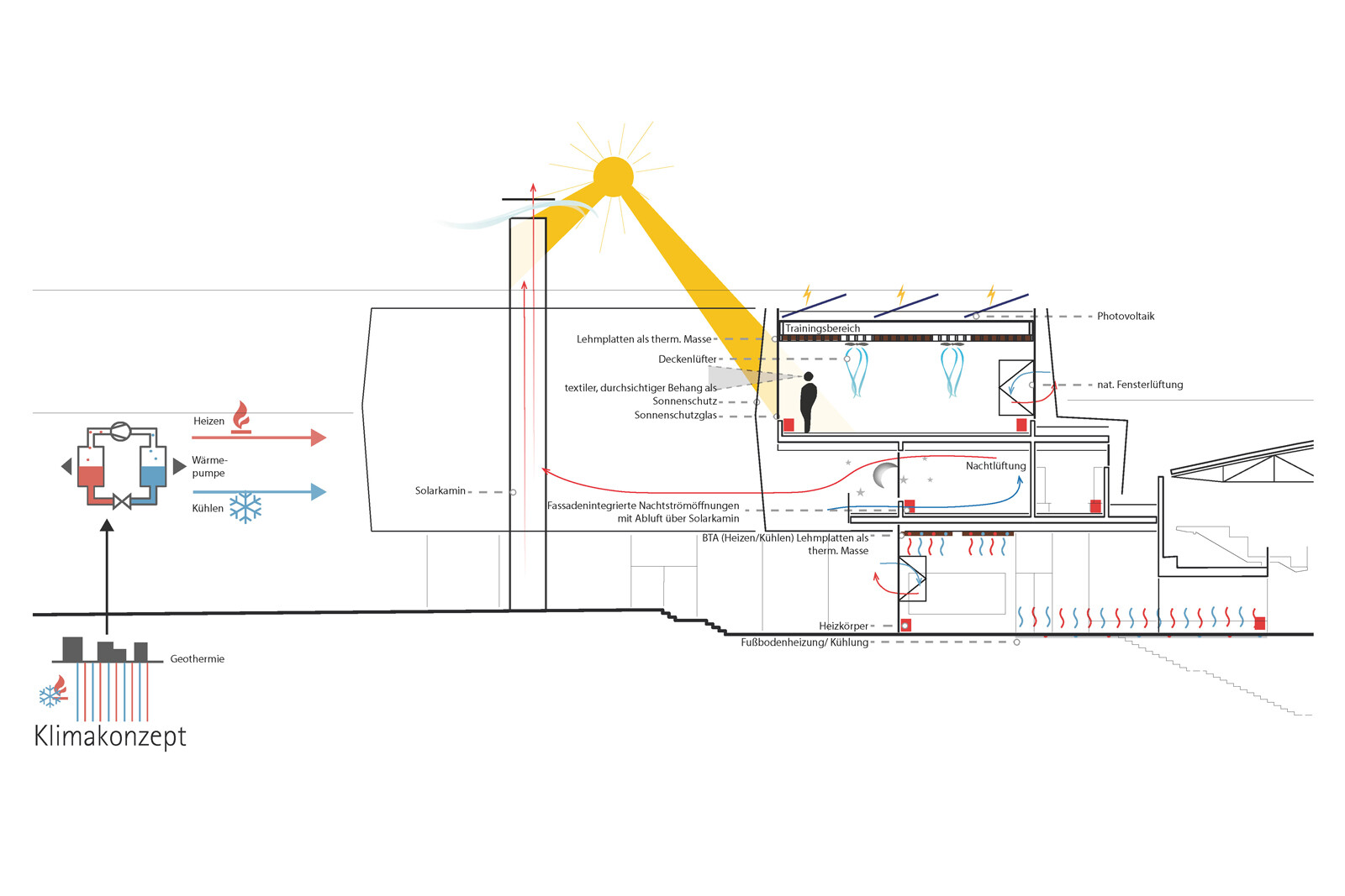 Ziel des Nachhaltigkeitskonzepts ist die Optimierung der Aufenthaltsqualität unter einer robusten, kombinierten architektonischen und haustechnischen Lösung; gleichzeitig soll der Ressourcenverbrauch minimiert werden. Der Nutzer steht im Zentrum der Betrachtung. Natürliche Vorgänge mit unterstützender Technik schaffen eine angenehme Aufenthaltsqualität, wobei der Nutzer stets die Möglichkeit des Eingriffs hat. In dem architektonischen Konzept kommen passive Maßnahmen zum Einsatz, unterstützt durch modernste Technologie – wo notwendig und sinnvoll. Das Lüftungskonzept sieht eine optimierte natürliche Lüftung vor. In die permanent genutzten Bereiche wird Frischluft über eine Nachströmöffnung integriert in der Fassade eingebracht. Kamine saugen die Luft durch den thermischen Auftrieb ab. Über eine motorische Klappe kann der Luftvolumenstrom bedarfsgeregelt werden. Bei diesem Konzept bleibt die Decke frei von Kanälen. Die Zuluft wird im Winter durch vorbeiströmen an Heizkörpern vorerwärmt, um Zugerscheinungen zu vermeiden. Technikflächen für Lüftungsgeräte werden dadurch minimiert. Das System ermöglicht zudem die Nachtluftspülung ohne Strombedarf und ist einbruchssicher. In allen Bereichen kann zudem manuell über Fenster in der Fassade gelüftet werden. Die Basis des sommerlichen Komforts bildet der starre, textile Sonnenschutz, mit Sonnenschutzglas und der thermischen Speichermasse von Lehmplatten unterhalb der Decke. Der Sichtbezug nach Außen durch den Sonnenschutz ist durch die Materialauswahl und den Transparenzgrad gegeben. Die thermische Masse wird nachts primär über Nachtluftspülung entladen. In Spitzenkühlzeiten werden in den Sportbereichen die Deckenlüfter, in den Bürobereichen die mit Bauteilaktivierung versehenen Lehmplatten und im Foyer die Fußbodenkühlung aktiviert. Zur Deckung des Kältebedarfs wird ein geothermisches System empfohlen, im Verbund mit reversibler Wärmepumpentechnik. Dieses System bietet in der Regel ein hohes Direktkühlpotential im Verbund mit der Bauteilaktivierung. Der restliche Wärmebedarf wird konventionell über Fernwärme/Brennwertkessel abgedeckt. Auf dem Dach werden Photovoltaikmodule vorgesehen. Fazit: Das Konzept zur Optimierung der Nachhaltigkeit der baulichen Maßnahme ist „maßgeschneidert“ auf die Anforderungen angepasst und integraler Bestandteil des architektonischen Konzepts. Gebäude als auch das integrierte Energiekonzept reagieren auf die örtlichen Randbedingungen als auch die Anforderungen der Nutzung und unterstützten damit eine spezifische Identität. Der Verbrauch an Ressourcen wird signifikant reduziert und zugleich ein Maximum an Nutzerkomfort erzielt.