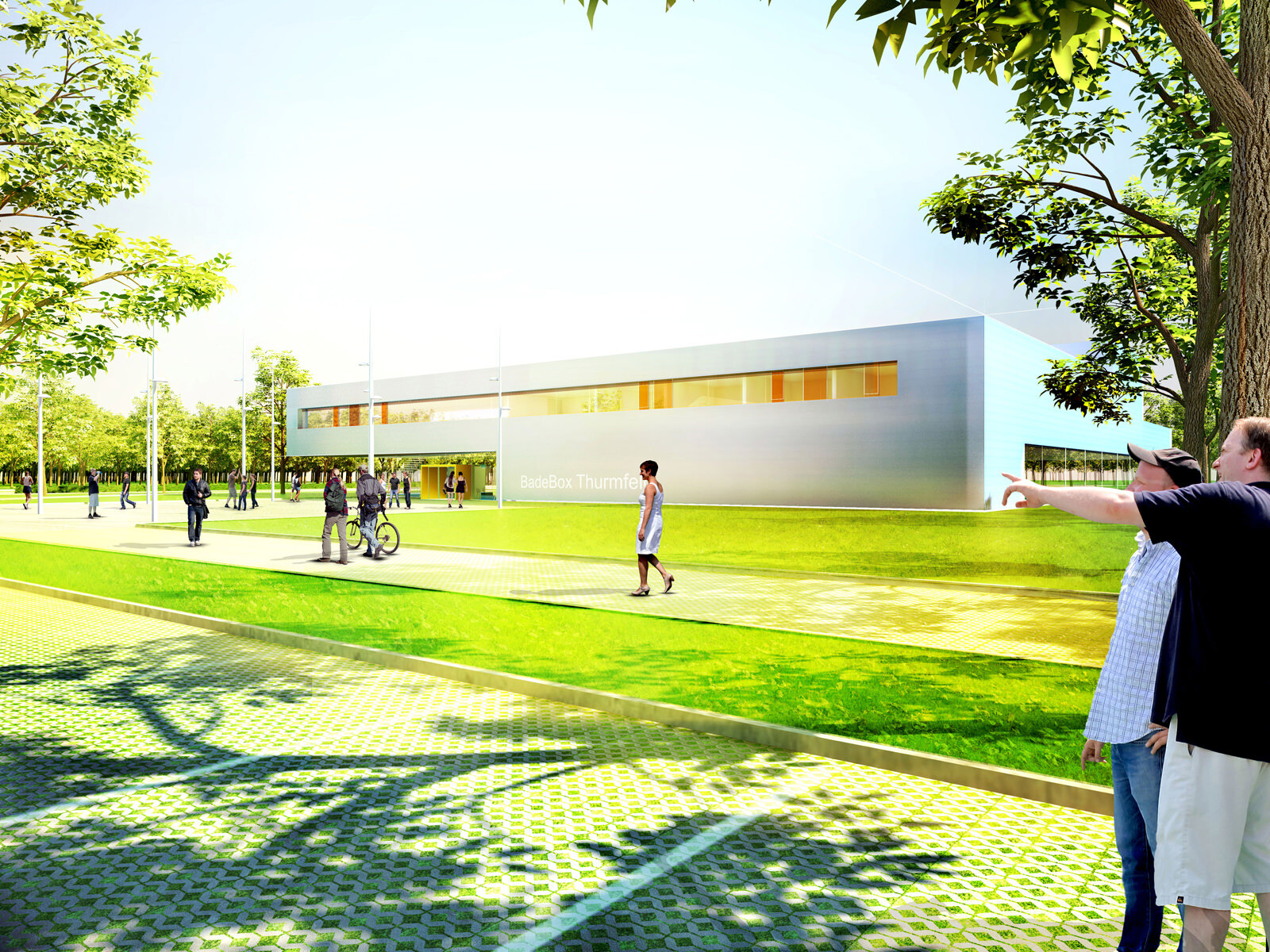 Grundsätzlicher Ansatz des Entwurfes ist es, ein modernes Sport- und Vereinsbad zu schaffen, welches eine sehr hohe architektonische Gestaltung mit funktionalen, wirtschaftlichen und energieeffizienten Aspekten vereint. Die Thurmfelder „BadeBox“ ist in der Grundrissausbildung knapp bemessen und in ihrer Kubatur durch differenzierte, auf die einzelnen Bereiche abgestimmte Höhen so gegliedert, dass eine maximale Ausnutzung bei minimaler Raumkubatur ein effektives, wirtschaftliches Gebäude entstehen lässt. Dennoch erhält die „BadeBox“ durch eine blaue Fassade aus metallischem Blech ein attraktives, skulpturales Äußeres, welches ein Zeichen für das neue Gebiet setzt. Diese äußere Hülle ist hoch wärmegedämmt und entspricht Passivhausstandard. Gezielt eingesetzte Glasflächen geben Ausblicke in die grüne Umgebung frei, sind aber ebenfalls minimiert, um sowohl große Wärmeverluste als auch eine Überhitzung zu verhindern.