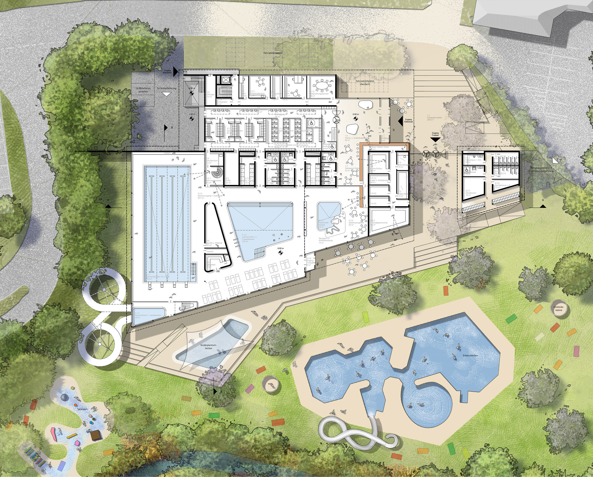1. Gastronomie und Anlieferung: Die Gastronomiebereiche von Hallen- und Freibad sind zusammengefasst und teilen sich eine gemeinsame Anlieferung und Lagerzone, was Synergien schafft und den Betrieb vereinfacht. Die Anlieferung der Freibadgastronomie erfolgt auf der nordöstlichen Seite des Schwimmbads vom Parkplatz aus.