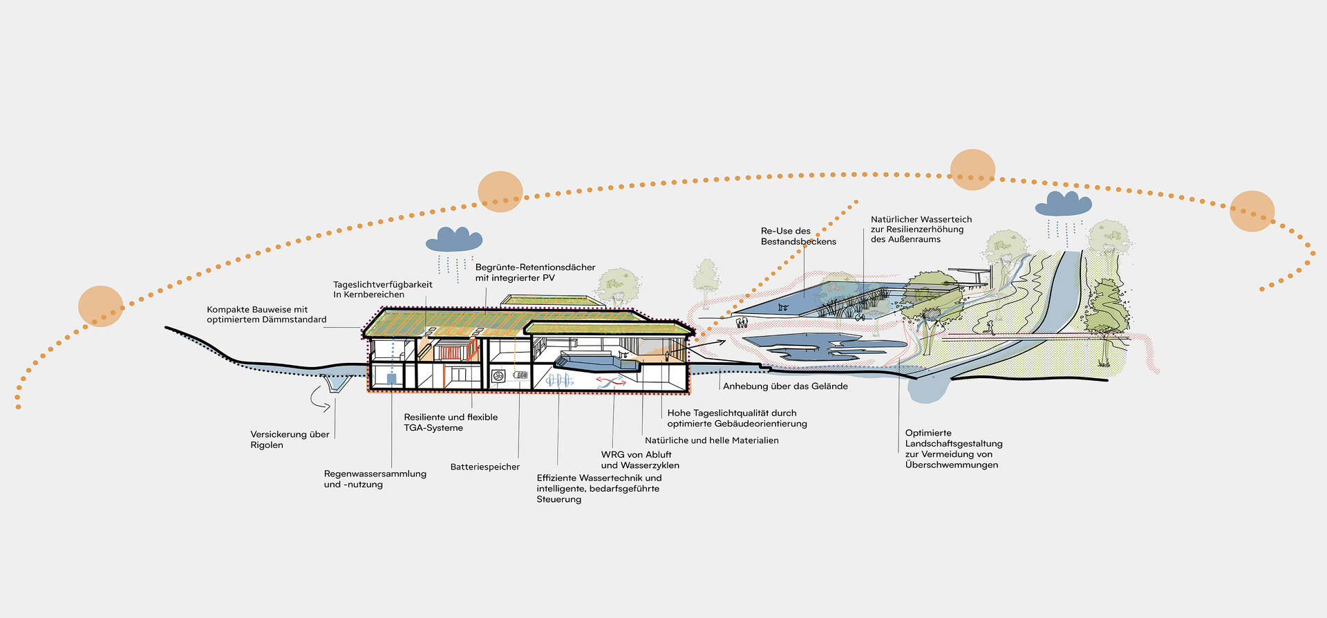 • Der Sockel verzahnt sich sanft mit dem Grünraum und fördert die Versickerung.