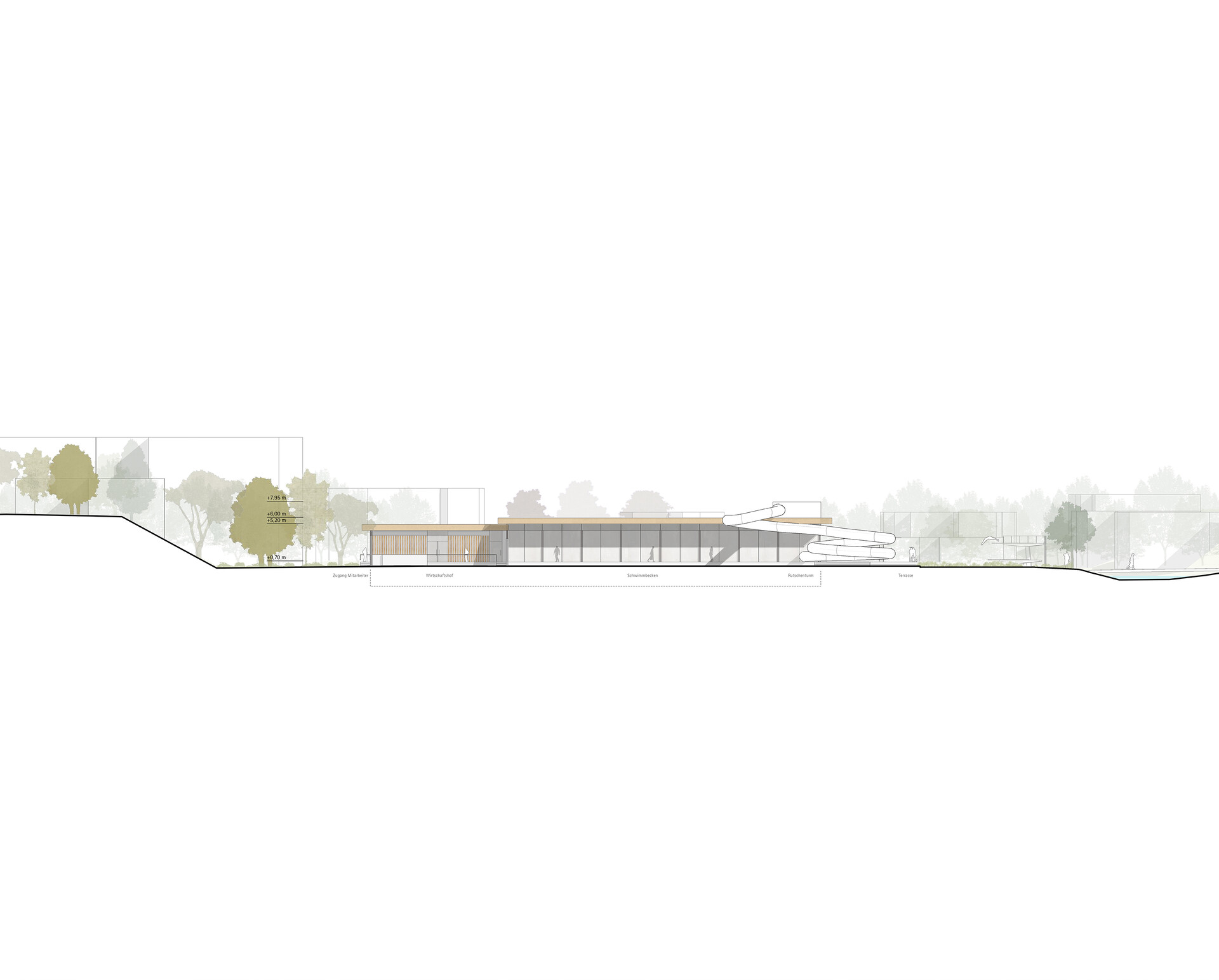 5. Dachlandschaft: Der Teil mit Schwimmer-, Nichtschwimmer- und Rutschenbereich erhält ein höheres Dachvolumen, während Kinderbereich, Gastronomie, Verwaltung und Umkleiden niedriger überdacht sind – dies verleiht dem Baukörper Maßstäblichkeit und Zonierung.