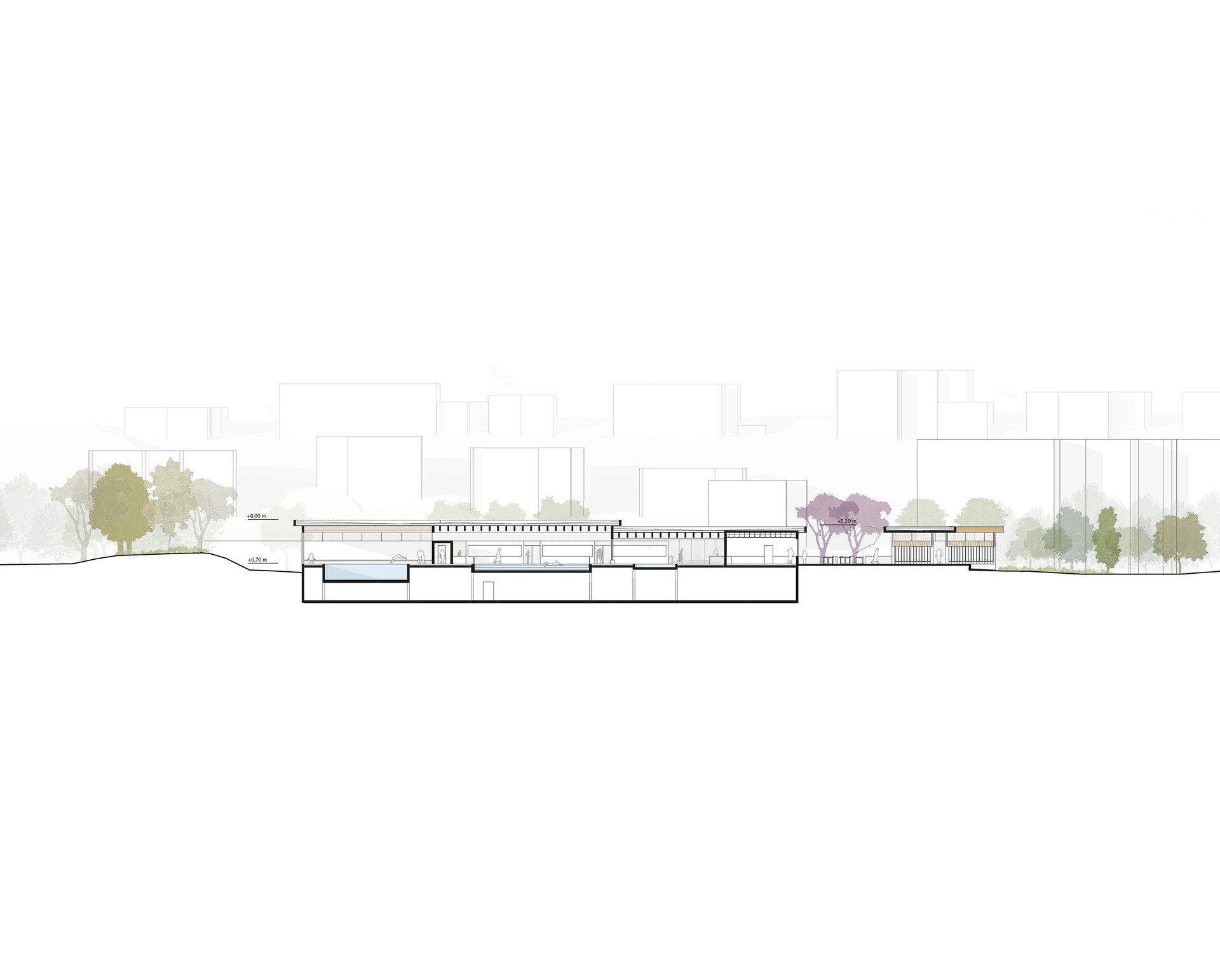 Der Neubau entsteht auf dem Standort des ehemaligen Hallenbads und integriert sich selbstverständlich in die bestehende Freibadlandschaft. Aufgrund der Hochwassergefahr wird das Gebäude auf einem 70 cm hohen Sockel errichtet, der als baulicher Hochwasserschutz dient und zugleich eine terrassenartige Aufenthaltsfläche bildet. Dieser Sockel terrassiert sich sanft in das Gelände und schafft eine natürliche Verbindung zwischen Innen- und Außenraum. In die Terrasse wurde das neue Außenkinderplanschbecken spielerisch integriert. Es steht in engem räumlichen Bezug zu den Innenbecken und der Außengastronomie und schafft so eine lebendige, kommunikative Schnittstelle zwischen Hallenbad und Freibad.