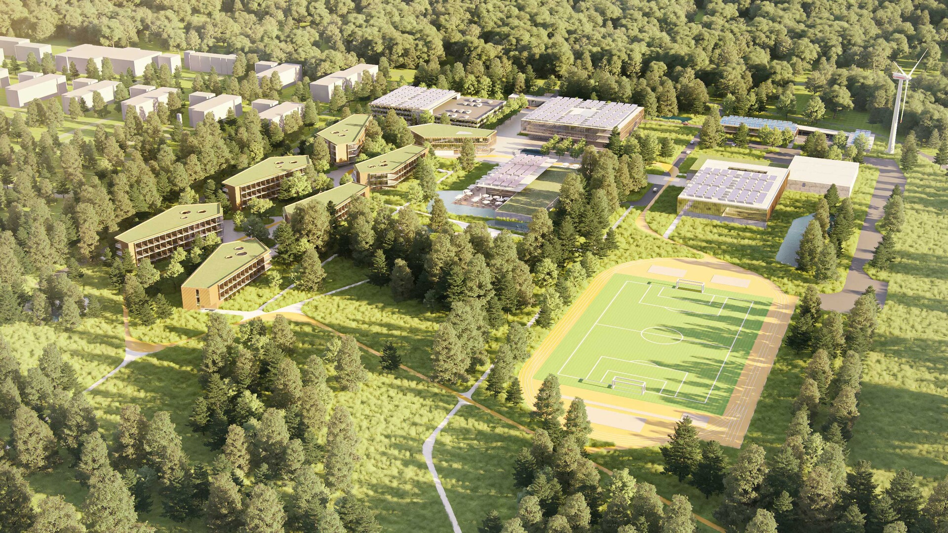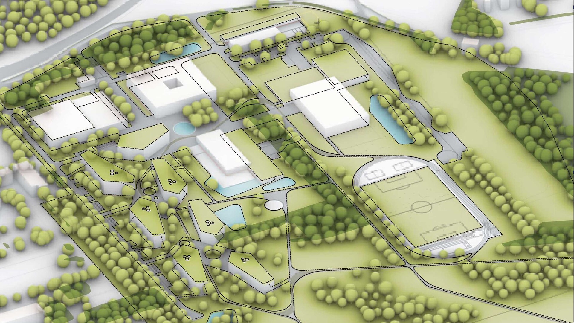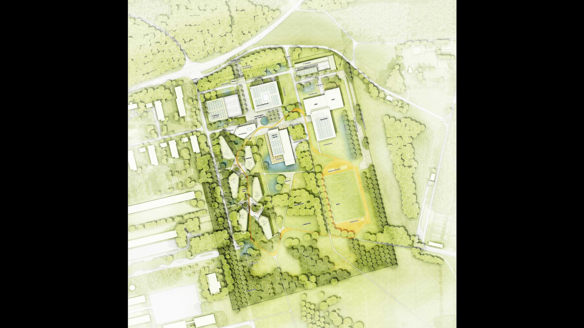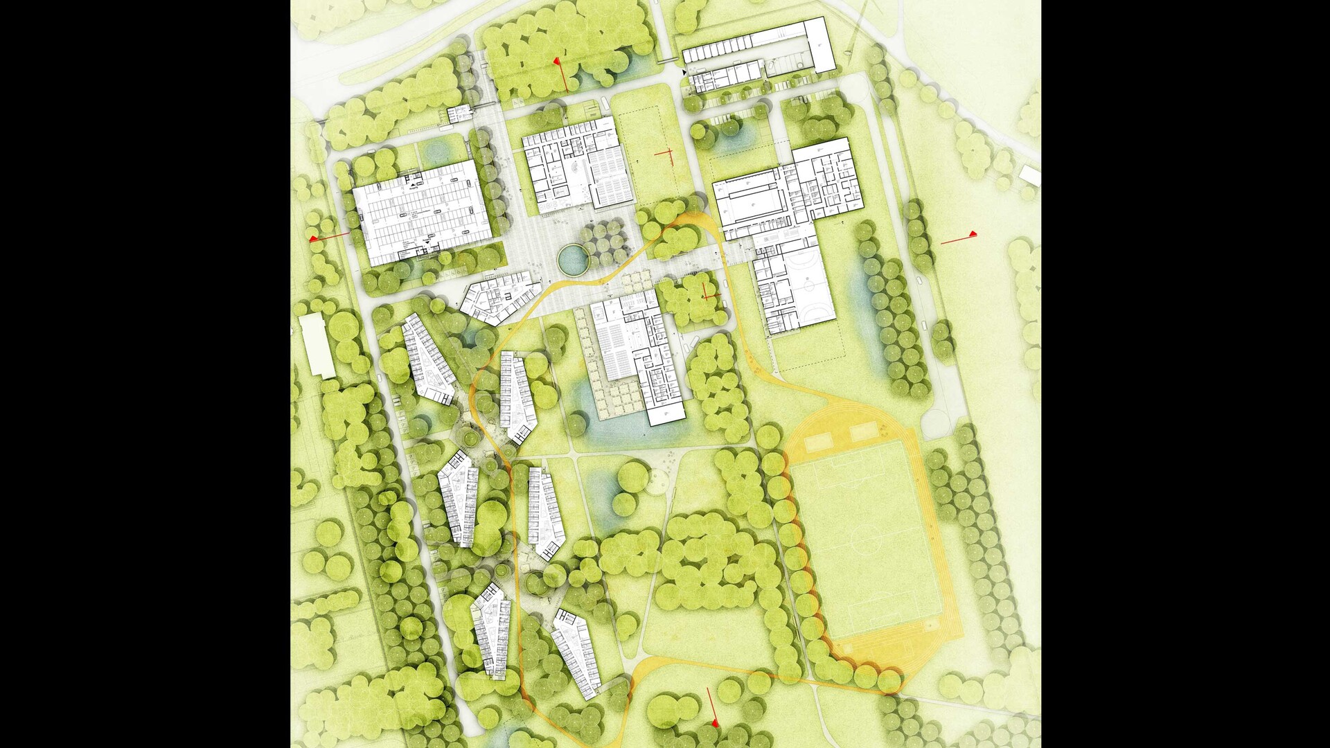 Mit Identität stiftenden Gebäuden integriert sich der Bildungscampus gut in den Landschaftsraum. Es entsteht ein Ort, der mit weich ausgebildeten Rändern sanft in die Umgebung übergeht. Die baulichen Strukturen der Wohnbebauung unterscheiden sich deutlich zur strengen baulichen Ordnung der Funktionsgebäude. Sie erstrecken sich nach Süden zum ruhigen Landschaftsraum, sind freier geformt und passen sich in den vorhandenen Baumbestand ein.