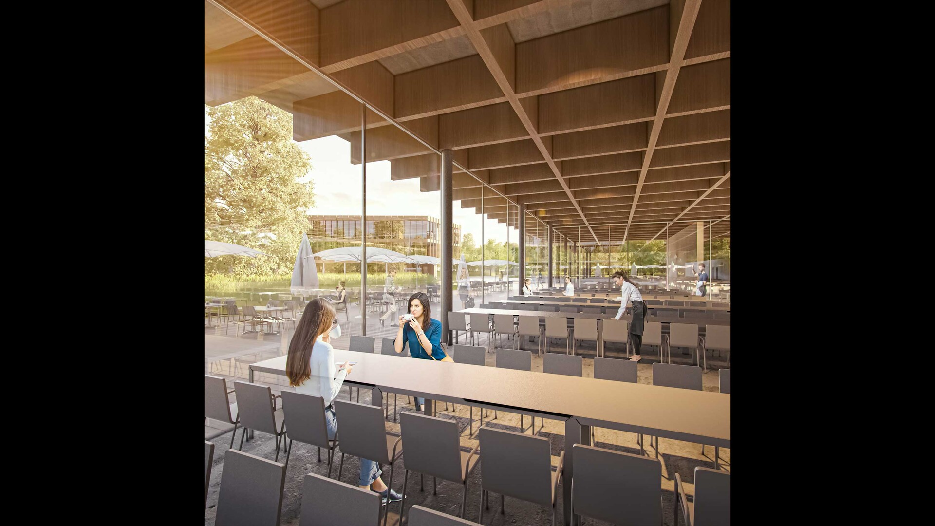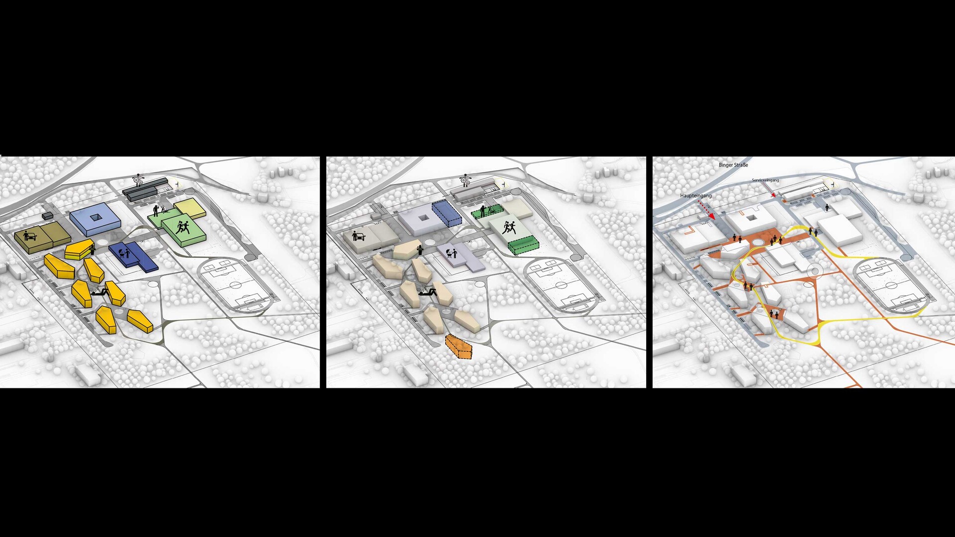 Vom nördlichen Eingangsbereich über Pforte und Parkhaus kommend, werden die Besucher*innen auf einen attraktiv gestalteten Platz geleitet. Dieser bildet das Herzstück des gesamten Areals. Um diesen Platz sind alle wesentlichen Gebäude wie die Verwaltung, das Hörsaalgebäude, die Mensa und die Sportgebäude angedockt. Diese innenliegende Freiraumfläche, der „Campus“, erzeugt eine hohe Aufenthaltsqualität mit klarer Struktur. Bei Veranstaltungen lässt sich der zentrale Platz als offenes Forum nutzen. Durch den vorgesehenen Betonwerkstein in changierenden Grau- und Beigetönen entsteht eine einheitliche und gut begeh- und berollbare Fläche, welche die einzelnen Teilbereiche zu einer räumlichen Einheit zusammenfasst.