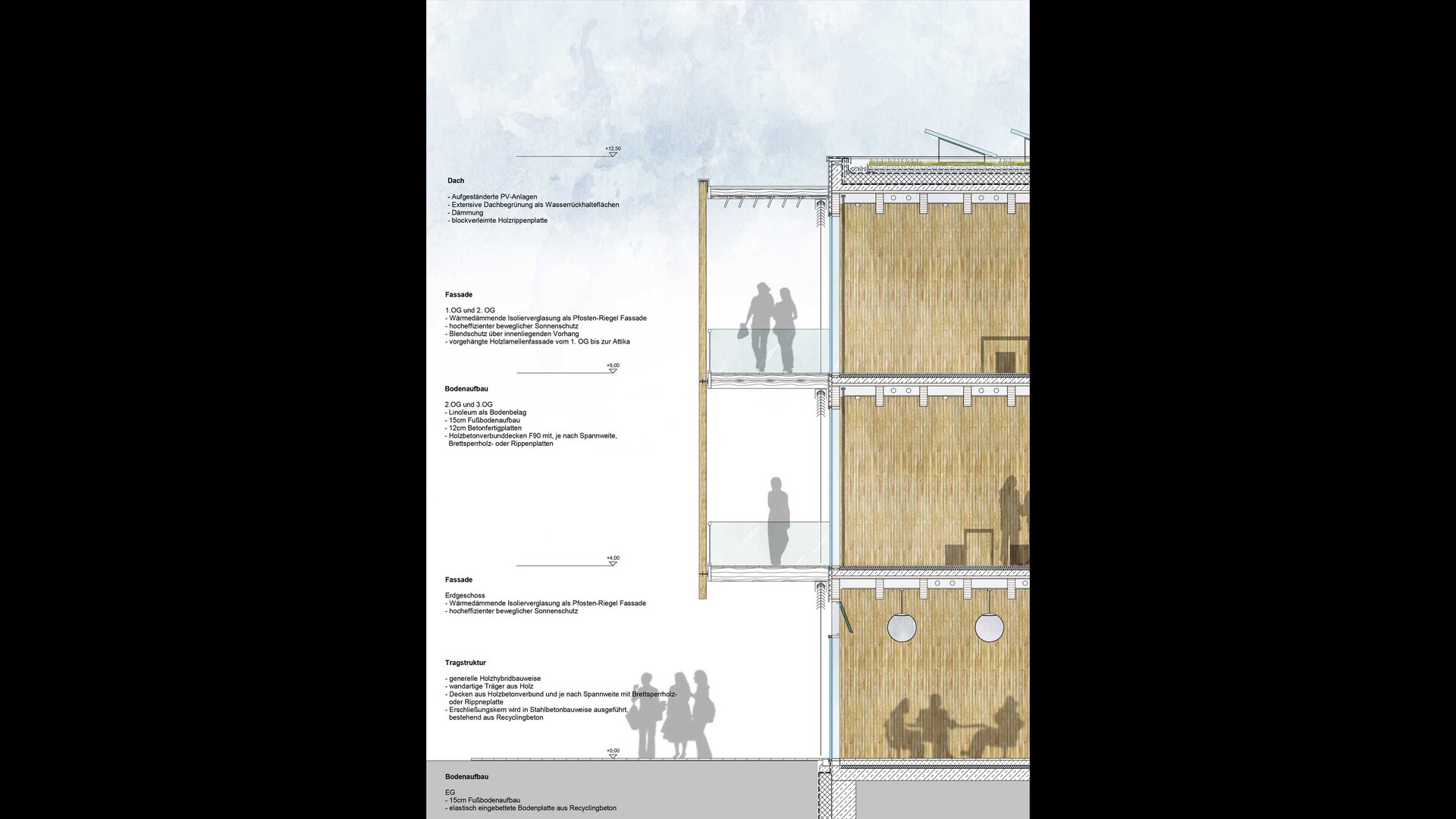 Für eine ökonomische und ökologische Bauweise werden nur Materialien eingesetzt, die recycelfähig und wiederverwendbar sind, dem Prinzip des Cradle to Cradle folgend. Holz ist der bevorzugte Baustoff. Durch die Hybridbauweise wird sichtbares Holz als Konstruktionselement in den Decken und bei den Trennwänden maßgeblich die Haptik und den Charakter der Gebäude prägen. Lediglich das Parkhaus ist als Stahlverbundbau vorgesehen. Im Innenraum herrschen naturbelassene und robuste Materialien vor. Sämtliche Fensterflächen sind als Holzaluminiumkonstruktionen mit 3-fach Verglasung vorgesehen, mit außenliegendem Sonnenschutz wo notwendig und innerem Blendschutz. Aus Gründen eines erhöhten Komforts sind Öffnungsflügel zur natürlichen Belüftung vorgesehen. Die geschlossenen Fassadenteile sind einheitlich als wärmegedämmte hinterlüftete Holzschalung ausgeführt. Einzig das Parkhaus erhält ein begrüntes Netz mit entsprechender Durchlässigkeit zur natürlichen Belüftung. Die Dächer sind extensiv begrünt und mit PV-Modulen versehen.