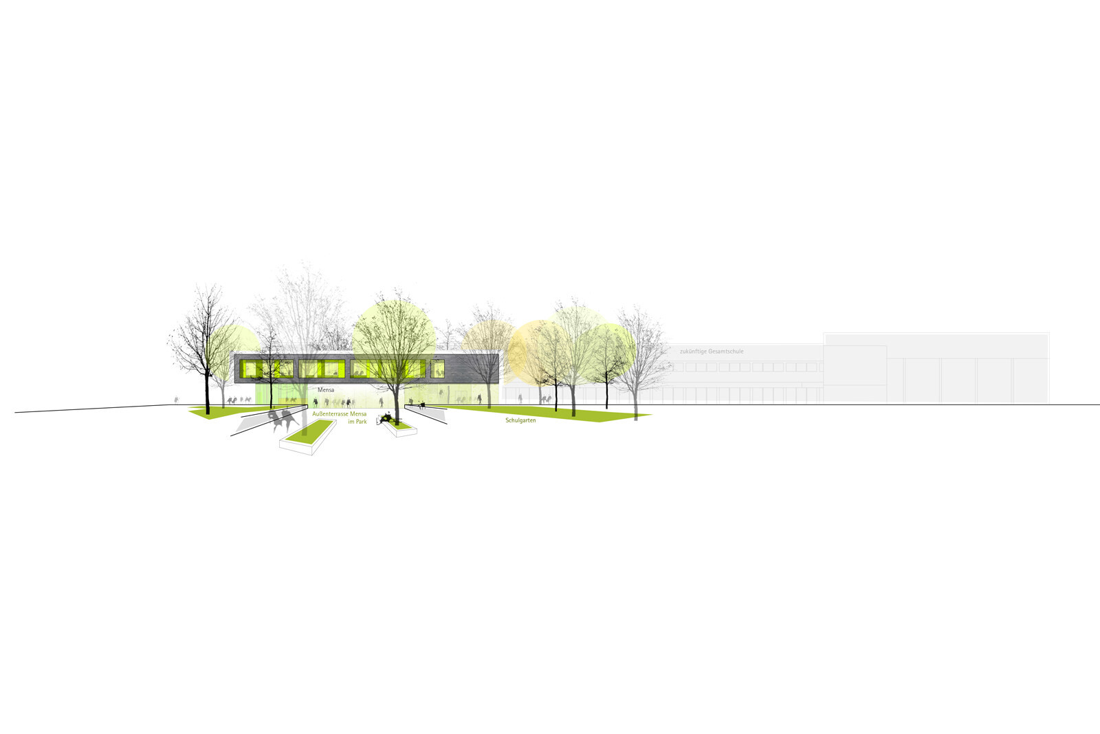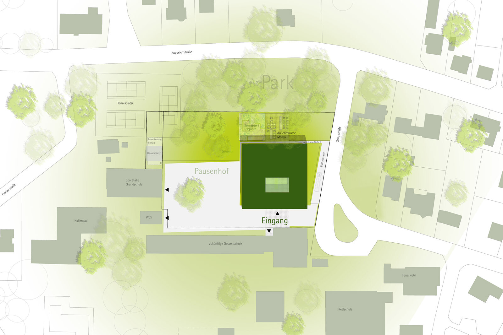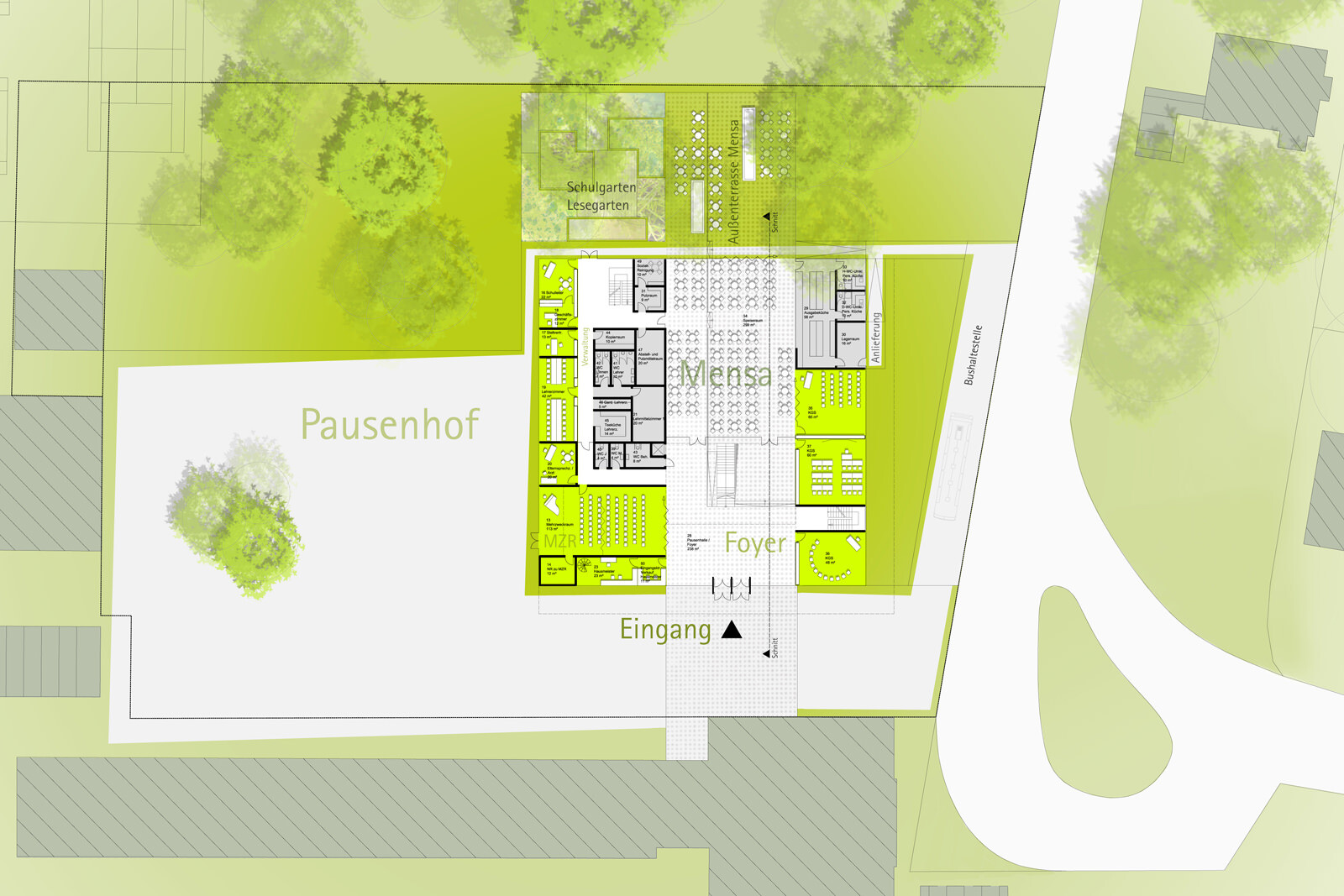 Das Gelände befindet sich im Bereich der "alten" Mädchenberufsschule sowie in einem Teil der städtischen Parkanlage am nördlichen Stadtrand von Kirchberg. Das neue Schulgebäude wird am Südrand des Grundstücks platziert und bietet so Raum für einen großzügigen Schulhof mit offener Flanke zum Park. Die großen Bäume bleiben erhalten und werden im Bereich Schulgarten und Mensa-Außenterrasse in die Gestaltung einbezogen. Der kompakte quadratische Baukörper bietet Klarheit und gute Orientierung im Inneren. Die als Innenhof mit natürlichem Oberlicht konzipierte Innenhalle im zentralen Bereich des Gebäudes ist für Gemeinschaftsaktivitäten vielfältig nutzbar und bietet Raum für ein lebendiges Schulleben.