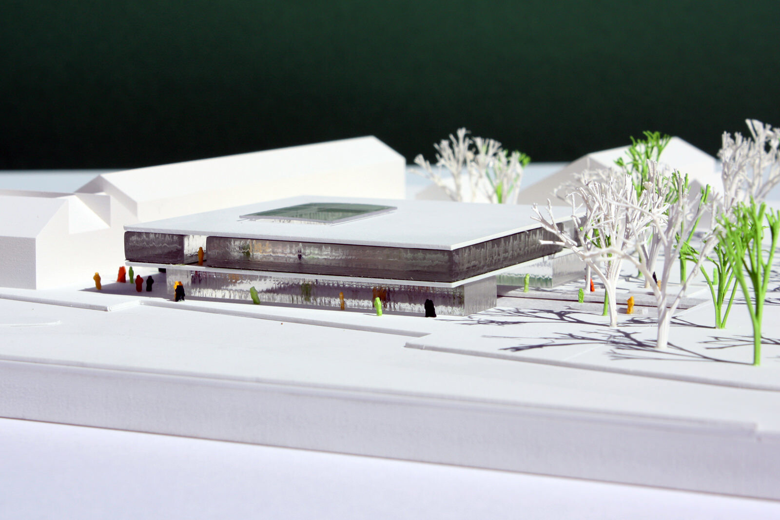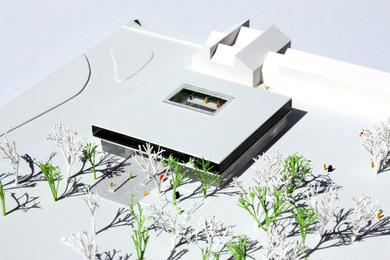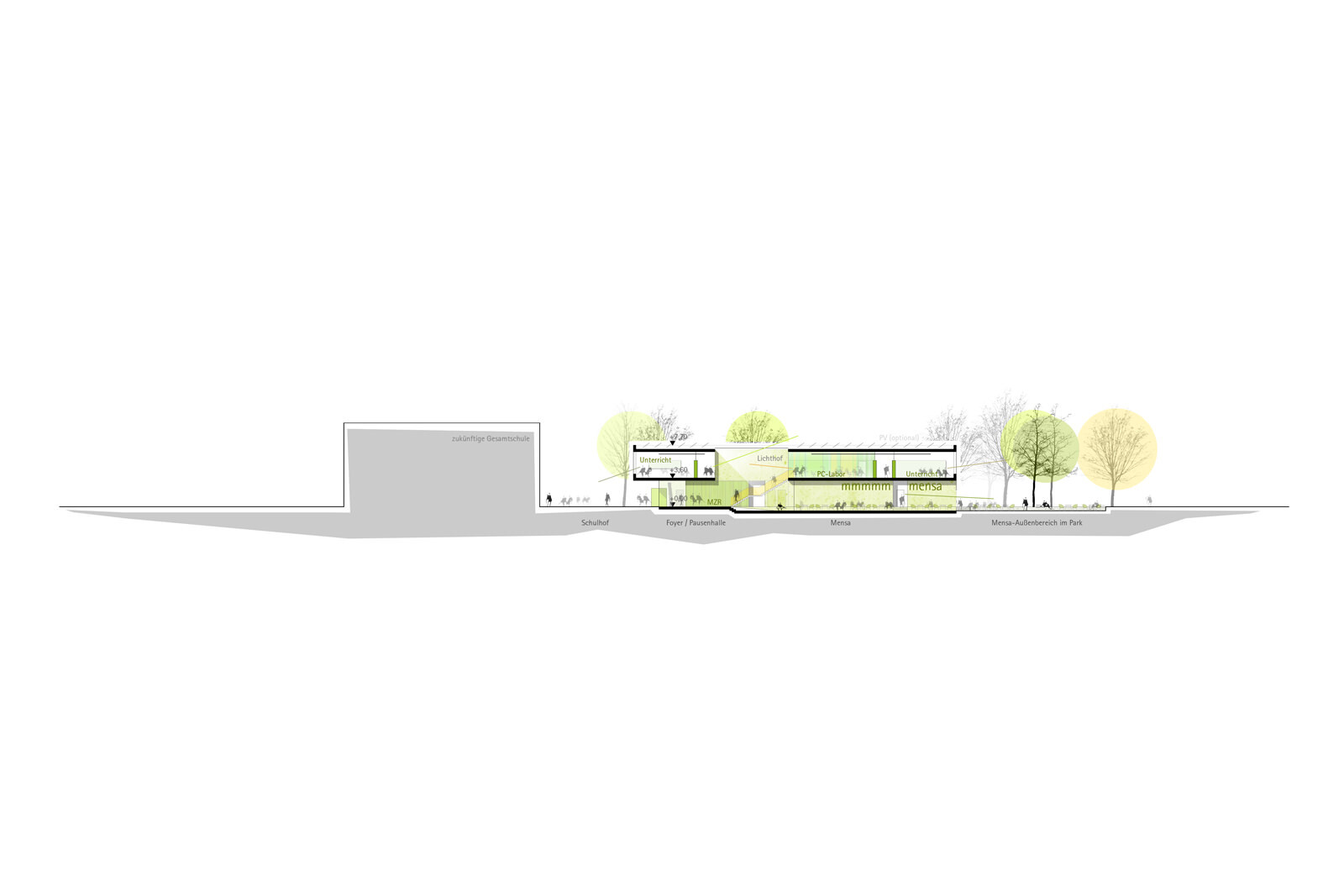Das Gelände befindet sich im Bereich der "alten" Mädchenberufsschule sowie in einem Teil der städtischen Parkanlage am nördlichen Stadtrand von Kirchberg. Das neue Schulgebäude wird am Südrand des Grundstücks platziert und bietet so Raum für einen großzügigen Schulhof mit offener Flanke zum Park. Die großen Bäume bleiben erhalten und werden im Bereich Schulgarten und Mensa-Außenterrasse in die Gestaltung einbezogen. Der kompakte quadratische Baukörper bietet Klarheit und gute Orientierung im Inneren. Die als Innenhof mit natürlichem Oberlicht konzipierte Innenhalle im zentralen Bereich des Gebäudes ist für Gemeinschaftsaktivitäten vielfältig nutzbar und bietet Raum für ein lebendiges Schulleben.