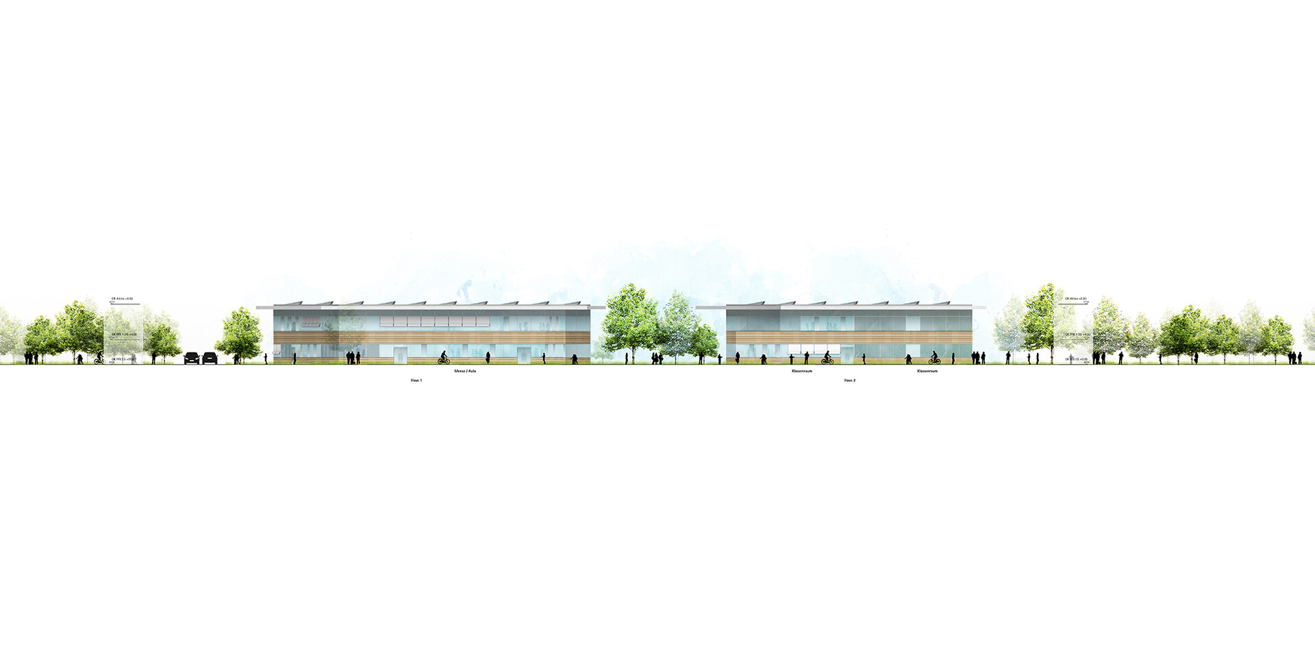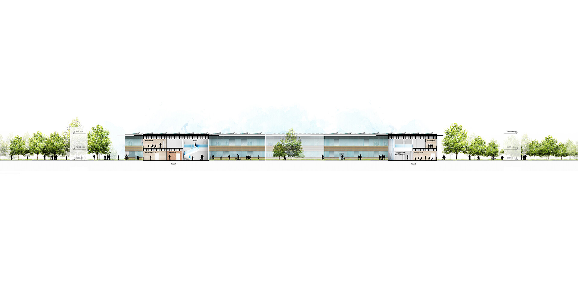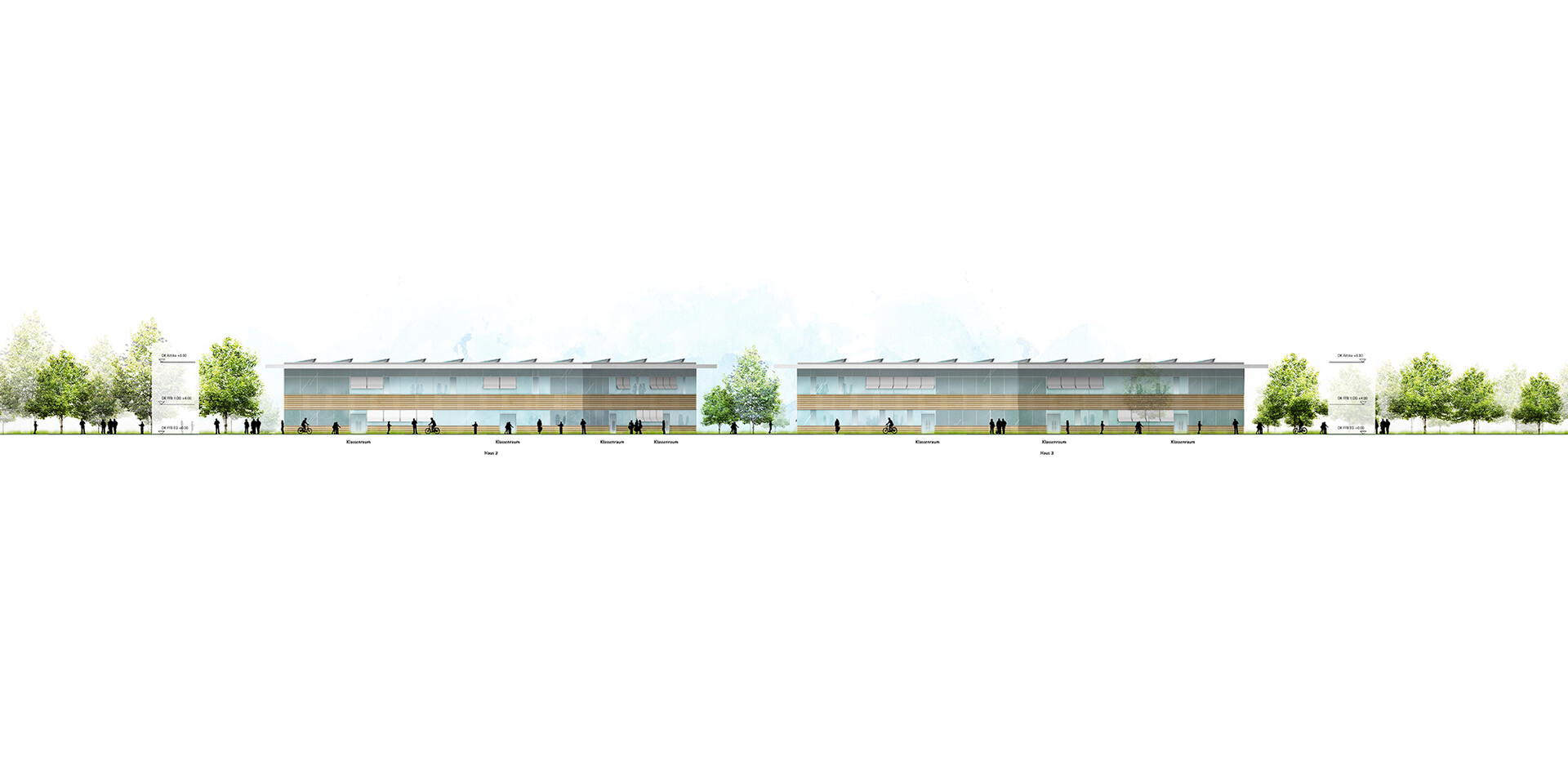 In den Häusern II + III sind sämtliche Klassenräume mit Nebenräumen untergebracht. Je zwei Klassen sind mit Teilungsraum zu einem Klassenverbund für klassenübergreifendes Lernen verbunden, drei Züge à sechs Klassen. Die vorgelagerten Erschließungsflächen bieten zusätzliche Aufenthaltsbereiche für freies Lernen und Spielen, Ausweichflächen und kommunikationsfördernde Zonen. Sie sind entsprechend möbliert und teilweise optisch und akustisch abgetrennt. Der Lehrerbereich liegt zentral im Haus II im Obergeschoss, mit kurzen Wegen zu allen Bereichen. Für die zukünftige Erweiterung zu vier Zügen wird ein eingeschossiger Baukörper im Osten vorgeschlagen, sodass ein problemloses Bauen ohne Beeinträchtigung des Schulbetriebs stattfinden kann. Alle Anforderungen an Feuerwehrzufahrten, Fluchtwege und Barrierefreiheit werden erfüllt.