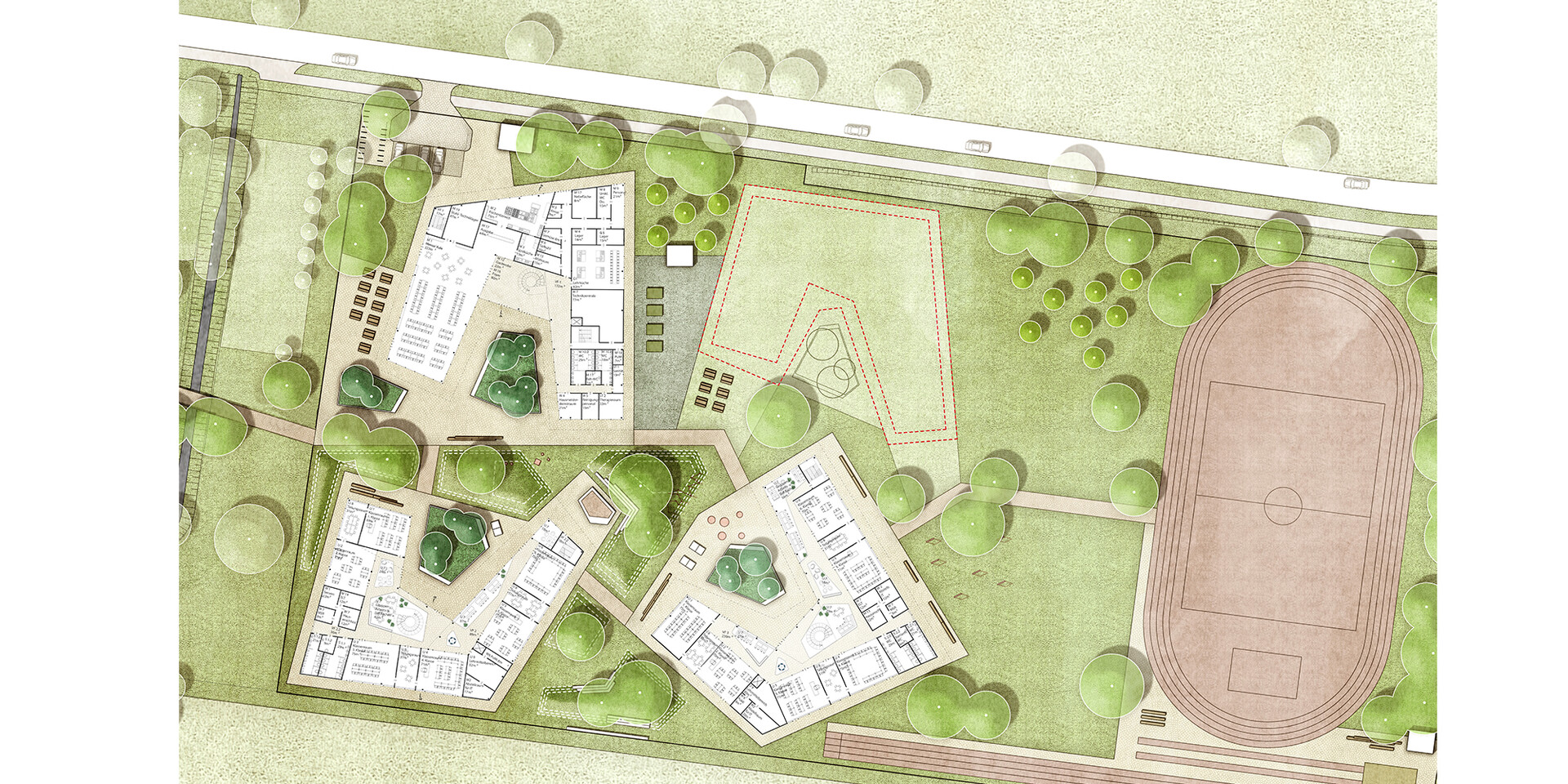 Auftakt und identitätsstiftende Adresse bildet als erster Baustein die Zweifeldsporthalle, die neben dem Schulsport auch Vereinen und den Wandlitzer Bürgern zur Verfügung steht. Dieser offen gestaltete Bereich in direkter Nähe zum Biotop und Bachlauf kann von allen Menschen im Ort genutzt und als Treffpunkt bespielt werden. Ein breiter Fußweg führt mit einer neu gestalteten Brücke durch das Biotop zum Schulcampus. Dieser wird aus drei gleichwertigen zweigeschossigen Baukörpern in lockerer Anordnung gebildet. Sie gruppieren sich um offene Höfe als Erschließungs- und Aufenthaltszonen und empfangen die Schülerinnen mit einladenden Vordächern. Alle Gebäude sind großzügig verglast, um in sämtlichen Räumen eine angenehme, helle Atmosphäre zu schaffen.