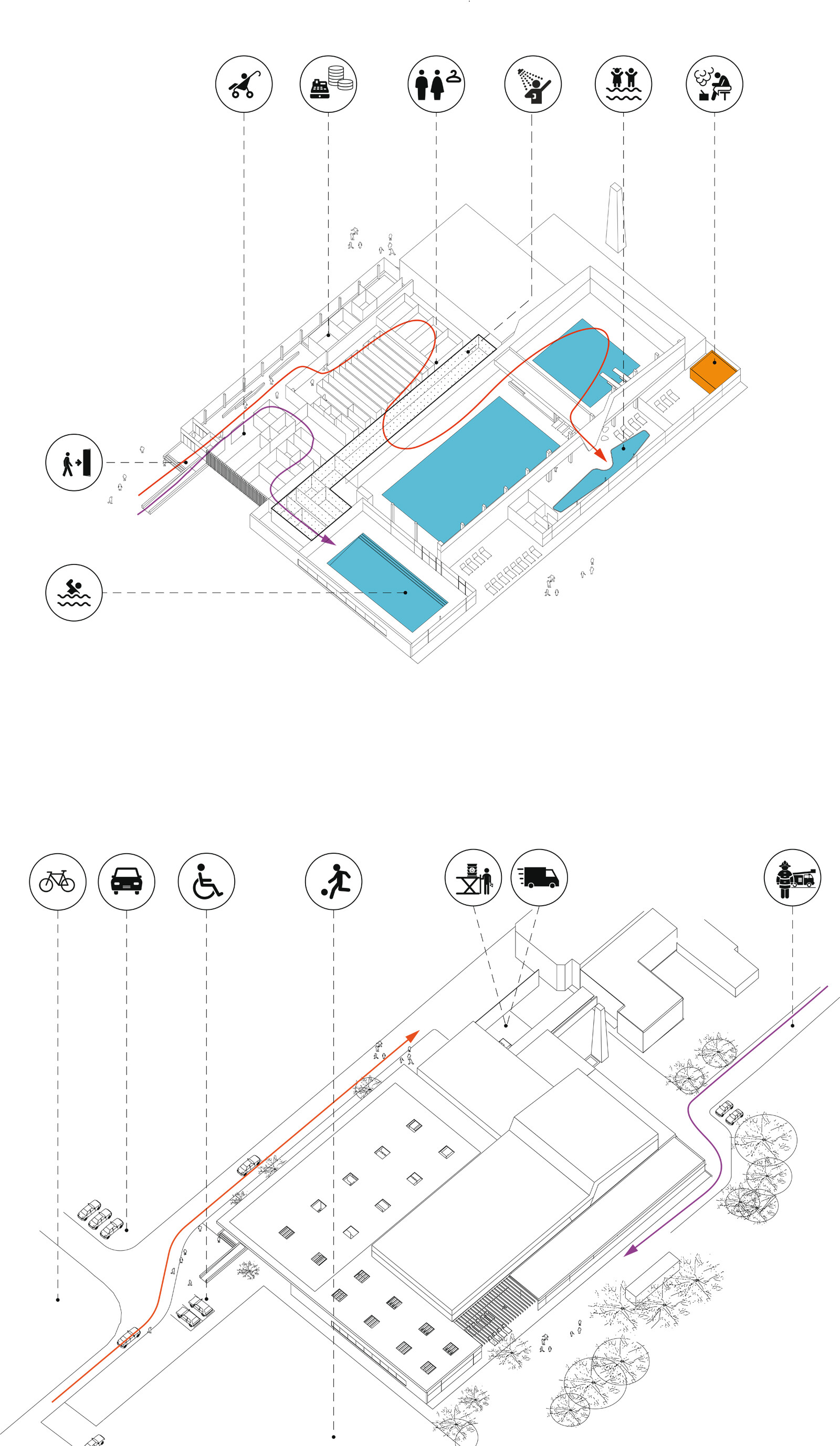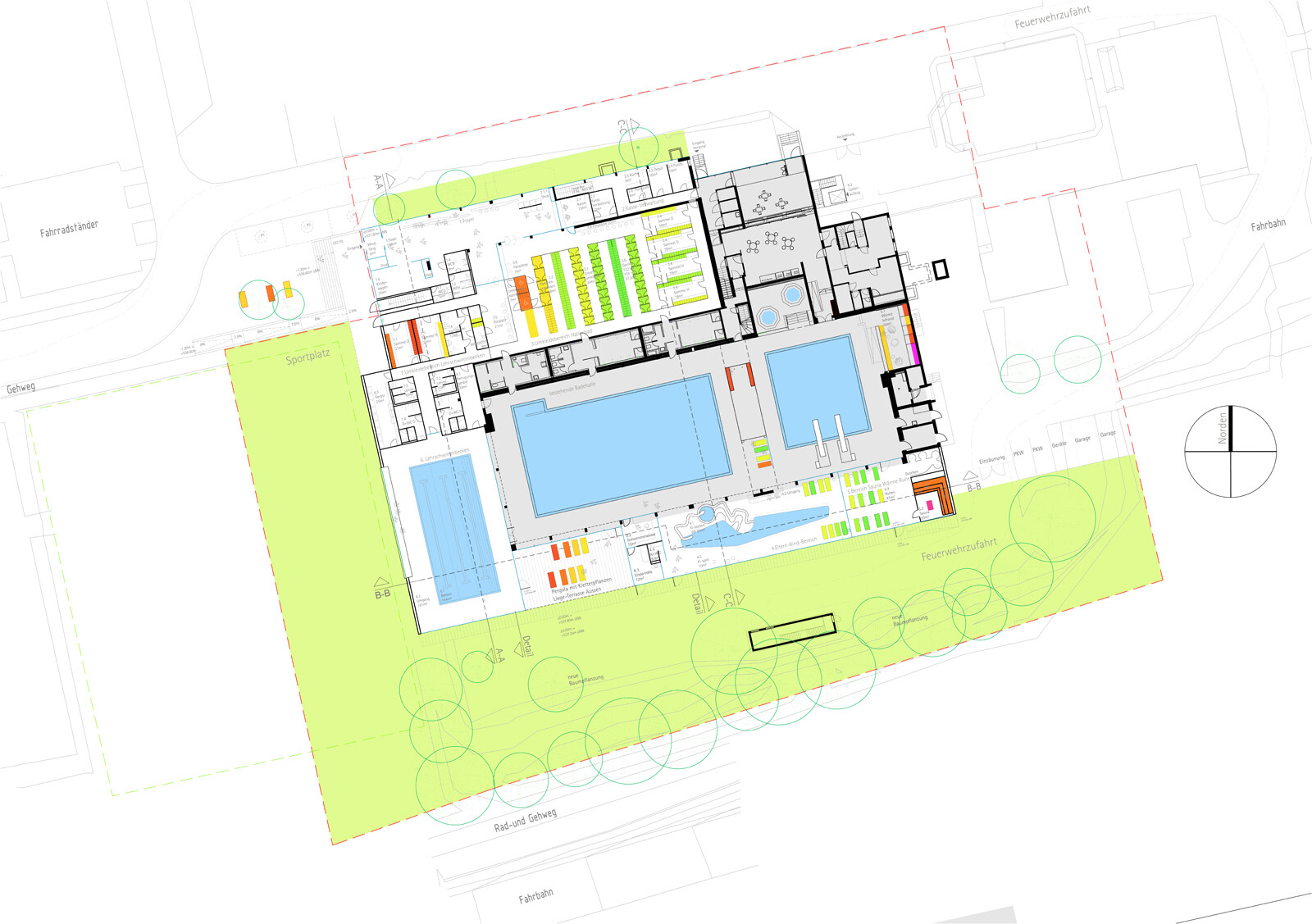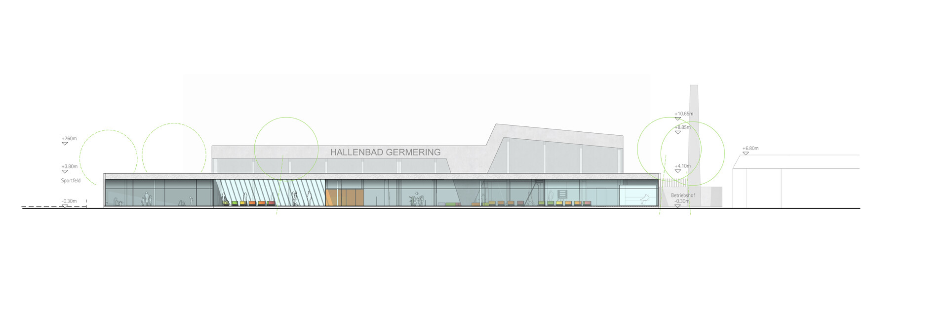 Der dezente, eingeschossige Neubau mit den gewünschten zusätzlichen Funktionsbereichen umgreift den zum Teil zweigeschossigen Bestand von drei Seiten. Der neue Eingang an gewohnter Stelle lädt durch die großzügige Verglasung die Besucher ein und führt sie vorbei an der Kasse zu den bestehenden Umkleiden und der Bestands-Badehalle. Über den separaten Zugangs-, Umkleide- und Sanitärbereich gelangt der Badegast in die südwestlich gelegene, neue Badehalle mit dem Lehrschwimmbecken. Der Eltern-Kind-Bereich und die Sauna mit Ruhebereich liegen im Süd-Osten und sind dem grünen Garten zugeordnet. Die funktionale Trennung der einzelnen Bereiche erfolgt durch semitransparenten Sichtschutz, Glaswände und textile Vorhänge. Ein geschützter Außenbereich im Gebäuderücksprung verlängert die Nutzungszeit der Außenanlagen.