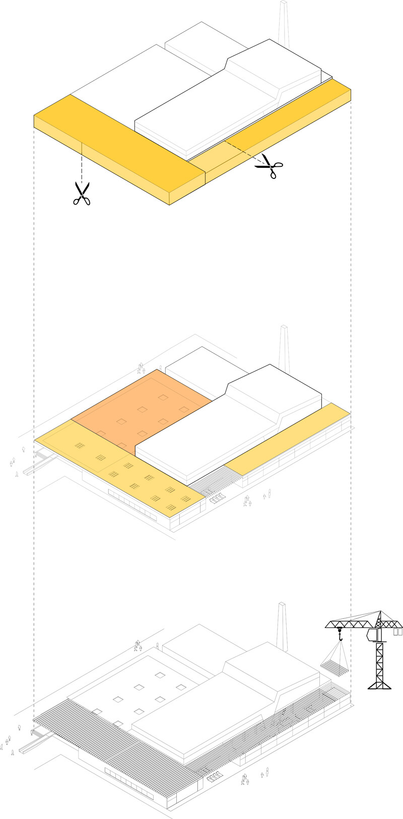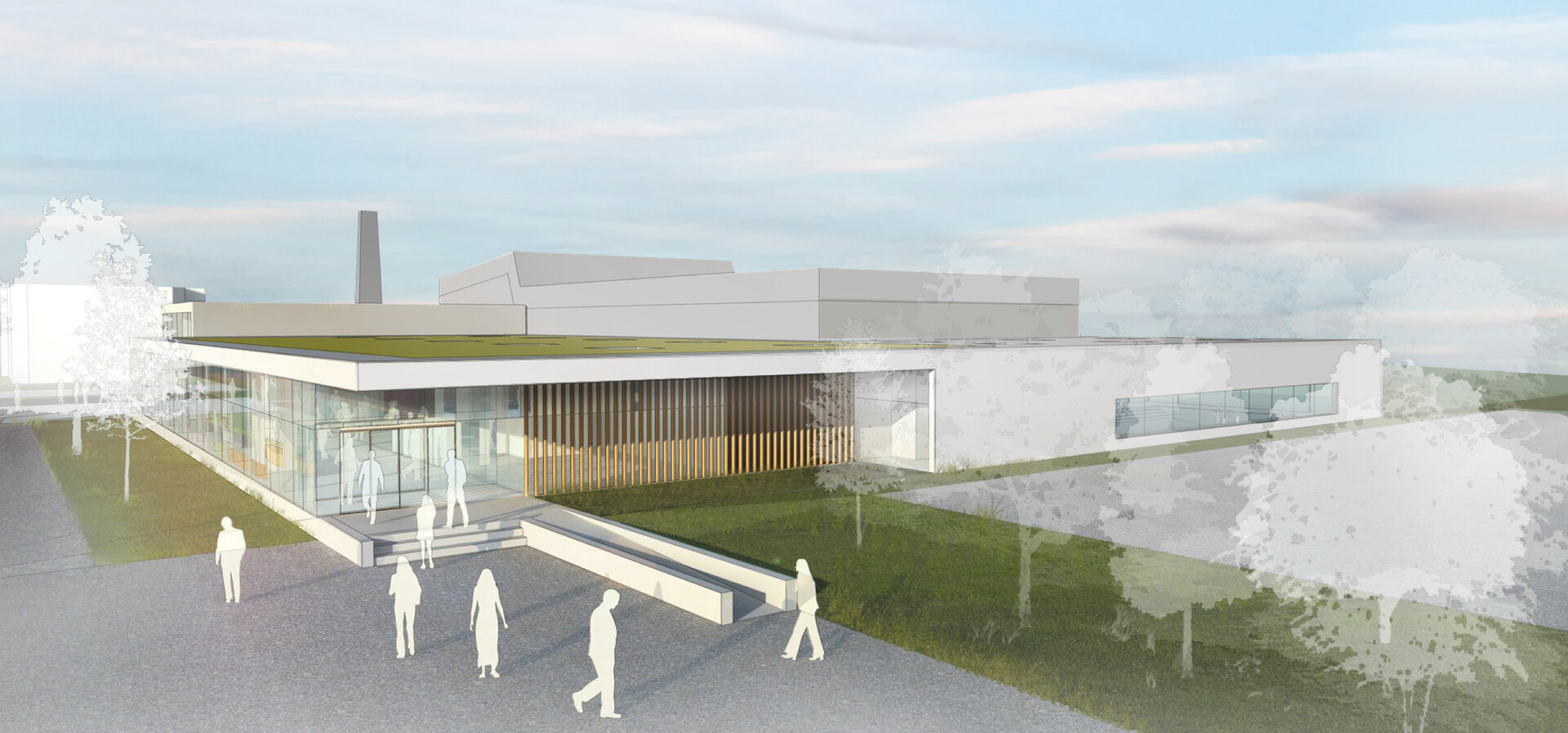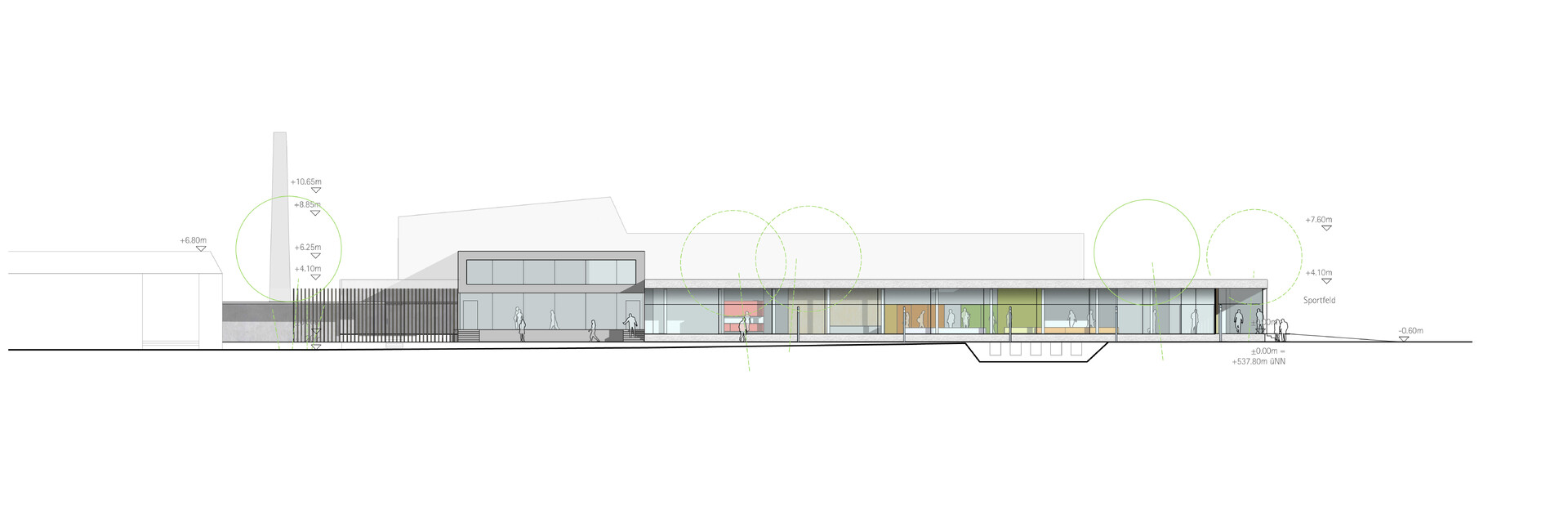 Der dezente, eingeschossige Neubau mit den gewünschten zusätzlichen Funktionsbereichen umgreift den zum Teil zweigeschossigen Bestand von drei Seiten. Der neue Eingang an gewohnter Stelle lädt durch die großzügige Verglasung die Besucher ein und führt sie vorbei an der Kasse zu den bestehenden Umkleiden und der Bestands-Badehalle. Über den separaten Zugangs-, Umkleide- und Sanitärbereich gelangt der Badegast in die südwestlich gelegene, neue Badehalle mit dem Lehrschwimmbecken. Der Eltern-Kind-Bereich und die Sauna mit Ruhebereich liegen im Süd-Osten und sind dem grünen Garten zugeordnet. Die funktionale Trennung der einzelnen Bereiche erfolgt durch semitransparenten Sichtschutz, Glaswände und textile Vorhänge. Ein geschützter Außenbereich im Gebäuderücksprung verlängert die Nutzungszeit der Außenanlagen.
