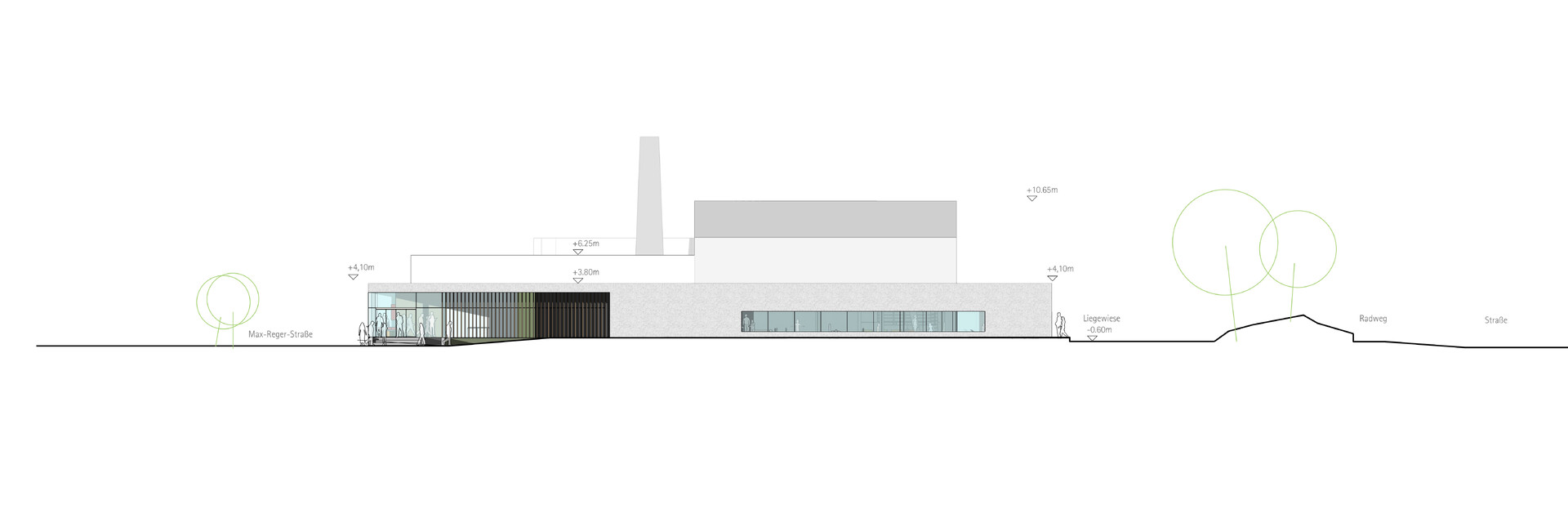 Die bestehende Badehalle bleibt in ihrem Ursprung erhalten und wird in Teilen saniert. Ein Neubau ergänzt den Bestand winkelartig im Westen und Süden. Der Eingang besteht weiterhin von Nord-Westen über die Max-Reger-Straße. Der Besucher erreicht das Bad über eine großzügige Treppe sowie barrierefrei über eine Rampe. In direkter Nähe befinden sich die Parkplätze für Menschen mit Behinderung.