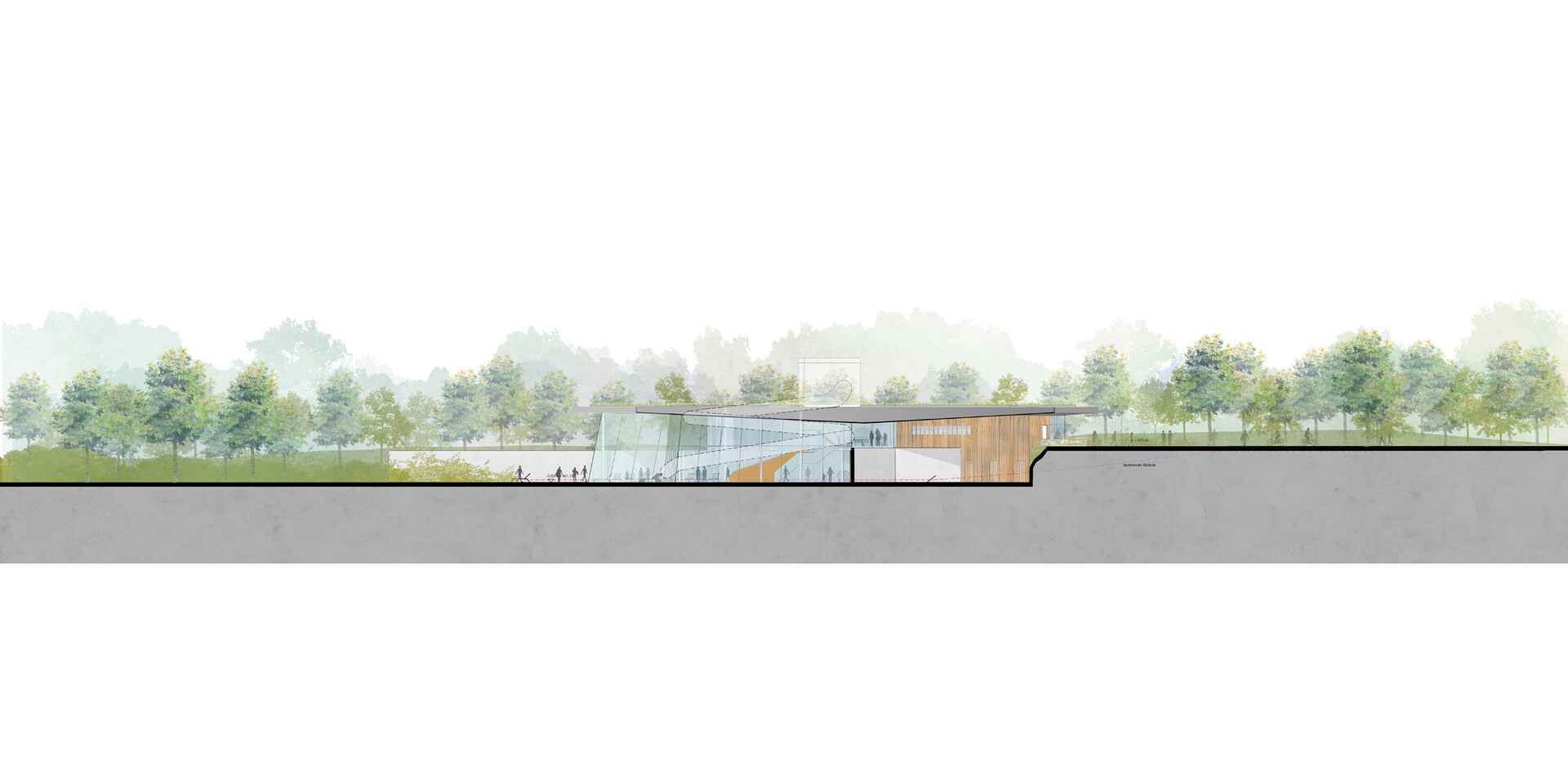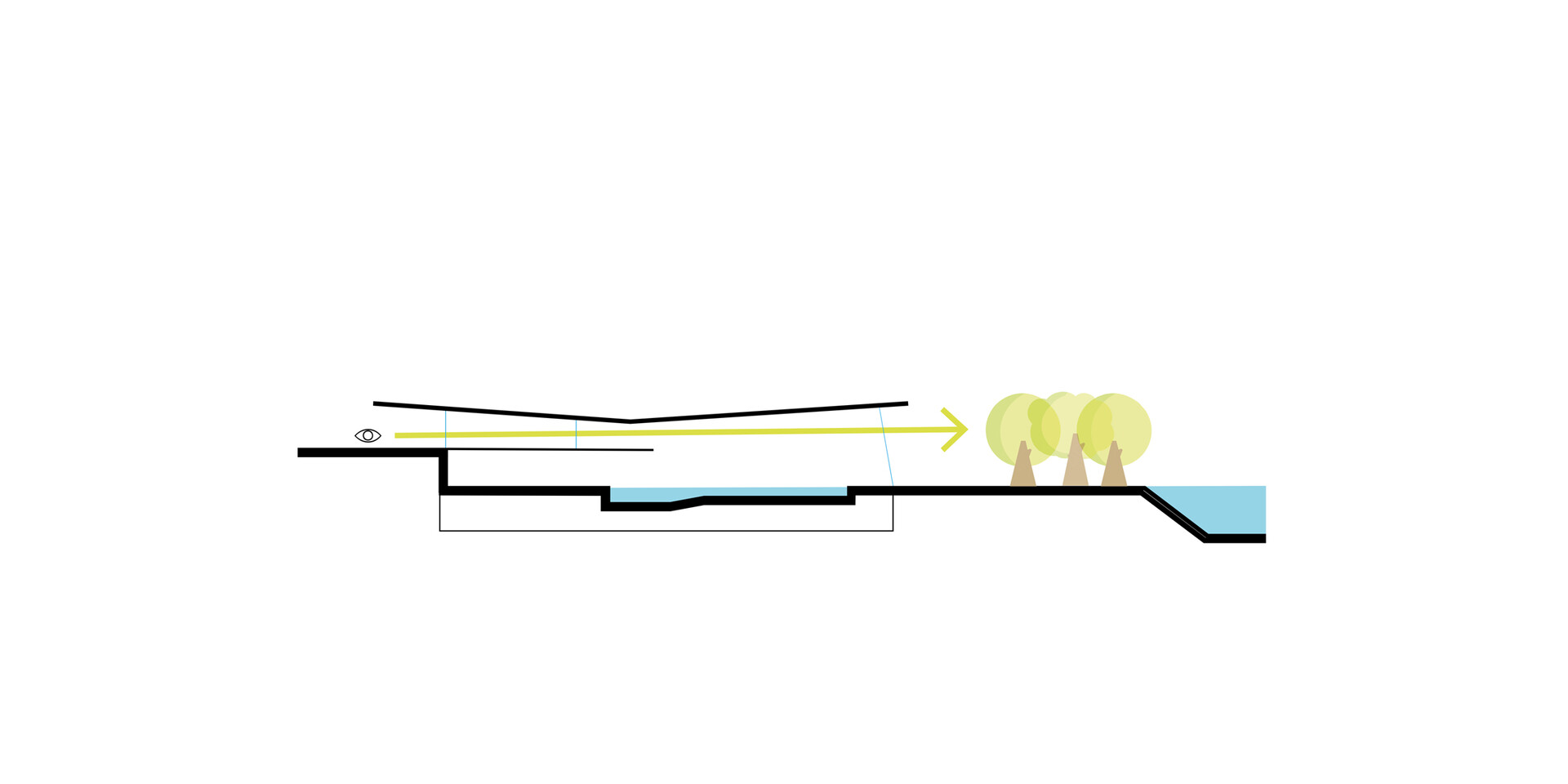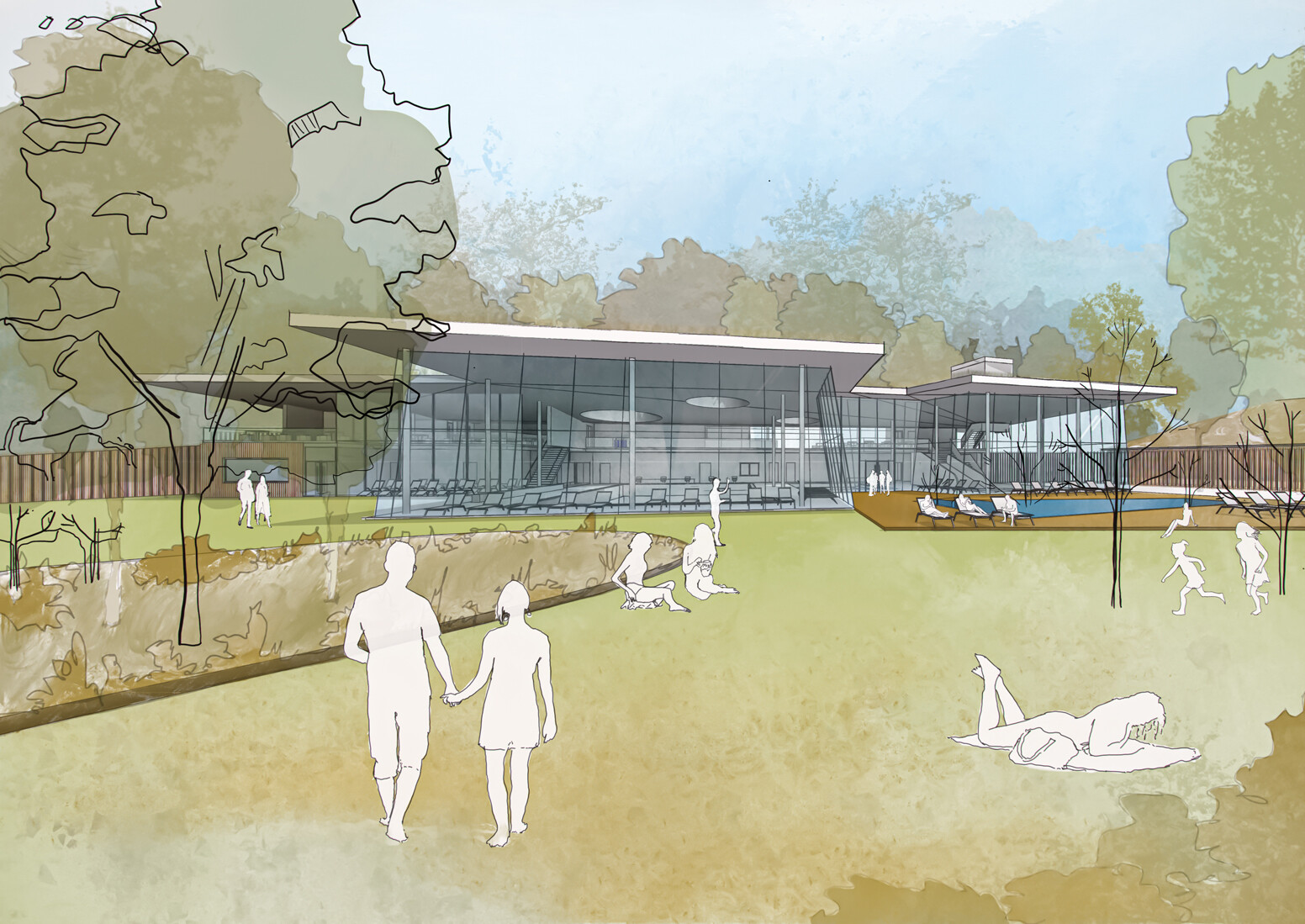 Im Untergeschoss erstreckt sich Richtung Süden eine qualitätsvolle und facettenreiche Außenraumgestaltung. Die Sauna und die Bad-Außenanlagen werden von einem Vegetationssaum und einem lichten Hain zur Umgebung abgeschirmt um Sicht- und Lärmschutz zu gewährleisten. Dabei wird das prägende Bild der wertvollen Bestandsbäume durch gezielte Ergänzungen sensibel in die Neugestaltung integriert. Sauna und Badbereich werden durch Vegetation und Sichtschutz räumlich voneinander separiert und bilden, der Nutzung entsprechend, unterschiedliche Raumthemen aus. Der Saunagarten erzeugt durch die Proportionen und den Bewuchs einen schützenden Charakter, der Wandelgang zwischen Terrasse und Außensauna ermöglicht Kontemplation bei ruhiger Bewegung. Auf dem Dach der Außensauna entsteht eine Liegegalerie mit visuellem Bezug zum angrenzenden Gewässer. Die Badelandschaft bietet ein großzügiges Angebot zur Freien Aneignung und zur Aktivität, südlich der Liegewiese werden die Freianlagen durch ein Beach-Sportfeld ergänzt, wodurch neue Nutzungen und Qualitäten integriert werden. Das Außenbecken wird von einer Großzügigen Badeplatte für Sonnenschirme und Liegen eingefasst. Durch eine entsprechende Geländemodellierung wird eine fließende Landschaft mit leichtem Gefälle Richtung Süden ermöglicht.