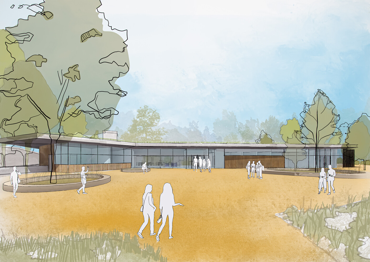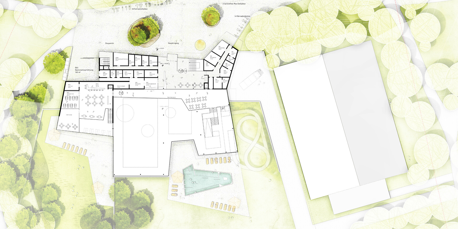 Über den großzügigen Vorplatz werden die Besucher barrierefrei zum Haupteingang geführt. Ein spannungsvoller und zugleich gut überschaubarer Freiraum bildet den Auftakt, der das Gebäude selbstbewusst inszeniert. Über den künftigen Vorplatz erfolgt die Anbindung an die bestehenden Wegestrukturen in Ost-West-Richtung und die erweiterte Stellplatzgruppe nordöstlich der Sporthalle. Von der Zufahrt Krankenhausstraße bis zum Haupteingang erstreckt sich ein „Teppich“ aus homogenem Belag bis an das Foyer, die radialen Formen mit Vegetations- und Sitzinseln bilden das Entrée und einen Treffpunkt im Außenraum. Entlang der nördlichen Platzkante entsteht eine angemessene Anzahl an Stellplätzen für Fahrräder und die erforderlichen barrierefreien Pkw-Stellplätze in Eingangsnähe. Im nord-westlichen Bereich bildet der Vorplatz einen fließenden Übergang zu Gastro-Anlieferzone. Entlang der bestehenden Sporthalle erfolgt ungestört die Zufahrt zum Werk- und Anlieferhof im UG-Bereich an der Ostseite. Vorplatz, Saunaterrasse und die Einfassung des Außenbeckens nehmen die Formsprache der Kubatur auf und werden so zur freiräumlichen Erweiterung des Hallenbads.