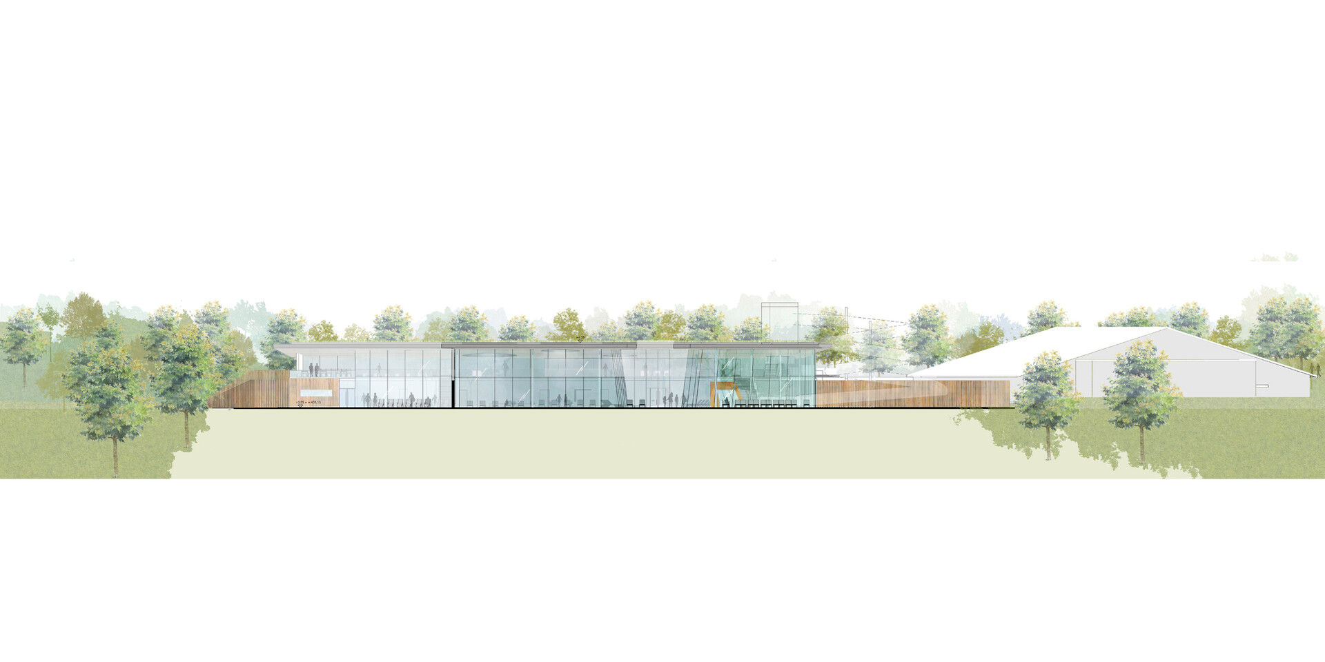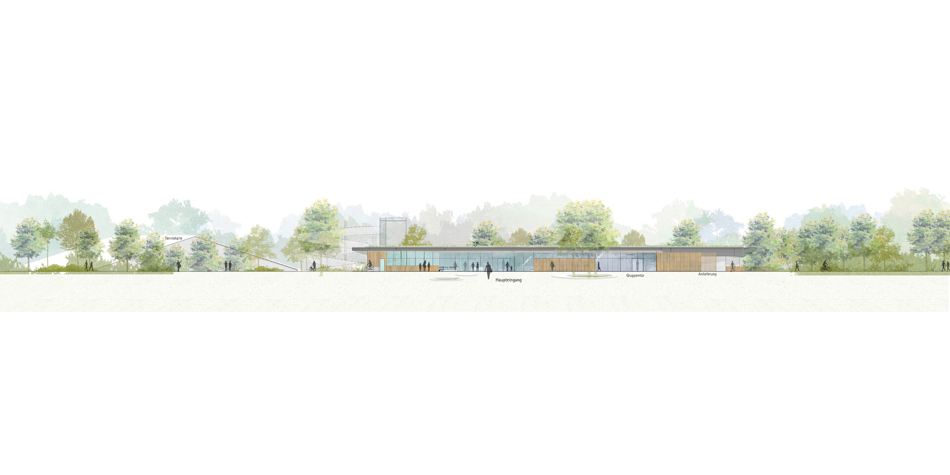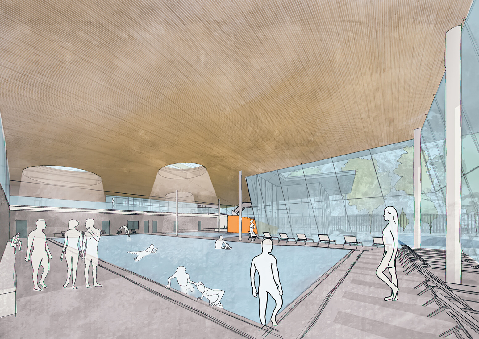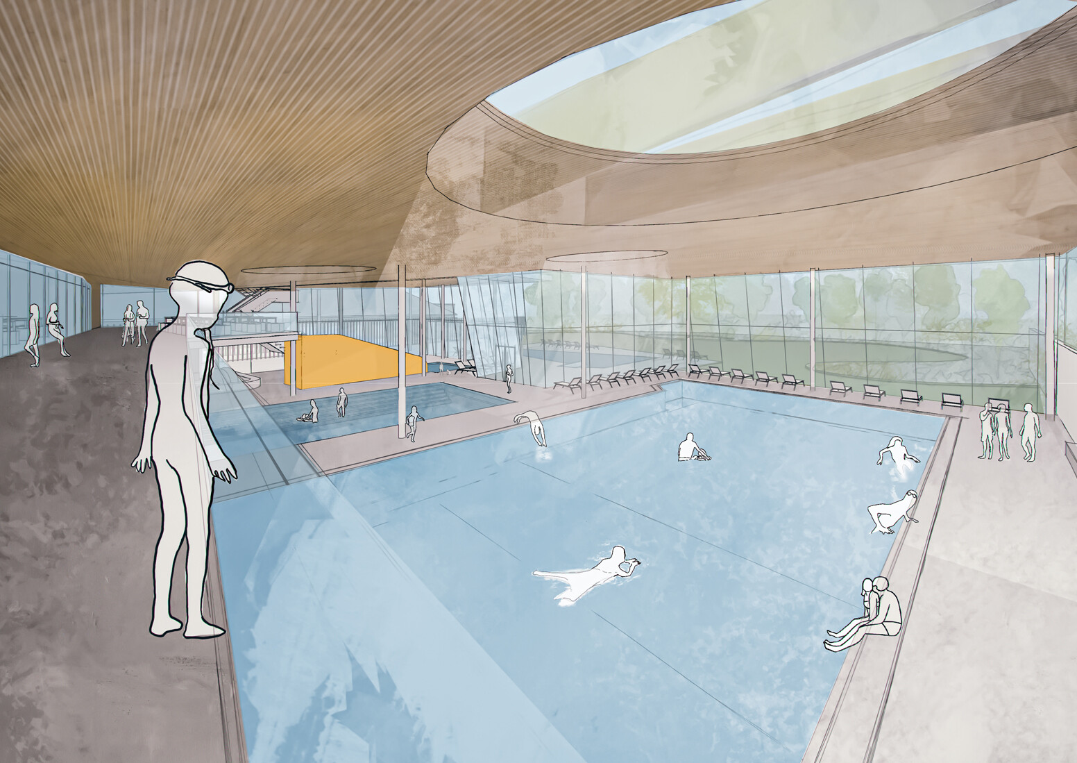 Das neue Hallenbad liegt eingebettet in die naturbelassene Parkanlage „Rieser Sportpark“ mit altem Baumbestand und See. In dieser besonderen Umgebung bietet der Neubau die Möglichkeit, einen qualitätsvollen Standort mit hoher Adressbildung zu entwickeln. Das vorhandene Wegenetz wird beibehalten und auf dem großzügig gestalteten Vorplatz im Norden zusammengeführt. Dieser empfängt als Treffpunkt die Badegäste, Schüler und Sportler und leitet diese in das Eingangsfoyer. Von weitem sichtbar schwebt ein freies Dach über der Landschaft, verzahnt das Innere des Bades mit der Parklandschaft und öffnet sich nach Süden. Schon im Foyer liegt der Blick für Besucher auf die Badehalle und die Außenbereiche bis hin zum See frei. Das Bad ist als offenes Haus konzipiert und dabei funktional, klar und wirtschaftlich gegliedert. Im Foyer dient die Empfangstheke gleichzeitig als Ausgabe für den Bistro- und Aufenthaltsbereich. Direkt angegliedert sind die Funktionsräume wie die Verwaltung, öffentliche WCs und die Küche mit Nebenräumen. Eine freie Treppe führt hinab zu den Umkleidebereichen und Sammelumkleiden für Schüler/innen. Über die Sanitärspange erschließt sich die lichtdurchflutete Badehalle mit 25m Schwimmerbecken und Kursbecken . Eine raumhohe Glasfassade öffnet sich nach Süden zur Liegewiese. Der Kinderbereich mit atmosphärischer, kindergerechter Ausstattung liegt geschützt unter der Galerie. Davor ist eine kleine Breitrutsche angeordnet. In diesem Bereich kann im Osten optional eine Rutschenanlage für Jugendliche angebaut werden; im Westen als weiterer Bauabschnitt ein Saunabereich.