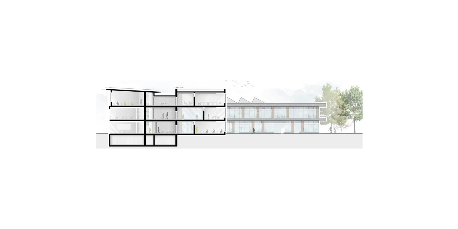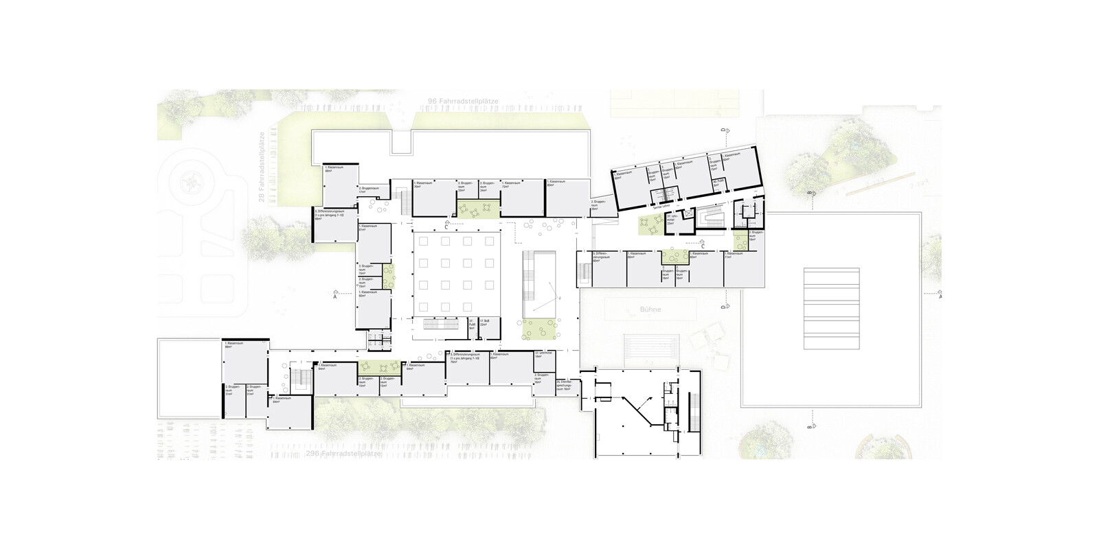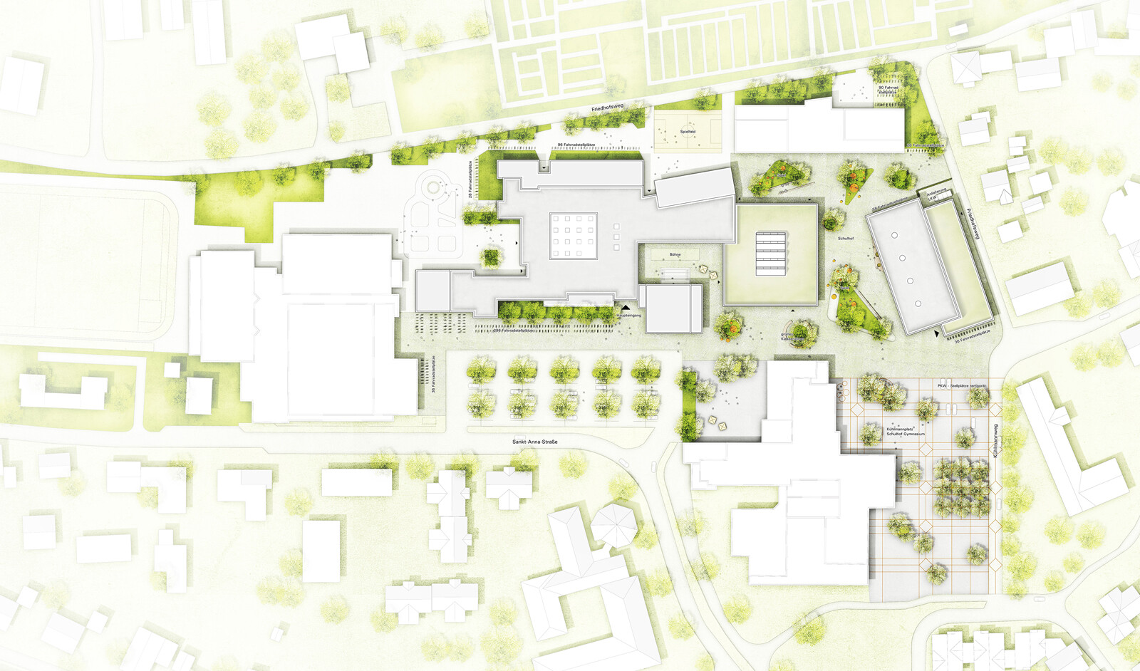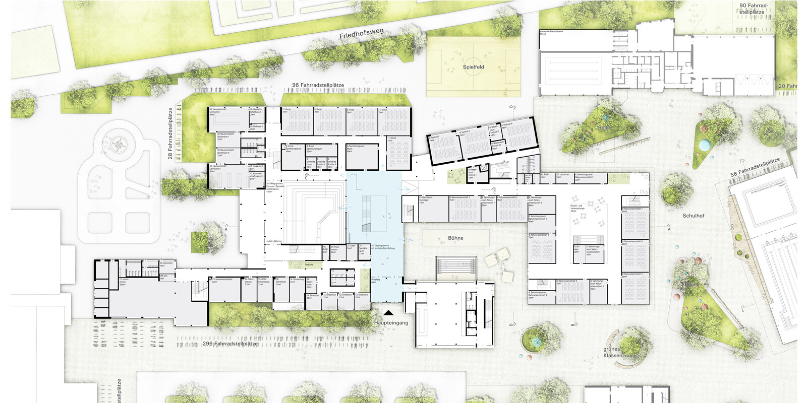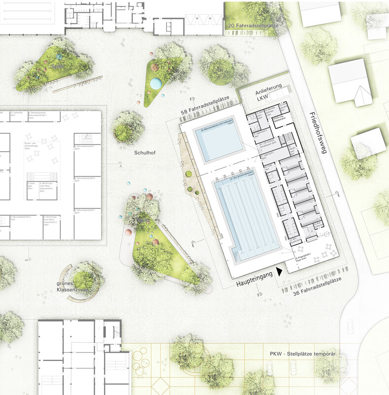 Auf dem Gelände des Konrad-Adenauer-Schulzentrums, das mit seinen Schulen, den Sporteinrichtungen und dem Kühlmannplatz einen wichtigen Bestandteil der Ortsmitte bildet, soll eine neue Gesamtschule und ein Schwimmbad entstehen. Ziel war es, trotz der heterogenen Bestandsbebauung mit den Um- und Neubauten eine übersichtliche Gesamtanlage mit möglichst kurzen Wegen und einer zentralen Erschließung zu schaffen. Der Entwurf für den Schulneubau fügt sich einerseits in die architektonische Struktur der Gesamtanlage ein und behauptet sich andererseits als neuer Klassentrakt. Ähnlich der Struktur des Bestandsgebäudes erhält der Neubau ein Atrium, um das sich die Klassenräume gruppieren. Über einen Verbindungsbau ist der Neubau an den Bestand angebunden. Die ehemalige Realschule und die Werkräume der Hauptschule, die teilweise ohne Tageslicht sind, werden zurückgebaut. Alle übrigen Bereiche der Schule einschließlich des Verbindungsbaus bleiben erhalten und werden für die neue Nutzung ertüchtigt. Die Hauptschule wird im Bereich der ehemaligen Werkräume aufgestockt und erweitert. In dem Verbindungsbau sind über drei Geschosse Klassenräume unter gebracht. Der Neubau gliedert sich mit seiner Zweigeschossigkeit gut in die umgebende Bebauung ein und vermittelt zwischen dem 3-geschossigem Bestandsgebäude und der Schwimmhalle. Die Gebäudehöhen nehmen zur Straße und zur Umgebungsbebauung hin ab. Das Schwimmbad als Solitär nimmt die Flucht der Straße auf und öffnet sich zum Schulhof und zum Kühlmannplatz. Zwischen Schwimmbad und Schule entsteht eine gut proportionierte Platzfläche, die die Freibereiche der Schule miteinander verbindet.