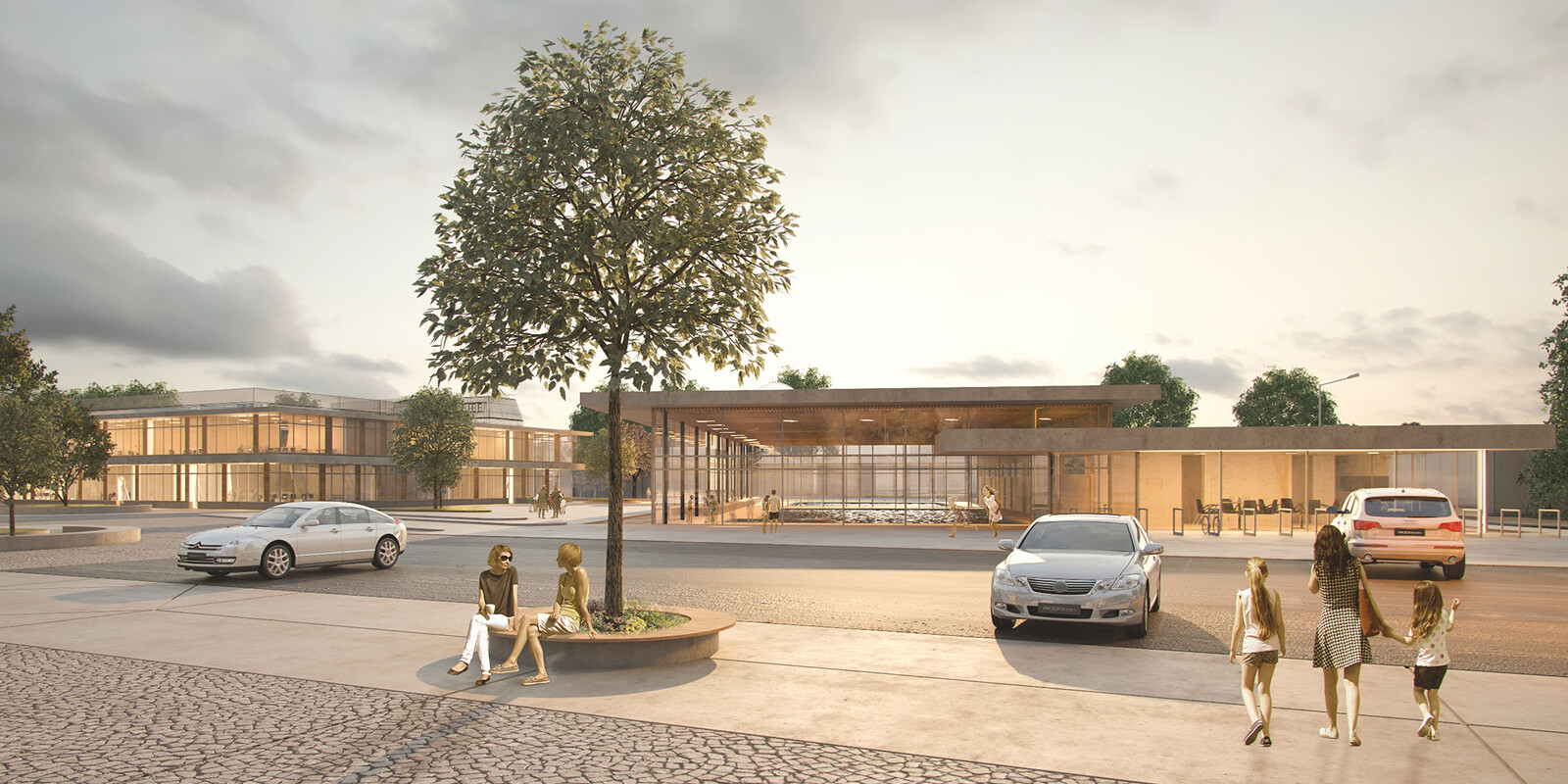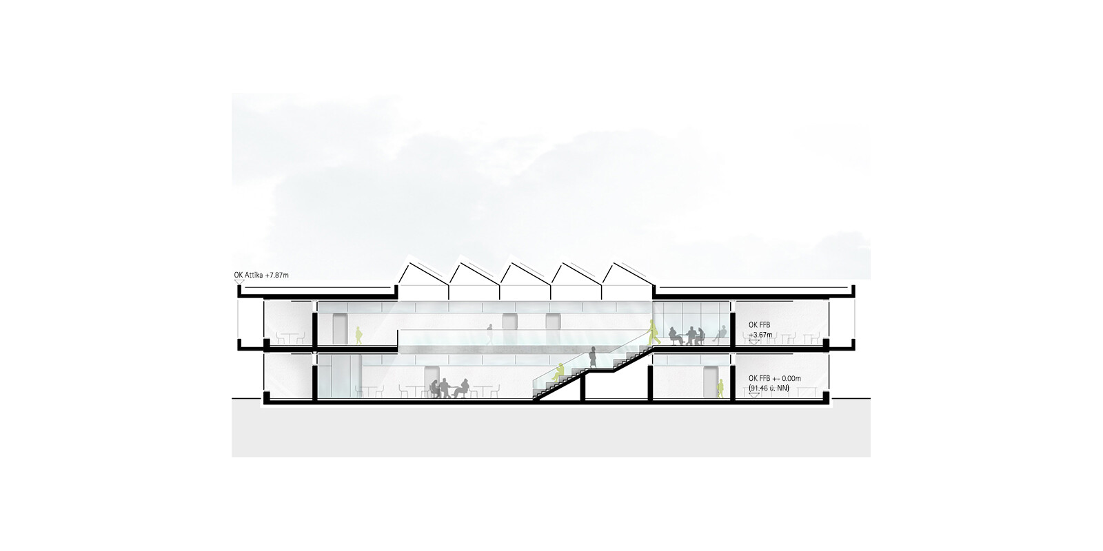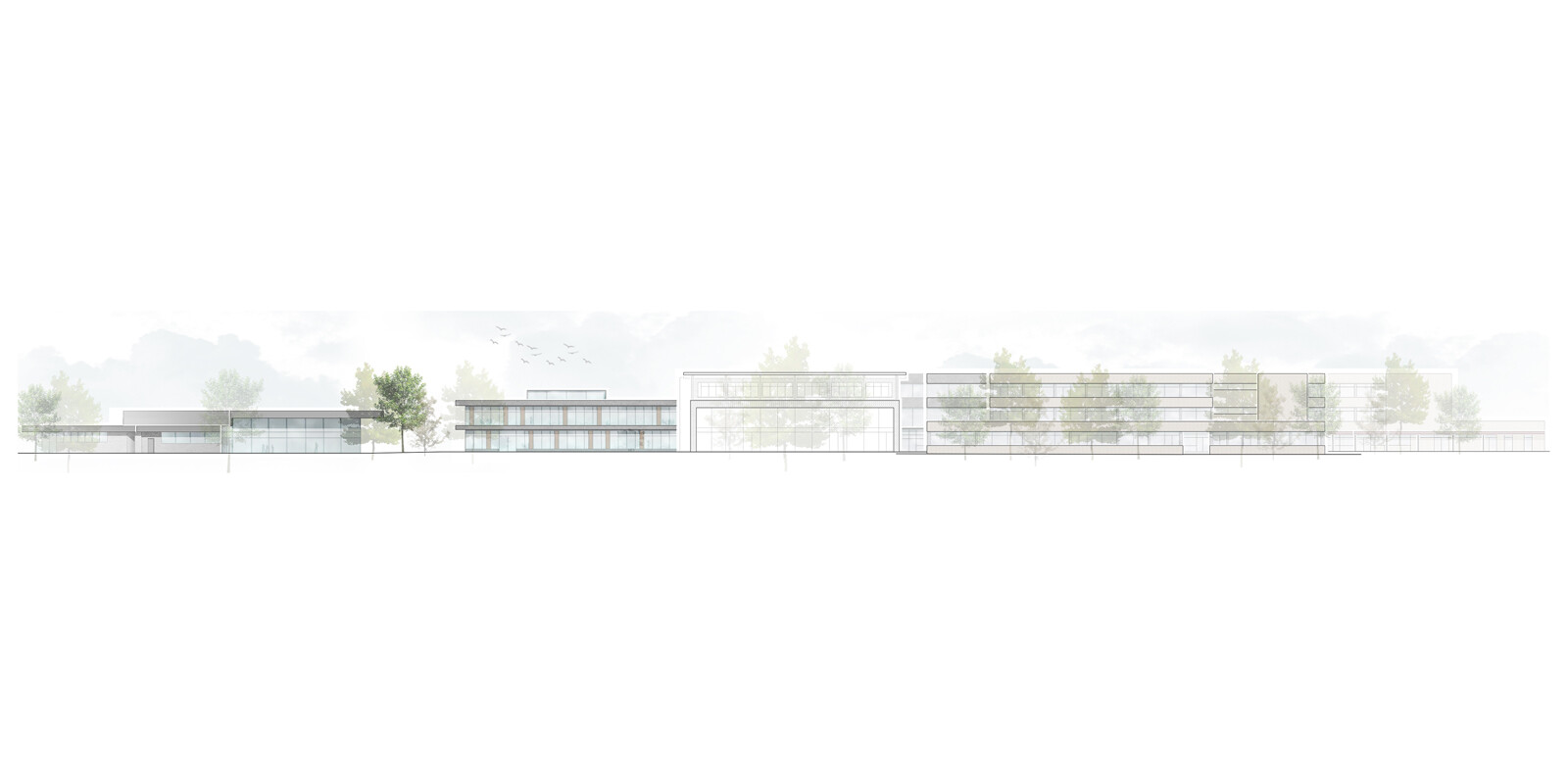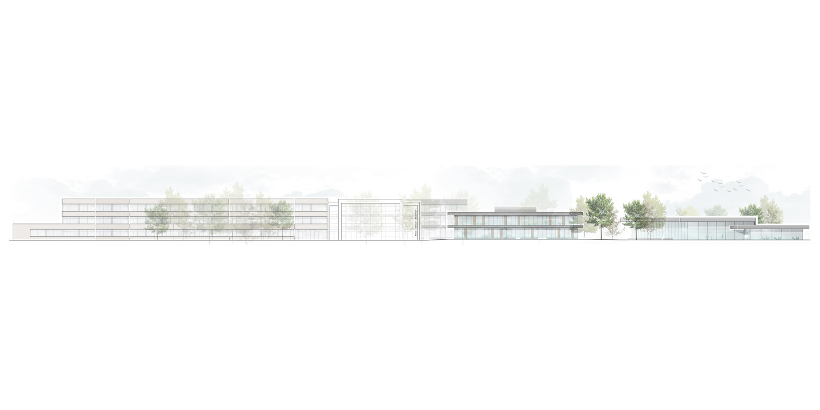 Auf dem Gelände des Konrad-Adenauer-Schulzentrums, das mit seinen Schulen, den Sporteinrichtungen und dem Kühlmannplatz einen wichtigen Bestandteil der Ortsmitte bildet, soll eine neue Gesamtschule und ein Schwimmbad entstehen. Ziel war es, trotz der heterogenen Bestandsbebauung mit den Um- und Neubauten eine übersichtliche Gesamtanlage mit möglichst kurzen Wegen und einer zentralen Erschließung zu schaffen. Der Entwurf für den Schulneubau fügt sich einerseits in die architektonische Struktur der Gesamtanlage ein und behauptet sich andererseits als neuer Klassentrakt. Ähnlich der Struktur des Bestandsgebäudes erhält der Neubau ein Atrium, um das sich die Klassenräume gruppieren. Über einen Verbindungsbau ist der Neubau an den Bestand angebunden. Die ehemalige Realschule und die Werkräume der Hauptschule, die teilweise ohne Tageslicht sind, werden zurückgebaut. Alle übrigen Bereiche der Schule einschließlich des Verbindungsbaus bleiben erhalten und werden für die neue Nutzung ertüchtigt. Die Hauptschule wird im Bereich der ehemaligen Werkräume aufgestockt und erweitert. In dem Verbindungsbau sind über drei Geschosse Klassenräume unter gebracht. Der Neubau gliedert sich mit seiner Zweigeschossigkeit gut in die umgebende Bebauung ein und vermittelt zwischen dem 3-geschossigem Bestandsgebäude und der Schwimmhalle. Die Gebäudehöhen nehmen zur Straße und zur Umgebungsbebauung hin ab. Das Schwimmbad als Solitär nimmt die Flucht der Straße auf und öffnet sich zum Schulhof und zum Kühlmannplatz. Zwischen Schwimmbad und Schule entsteht eine gut proportionierte Platzfläche, die die Freibereiche der Schule miteinander verbindet.