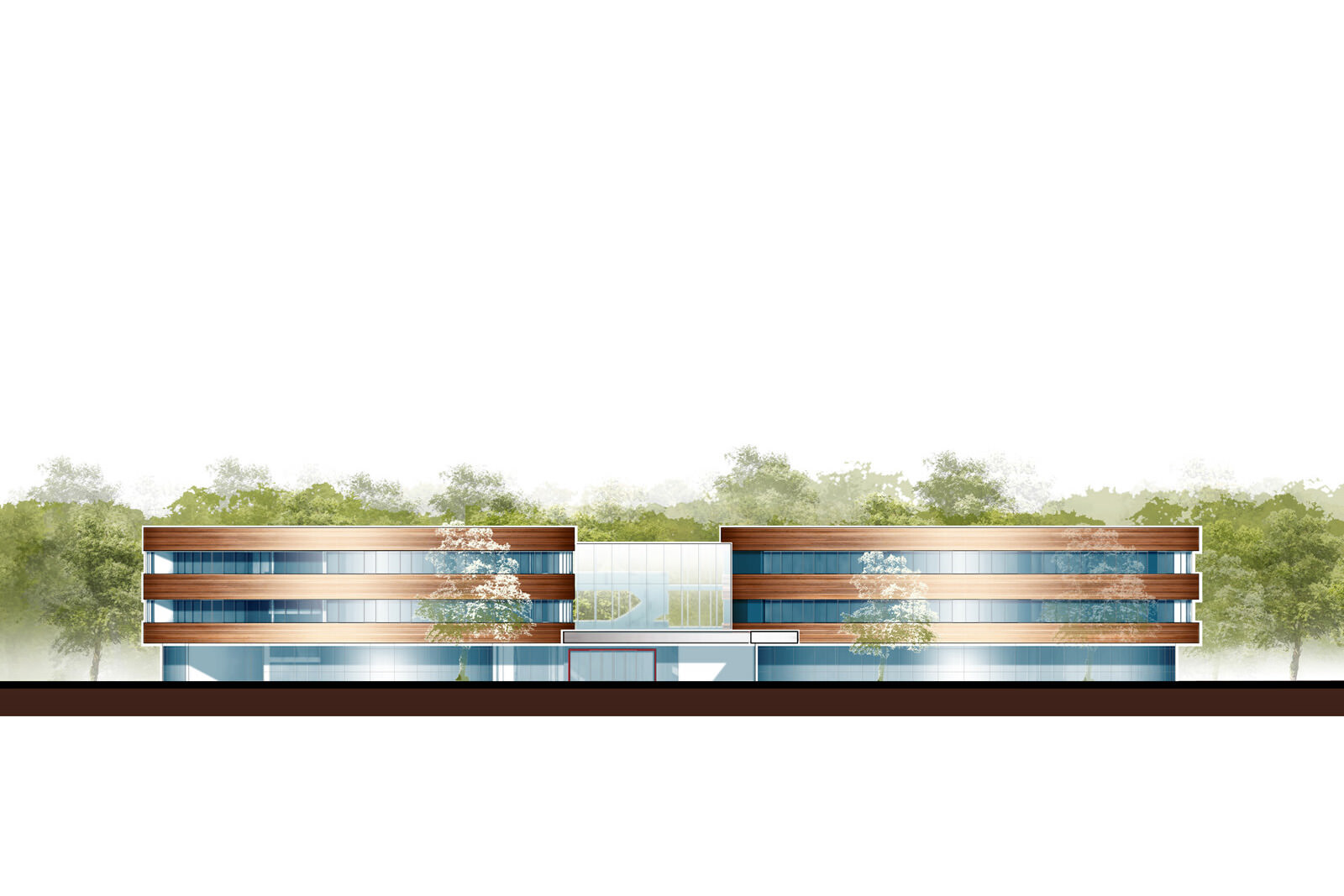 Der außergewöhnliche Ort der Hessenwaldschule in einer natürlichen Waldlichtung sowie die Idee des kooperativen Miteinanders an einem Standort bilden die Grundlage für eine offene, freie, großzügige Lernlandschaft, die in sehr natürlicher Weise in die Umgebung eingebettet ist. Drei pavillonartige Häuser für die einzelnen Jahrgangsbereiche sind durch ein zentrales Atrium verbunden. Durch die Anordnung der Häuser und der freien Ausformung entstehen vielseitige Innen– und Außenbeziehungen. Die gewählte ovale Form der drei Pavillons schafft zum Einen eine geborgene Atmosphäre im Inneren, zum Anderen die Öffnung und Verzahnung mit der Landschaft. Dies ermöglicht eine Vielfalt von Arbeitsmöglichkeiten innerhalb und außerhalb der Klassenräume für Schüler und Lehrer. Eine Kombination aus bewegter Topographie, dem behutsamen Ergänzen des Baumbestandes sowie ein freies Wegesystem lässt eine Anlage entstehen, die Ruhe und Selbstverständlichkeit ausstrahlt und zum gemeinsamen Lernen, Spielen und Entdecken einlädt.