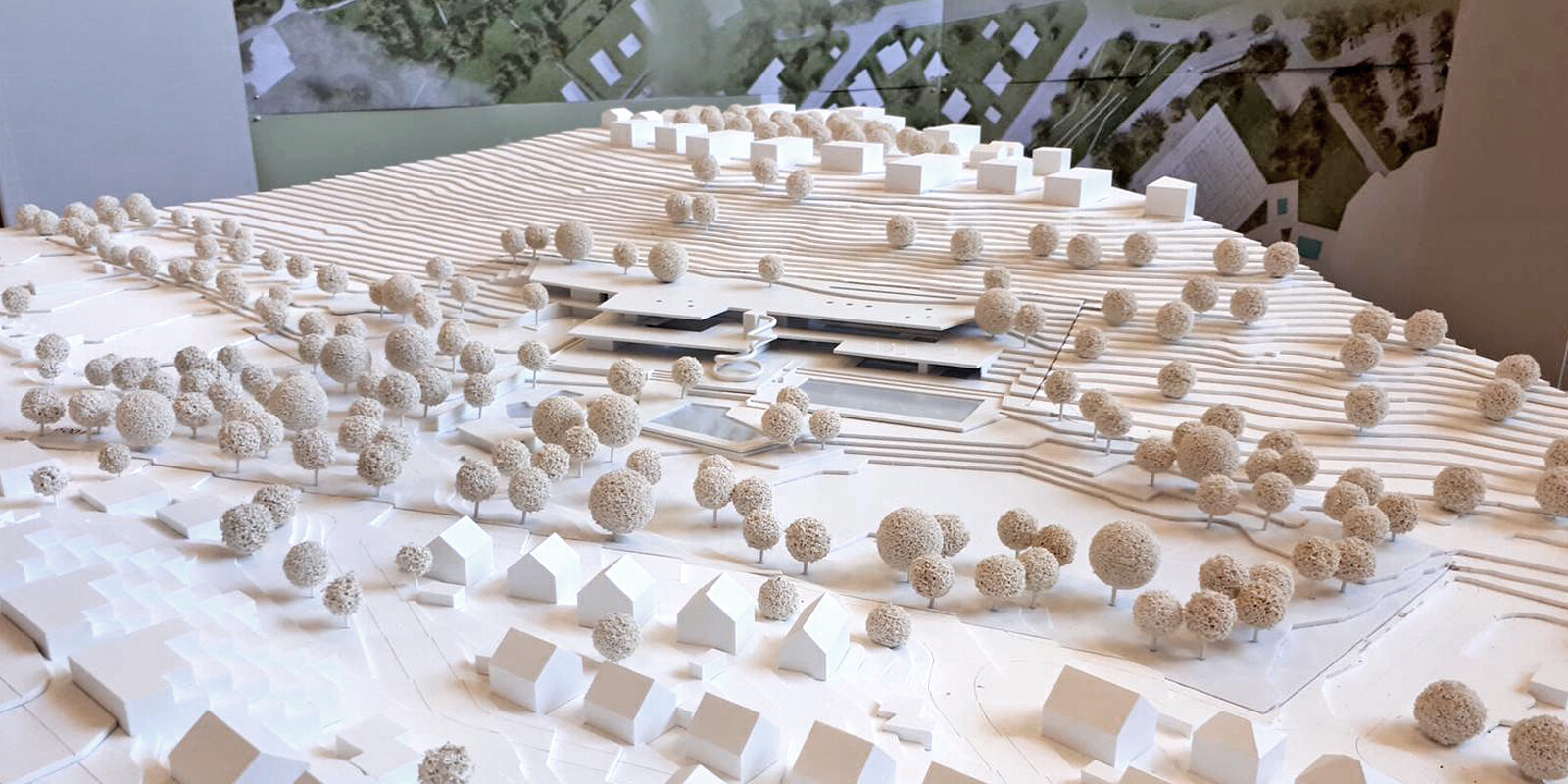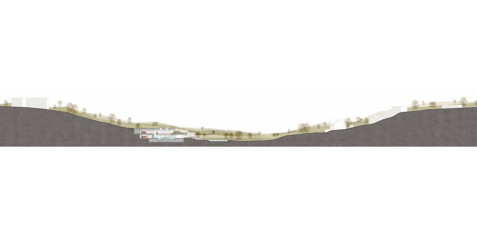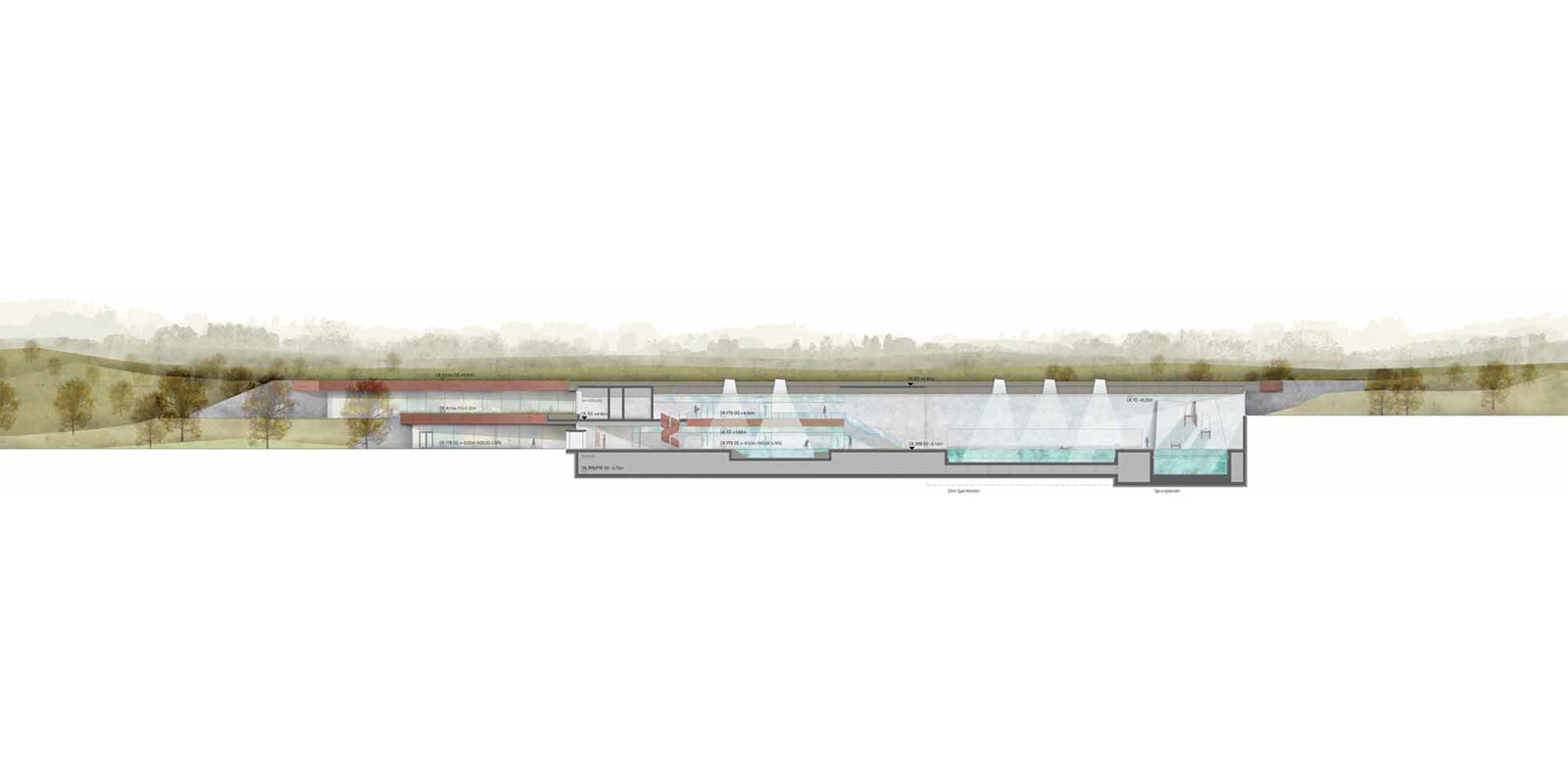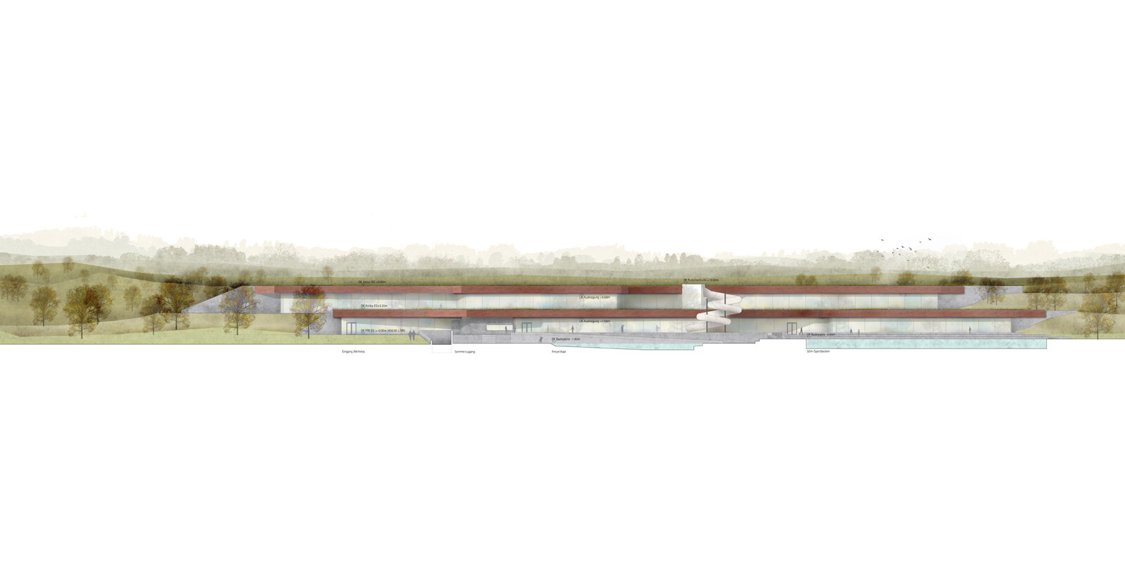 Die besondere landschaftliche Qualität des Hirschbachtals mit seinen nach Norden und Süden ansteigenden, begrünten Hängen, dem wertvollen Baumbestand im Norden des Grundstücks und dem Ausblick auf die Schwäbische Alb nach Südosten bilden die Grundidee für den Entwurf des Kombibads Aalen. Hinzu kommt die Bedeutung des Tals als wichtige Frischluftschneise für die Stadt. Das Gebäude entwickelt sich aus der Topographie heraus und wird – behutsam in den Hang eingefügt – zu einem Teil der Landschaft. Die Geschosse und Dachflächen fließen als begrünte Ebenen mit Terrassen und Einschnitten aus dem Hang heraus und bilden ein zurückhaltendes Gegenüber zur Wohnbebauung im Hirschbachtal, den Terrassenhäusern im Norden des Wettbewerbsgrundstücks.