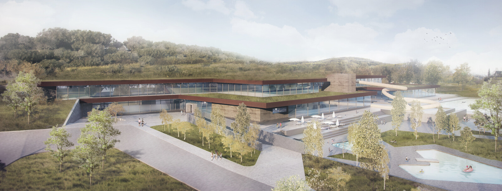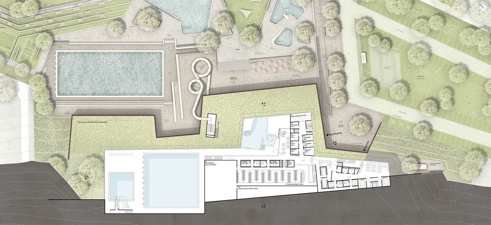 In den Hang eingebettet, tritt das große Bauvolumen für das Bad weitgehend in den Hintergrund. Die Erschließung erfolgt über einem Vorplatz in direkter Nähe zu den Parkflächen. Die Umkleiden sowie ein Teilbereich der Technik werden abgestuft über zwei Geschosse in den Hang eingeschoben und bilden den Rücken des neuen Schwimmbads. Die Badehallen erstrecken sich jeweils über ein und zwei Geschosse. Das Sportbad wird vorwiegend zweigeschossig ausgebildet, um die erforderlichen Höhen im Bereich der Sprunganlagen zu gewährleisten. Davor befindet sich das eingeschossige Lehrschwimmbecken sowie der abtrennbare Kursbereich. Durch die Fugen zwischen den abgestuften Dächern werden die dahinterliegenden Bereiche mit Tageslicht versorgt. Das Freizeitbad folgt dieser Regel. Der Bereich über dem Erlebnisbecken sowie der Galerieebene ist zweigeschossig. Die Liegeflächen, das Kinderplanschbecken, das gläserne Dampfbad und die Aufenthaltsflächen der Gastronomie werden im eingeschossigen Bereich geborgener davor angeordnet.