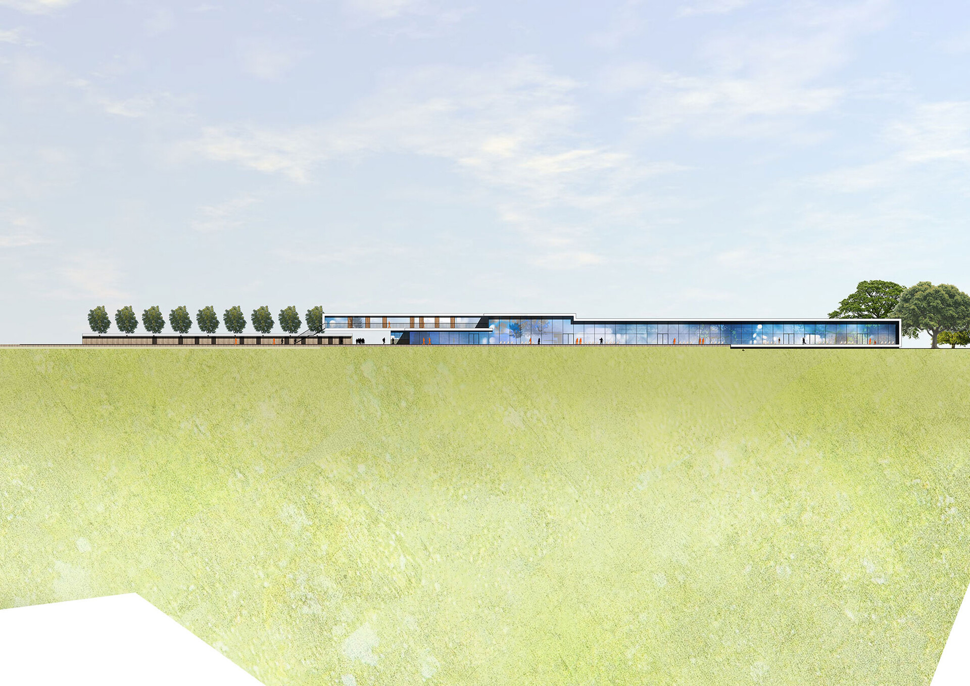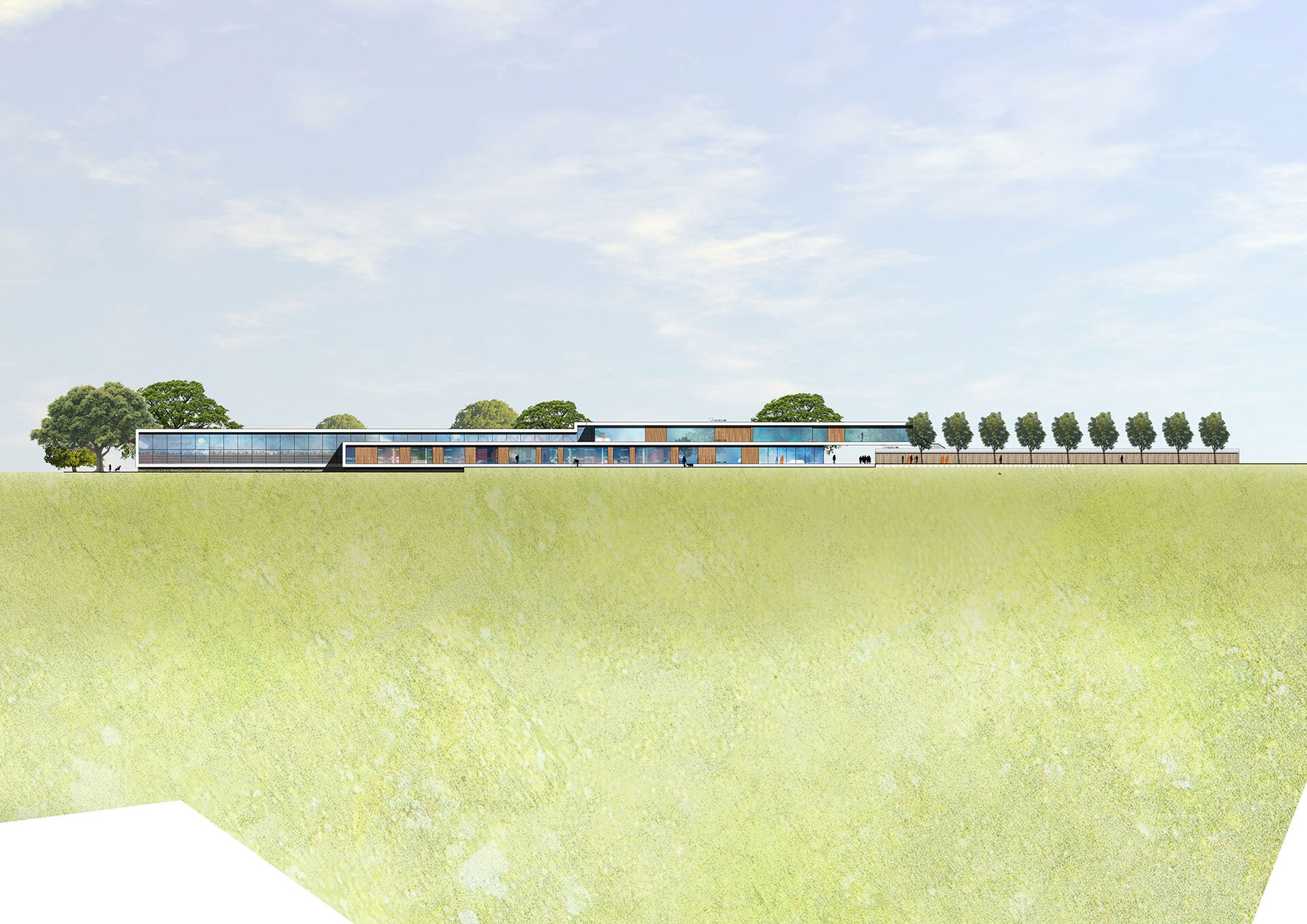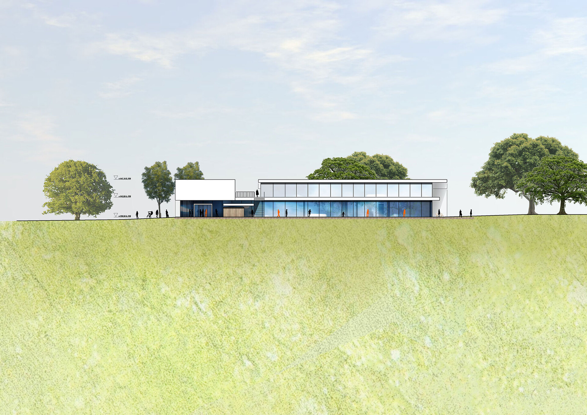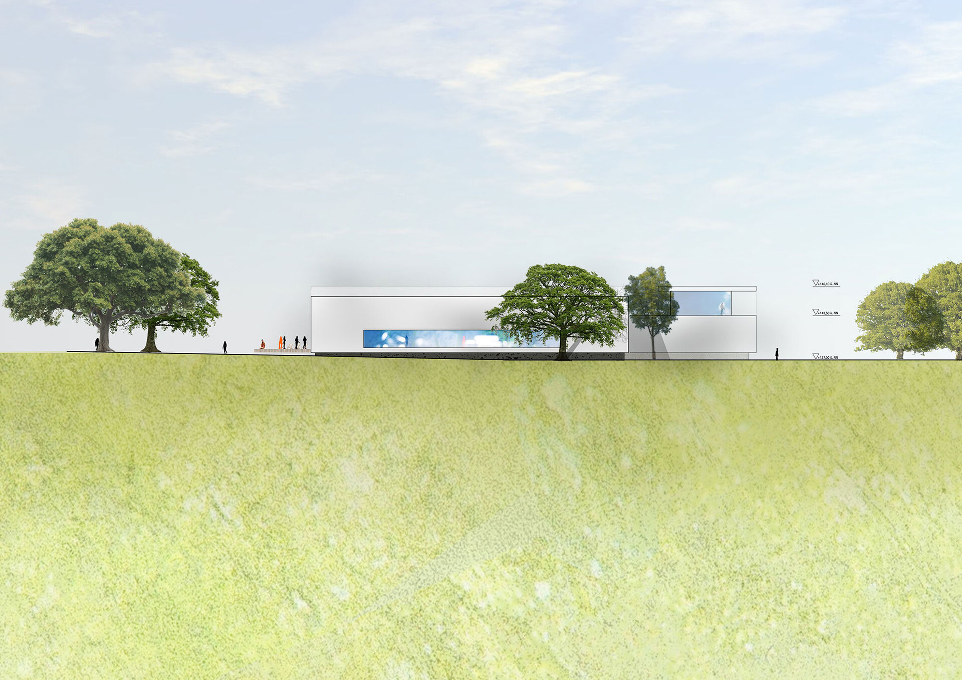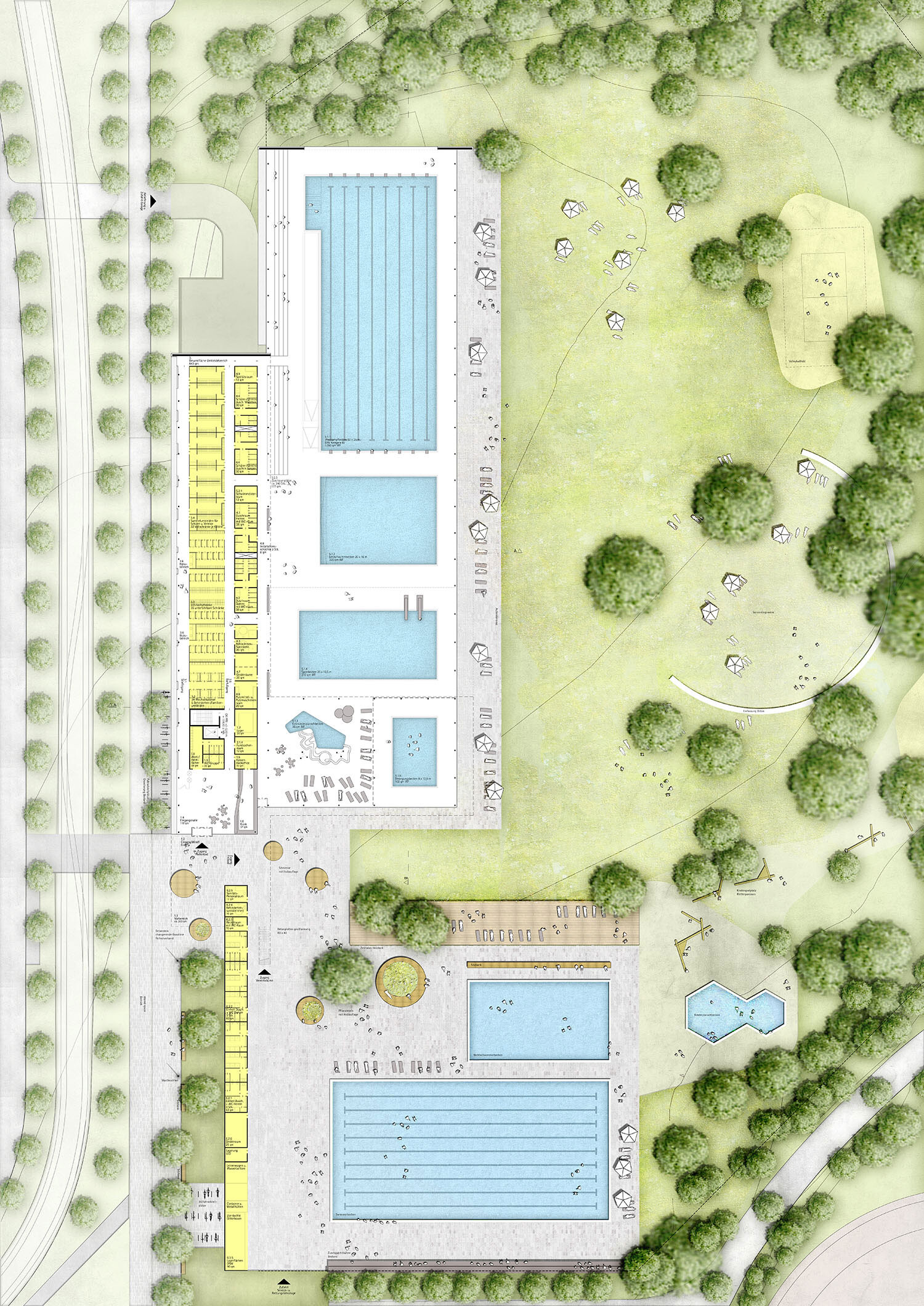 Der Entwurf für das neue Hallenbad unterstreicht die Verbindung des Nordbads zu den benachbarten Sport-Einrichtungen auf der Nord-Süd-Achse und erstreckt sich folgerichtig entlang des Weges Richtung Forum, dem kommunikativen Zentrum des Bürgerparks. Der Neubau gliedert sich in zwei versetzt nebeneinander angeordnete Baukörper, deren längliche Ausdehnung das gesamte Liegewiesenareal von den öffentlichen Verkehrsflächen im Westen trennt und sich zum Grünbereich im Osten öffnet, um die hohe Aufenthaltsqualität der zum Freibad gehörenden Freiflächen zu sichern. Die Architektursprache ist konsequent. Es entstehen zwei parallele Faltungen, die sich von Norden Richtung Süden hin entwickeln und deren weiße Kanten die eingeschlossene Kubatur wie zwei feine Linien rahmen. Dies führt zu einer prägnanten Betonung der langen, sich flach in den Park fügenden Gebäude. Zusammen mit dem Sommersanitärbereich entsteht eine Staffelung, die wesentlich dazu beiträgt, die hohe Baumasse zu gliedern und dadurch behutsam in den Park einzufügen. Das Konzept der Faltung bildet das dynamische, sportliche Geschehen, welches im Inneren stattfindet außen für alle erkennbar ab und stärkt die Identität des neuen Nordbades. Herzstück des neuen Hallenbades ist ein wettkampftaugliches 50-Meter-Becken mit Tribüne. Darüber hinaus sind ein Lehrschwimmbecken, ein Freizeit- und Trainingsbecken mit Sprungturm, ein Planschbecken sowie ein Bewegungsbecken für therapeutische Zwecke vorgesehen. Alle für Badegäste notwendigen Bereiche befinden sich im Erdgeschoss des Neubaus, wodurch eine uneingeschränkte barrierefreie Nutzung der gesamten Anlage gewährleistet wird.