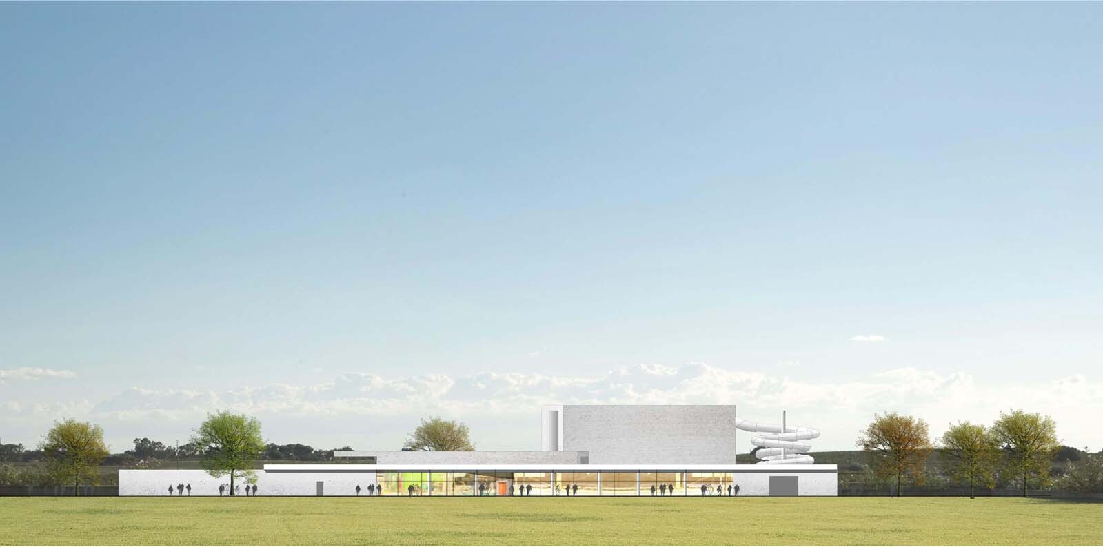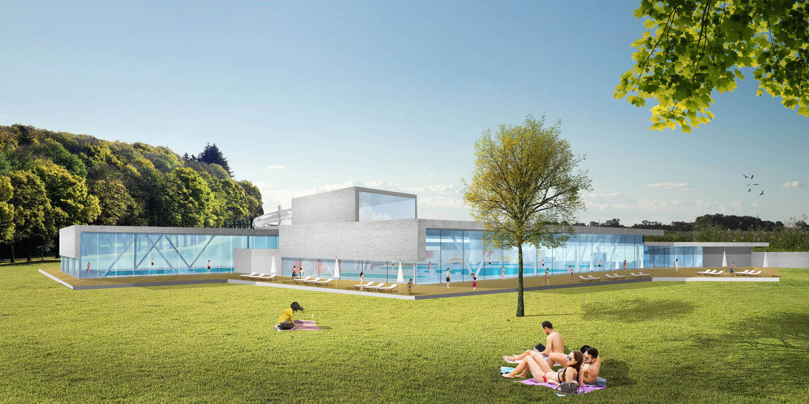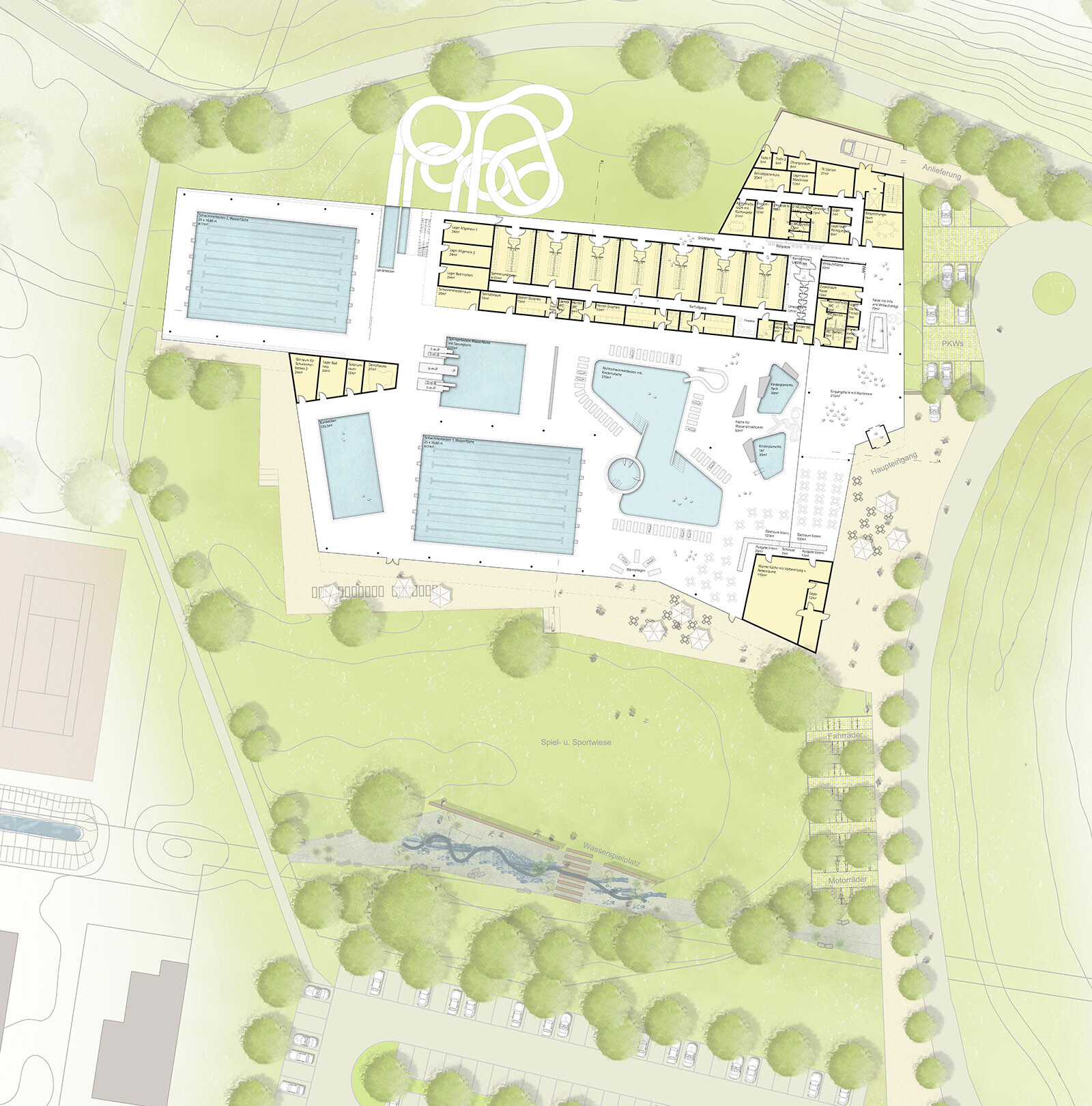 Der Entwurf greift die topografischen Elemente auf - die Lage des Geländes in einer Senke zwischen Urisberg und dem Hügelrücken Wollmatingens - und lässt die Gebäude und Terrassenfläche schollenartig in der Landschaft "schwimmen". Über den großzügigen Eingangsplatz wird diese "Scholle" fest mit den Zugängen verankert. Die Badelandschaft mit ihren verschiedenen Becken befindet sich unter einem großen Dach. Durch das Falten dieser Dachfläche werden die Raumhöhen dem Bedarf angepasst. Die höchsten Raumhöhen haben Rutschen- und Sprungbereich, die Sportbecken erlauben die Nutzung für Wasserball und Umkleide, im Kinder- und Gastronomiebereich sind die Raumhöhen am niedrigsten. Das gefaltete Dach zoniert die einzelnen Bereiche. Der Haupteingangsplatz ist offen gehalten und wird als großzügiger Platz wahrgenommen. Bei schönem Wetter kann die Gastronomie außen bestuhlen. Vom Bad aus gibt es einen starken Sichtbezug in Richtung Süden zum Freigelände. Die breite Terrasse dient als Plateau und lädt in den Sommermonaten zum Liegen, Beobachten und Sonnenbaden ein.