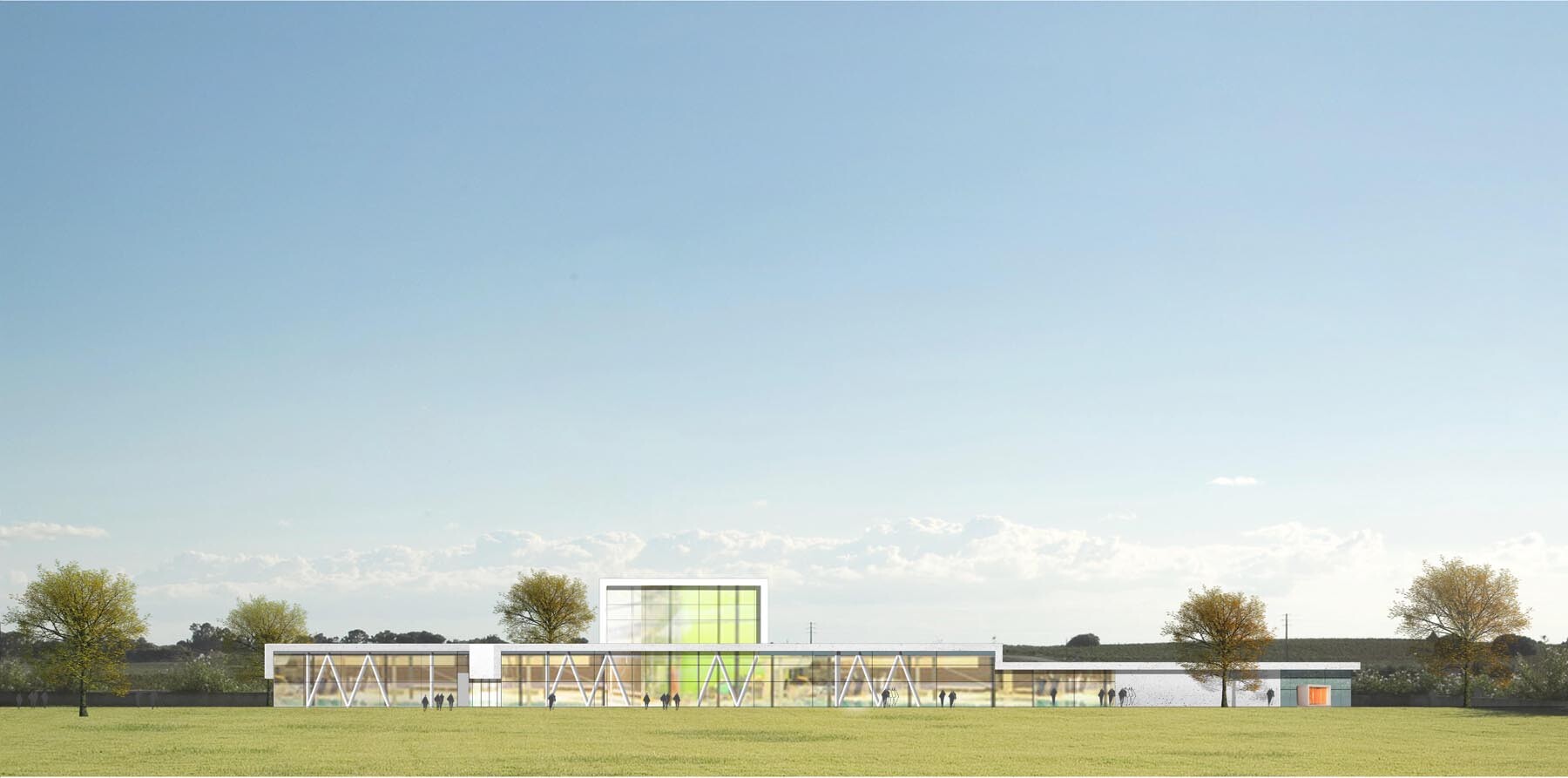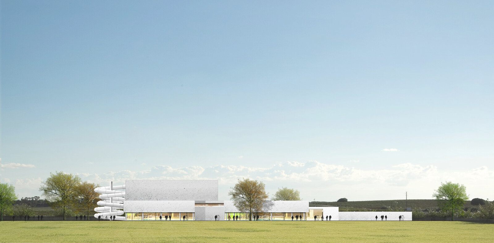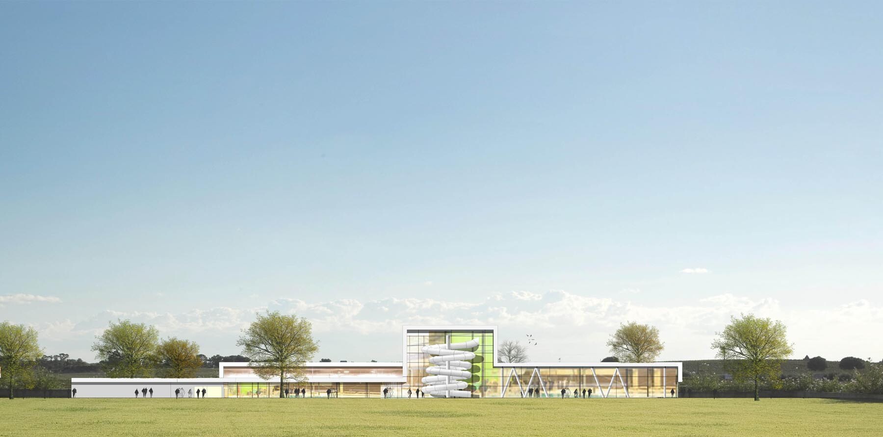 Der Entwurf greift die topografischen Elemente auf - die Lage des Geländes in einer Senke zwischen Urisberg und dem Hügelrücken Wollmatingens - und lässt die Gebäude und Terrassenfläche schollenartig in der Landschaft "schwimmen". Über den großzügigen Eingangsplatz wird diese "Scholle" fest mit den Zugängen verankert. Die Badelandschaft mit ihren verschiedenen Becken befindet sich unter einem großen Dach. Durch das Falten dieser Dachfläche werden die Raumhöhen dem Bedarf angepasst. Die höchsten Raumhöhen haben Rutschen- und Sprungbereich, die Sportbecken erlauben die Nutzung für Wasserball und Umkleide, im Kinder- und Gastronomiebereich sind die Raumhöhen am niedrigsten. Das gefaltete Dach zoniert die einzelnen Bereiche. Der Haupteingangsplatz ist offen gehalten und wird als großzügiger Platz wahrgenommen. Bei schönem Wetter kann die Gastronomie außen bestuhlen. Vom Bad aus gibt es einen starken Sichtbezug in Richtung Süden zum Freigelände. Die breite Terrasse dient als Plateau und lädt in den Sommermonaten zum Liegen, Beobachten und Sonnenbaden ein.