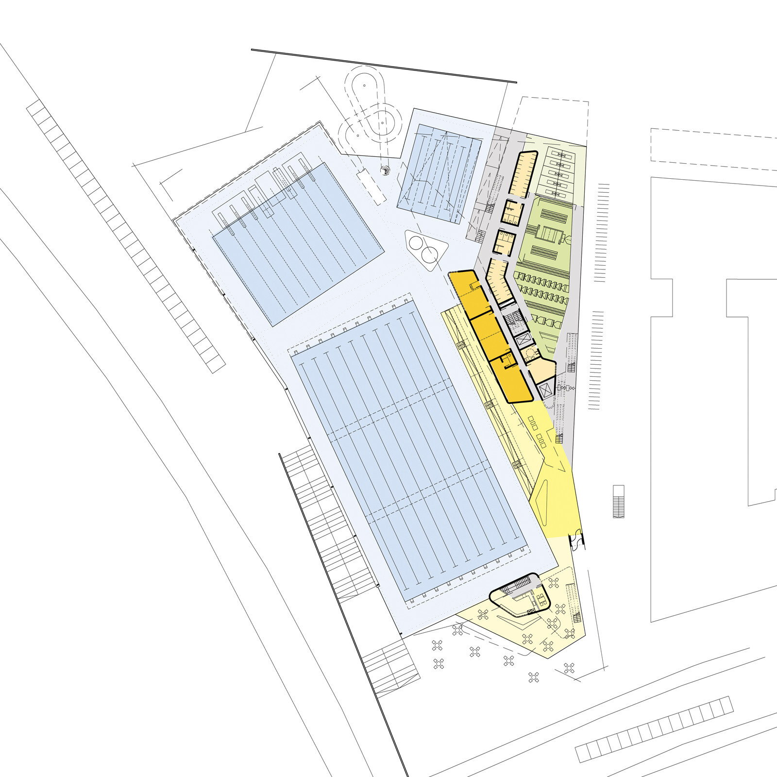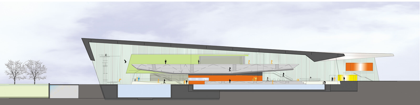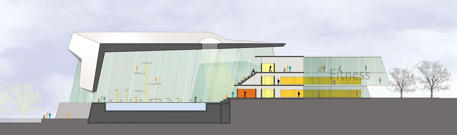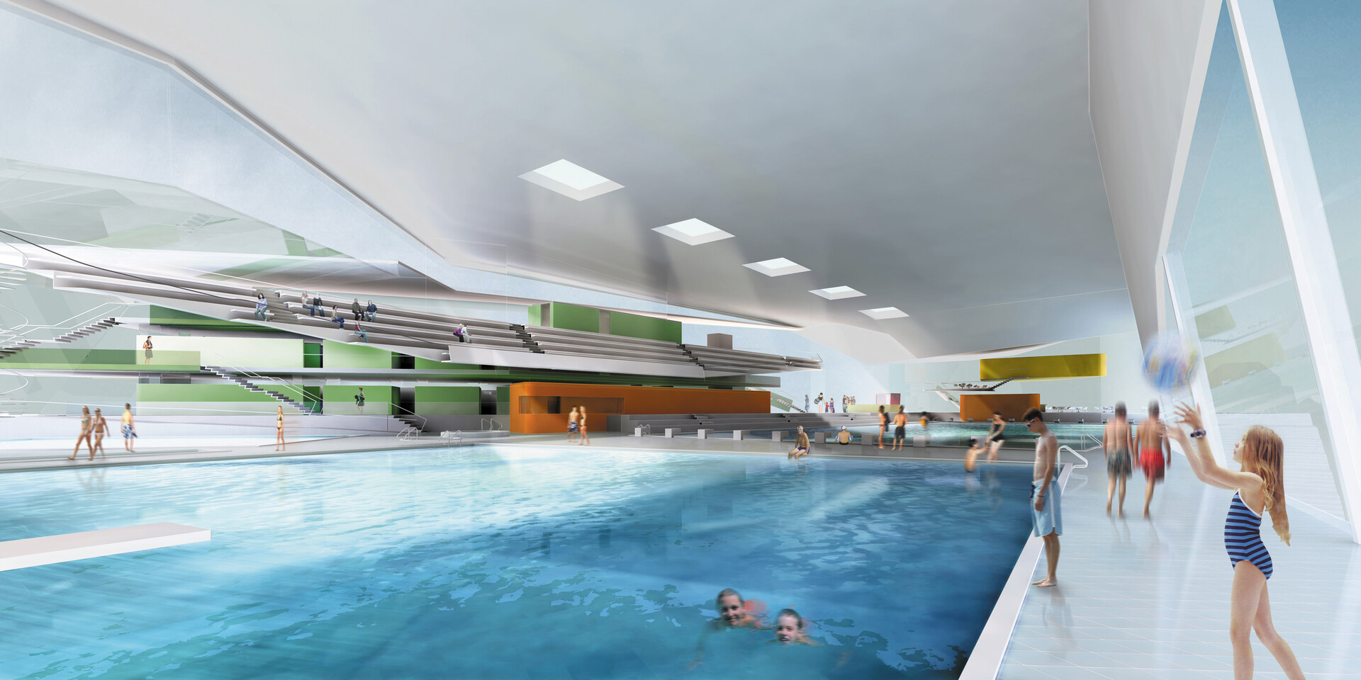 Durch ihre extravagante Form bildet die Hauptanlage für Schwimmen und Turmspringen im Süden von Bergen ein sichtbares architektonisches Zeichen und verdeutlicht somit ihre Bedeutung als nationales Trainings- und internationales Wettkampfzentrum. Form und Materialwahl spiegeln die Dynamik und Präzision des Schwimmens und Turmspringens wider. Das Gebäude ist eine scharf geschnittene, großteils einsehbare Skulptur, die durch ihre Offenheit die Besucher freundlich einlädt.