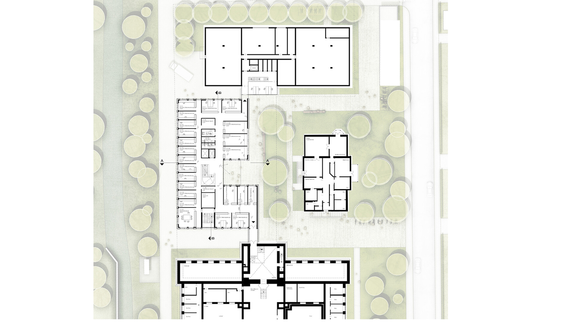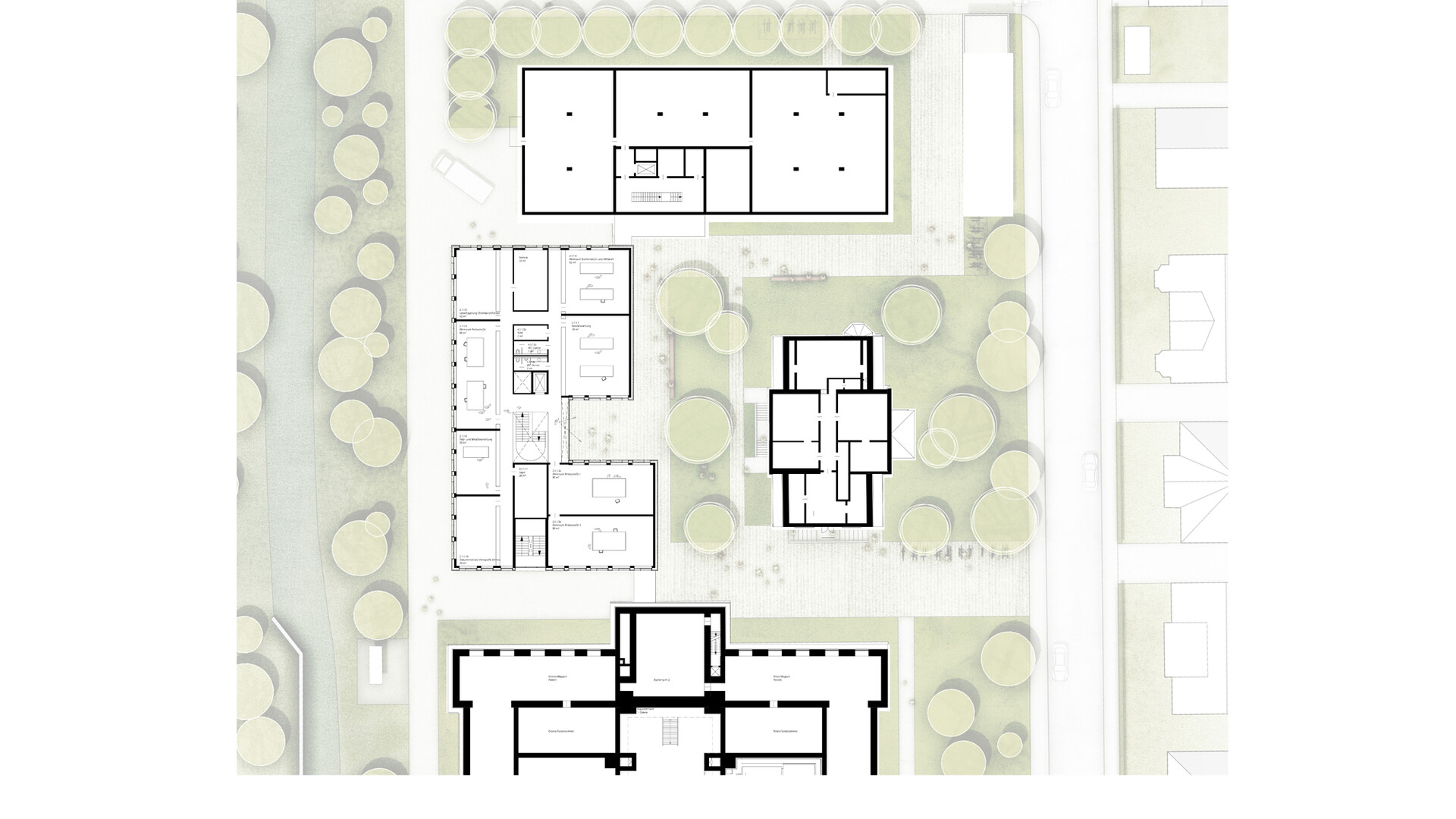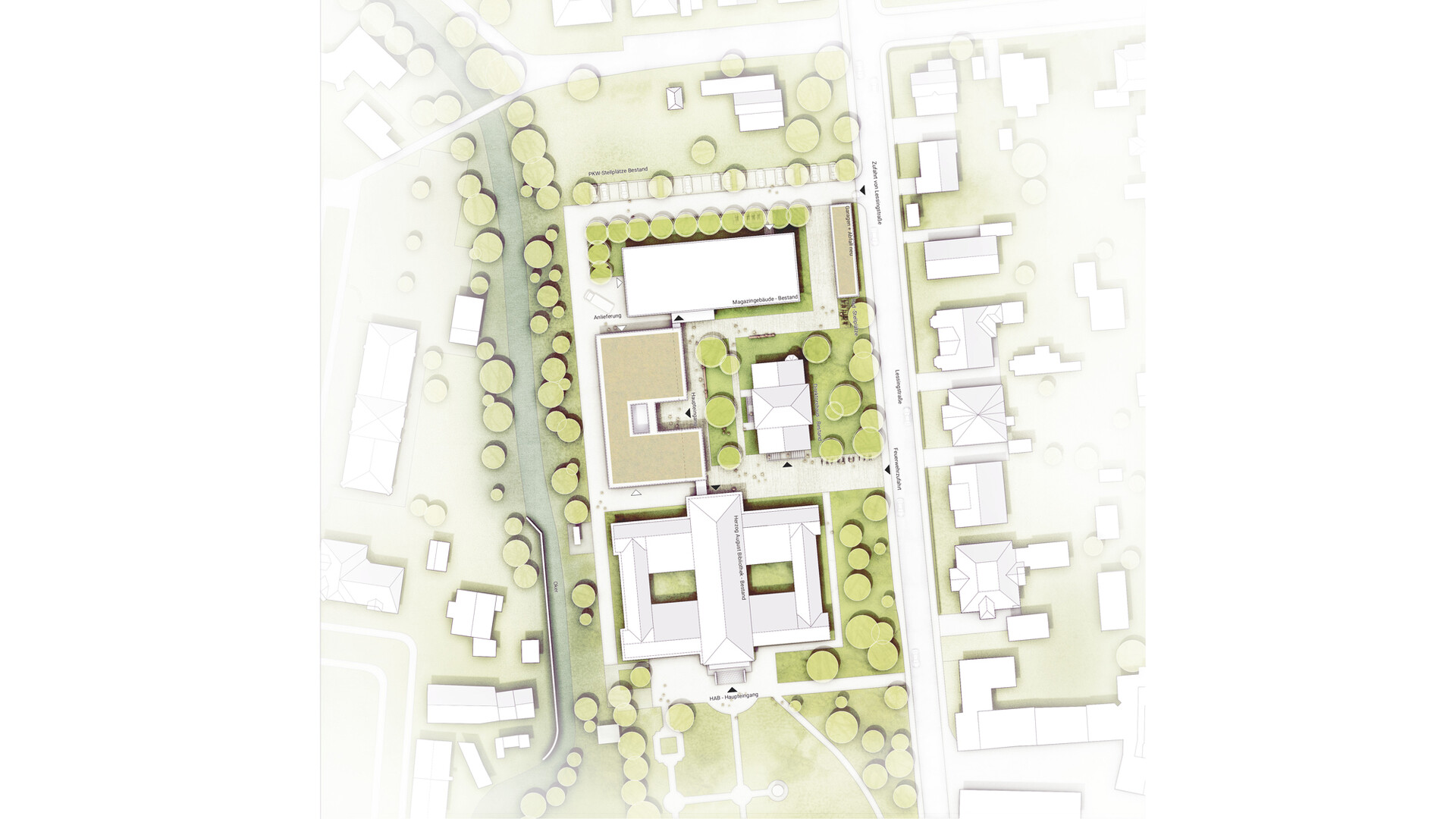 Mit dem Neubau des Servicegebäudes für die Herzog August Bibliothek soll zusammen mit den Bestandsgebäuden das "Zentrum altes Buch" entstehen. Das neue Servicegebäude spannt sich wie eine Brücke zwischen Bibliothek und Magazingebäude und verbindet diese Bereiche miteinander. So entsteht ein halböffentlicher Raum mit besonderer Spannung und Charakteristik. Die zurückspringende Eingangszone und die auskragenden Obergeschosse gliedern das Volumen und bilden einen gut proportionierten und spannenden Raum zwischen Servicegebäude und Direktorenhaus. Das Gebäude sollte trotz seiner Größe durch das umfangreiche Raumprogramm nicht in den Vordergrund rücken, sich aber dennoch selbstbewusst in das Gebäudeensemble einfügen. Die räumliche Struktur des Gebäudes ist klar und übersichtlich über alle Geschosse. Über die zentrale Erschließung öffnet sich das Gebäude über alle Geschosse zum Garten hin und ermöglicht Ein- und Ausblicke in den Garten und auf die umliegenden Bibliotheksgebäude. Der straff organisierte dreibündige Grundriss beherbergt in der Mittelzone alle Nebenräume wie Lager und Archivräume sowie die Erschließung und Technikbereiche. Die Arbeitsbereiche und Büroräume sind entlang der Fassaden angeordnet Die von der offenen Mittelzone abgehenden Bereiche können über verglaste Türanlagen gesichert werden. Im Zentrum des Gebäudes verbindet eine offene Treppe alle Geschosse miteinander. Die Treppe bildet die kommunikative Mitte im Gebäude. Den Raumgrößen liegt ein Ausbauraster zugrunde, dass sich mit dem Konstruktionsraster deckt. Die Trennwände zwischen den einzelnen Räumen können auf dem Ausbauraster versetzt werden, sodass relativ einfach andere Raumaufteilungen geschaffen werden können und die Räumlichkeiten an sich ändernde Anforderungen angepasst werden können. Das erste Obergeschoss schafft die Anbindung an die historische Bibliothek und das Magazingebäude. Diese Anbindung ermöglicht eine nahezu barrierefreie und sichere Wegeverbindung für den Transport der Sammlungsbestände. Die Anbindung der Brücke im 1. Obergeschoss der Bibliothek muss im Zuge der Sanierungsmaßnahmen neu organisiert werden.