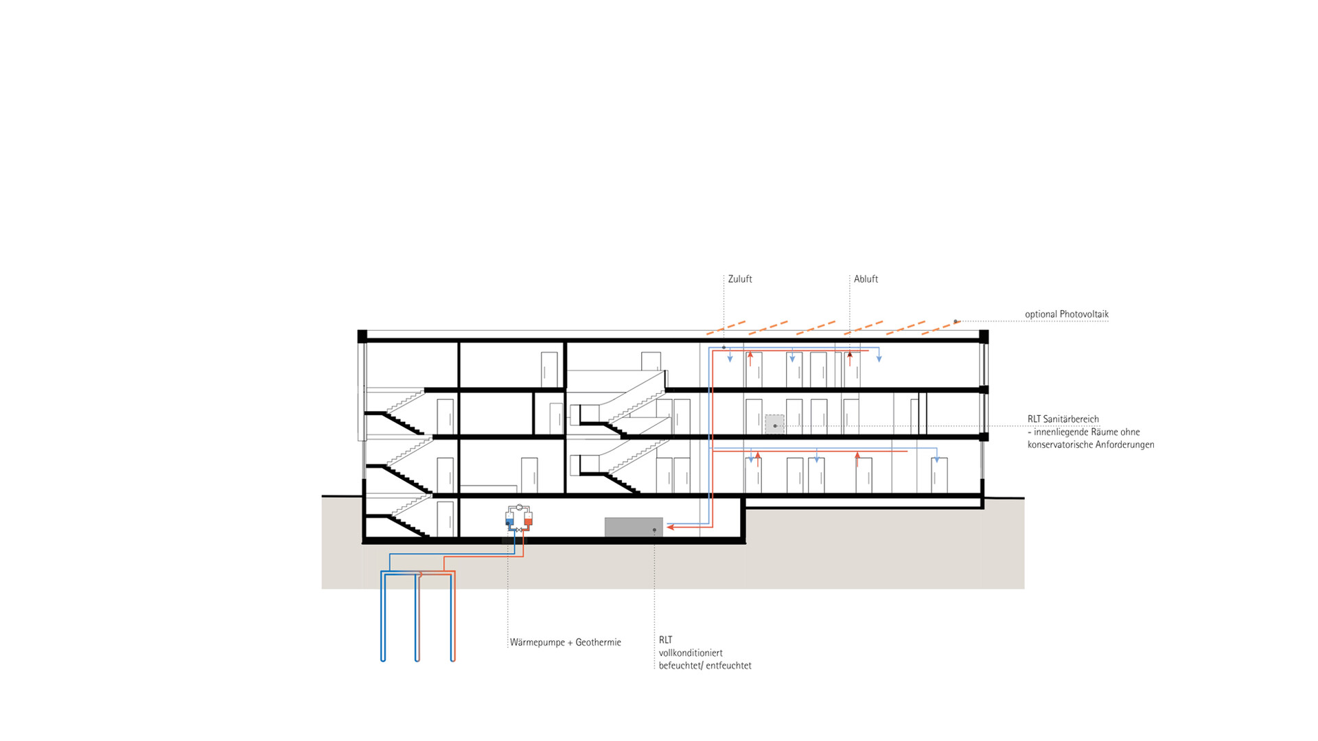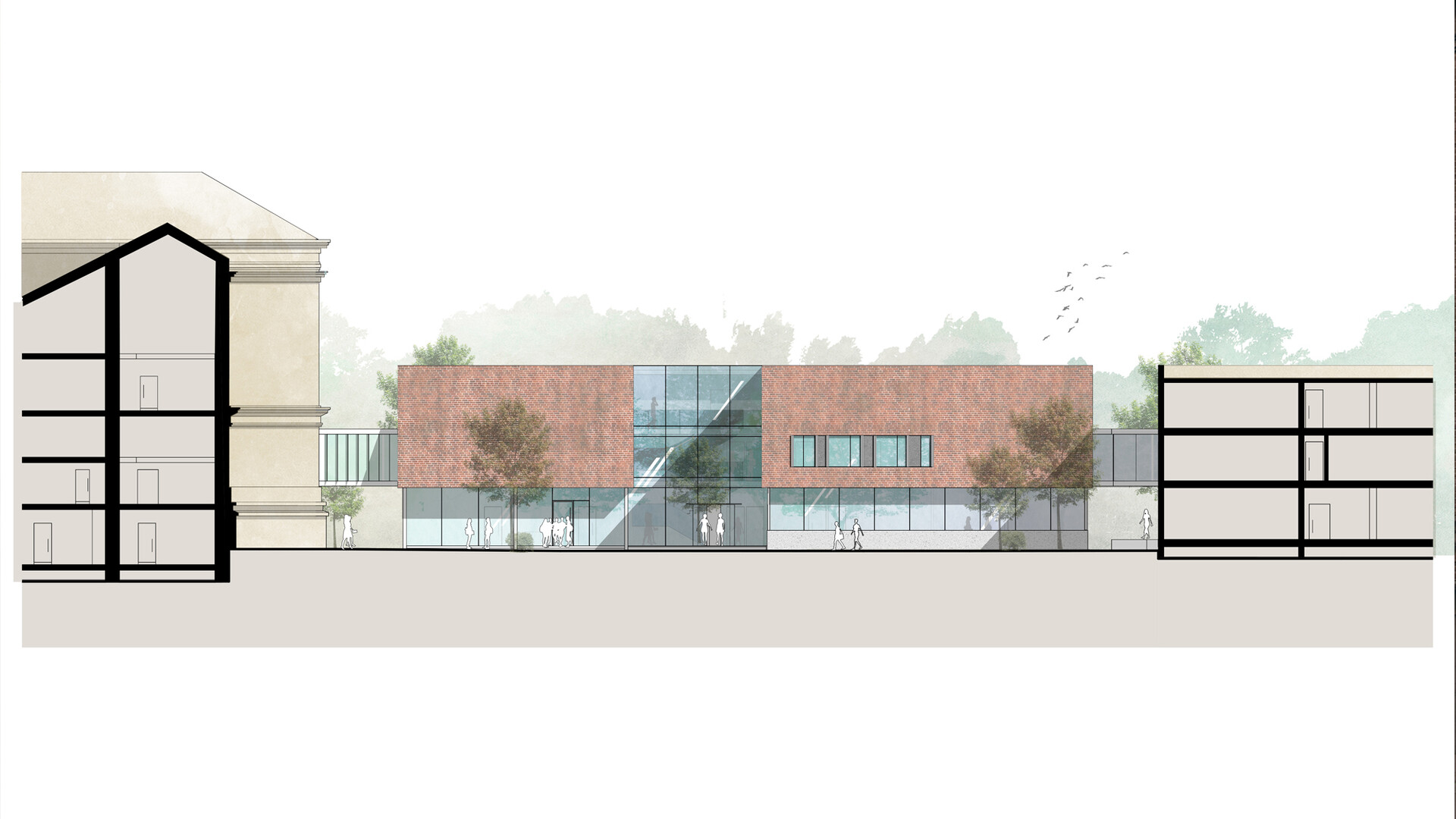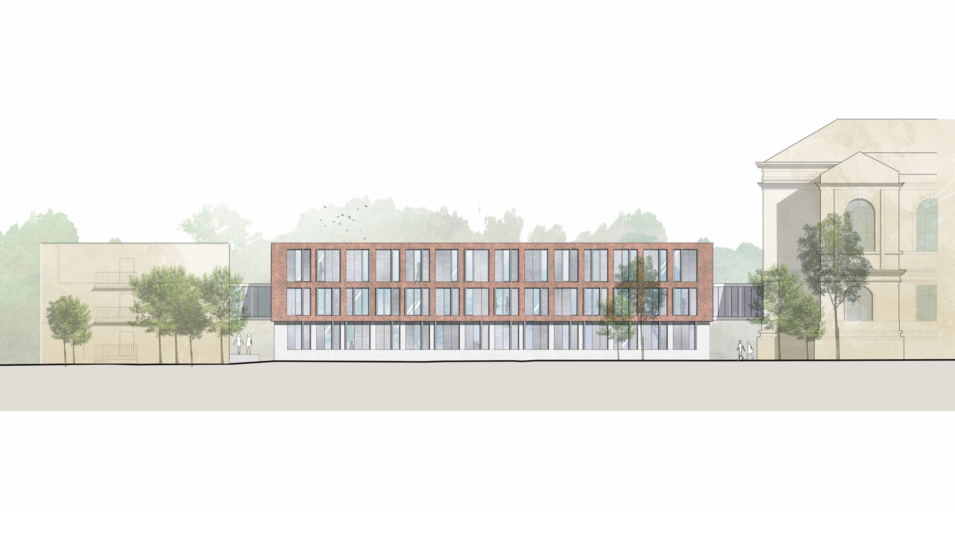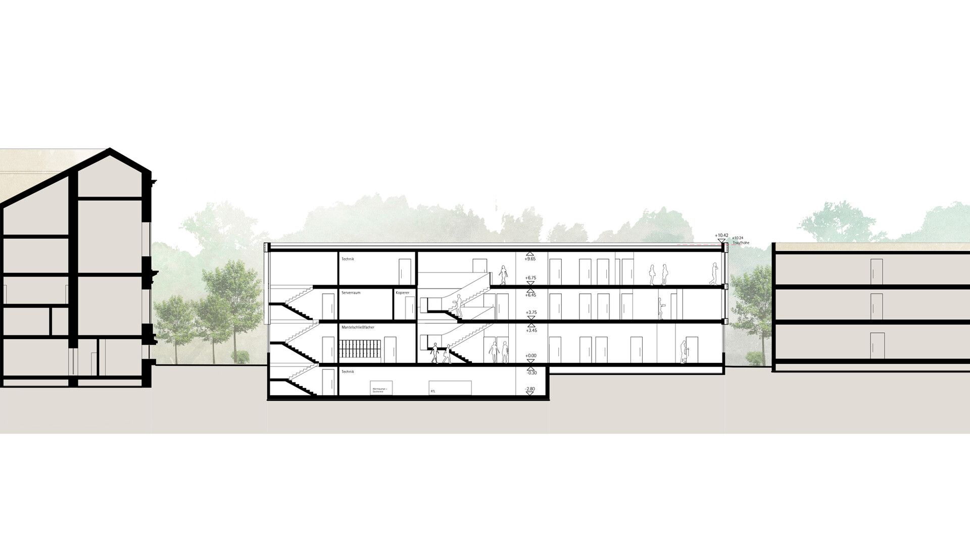 Mit dem Neubau des Servicegebäudes für die Herzog August Bibliothek soll zusammen mit den Bestandsgebäuden das "Zentrum altes Buch" entstehen. Das neue Servicegebäude spannt sich wie eine Brücke zwischen Bibliothek und Magazingebäude und verbindet diese Bereiche miteinander. So entsteht ein halböffentlicher Raum mit besonderer Spannung und Charakteristik. Die zurückspringende Eingangszone und die auskragenden Obergeschosse gliedern das Volumen und bilden einen gut proportionierten und spannenden Raum zwischen Servicegebäude und Direktorenhaus. Das Gebäude sollte trotz seiner Größe durch das umfangreiche Raumprogramm nicht in den Vordergrund rücken, sich aber dennoch selbstbewusst in das Gebäudeensemble einfügen. Die räumliche Struktur des Gebäudes ist klar und übersichtlich über alle Geschosse. Über die zentrale Erschließung öffnet sich das Gebäude über alle Geschosse zum Garten hin und ermöglicht Ein- und Ausblicke in den Garten und auf die umliegenden Bibliotheksgebäude. Der straff organisierte dreibündige Grundriss beherbergt in der Mittelzone alle Nebenräume wie Lager und Archivräume sowie die Erschließung und Technikbereiche. Die Arbeitsbereiche und Büroräume sind entlang der Fassaden angeordnet Die von der offenen Mittelzone abgehenden Bereiche können über verglaste Türanlagen gesichert werden. Im Zentrum des Gebäudes verbindet eine offene Treppe alle Geschosse miteinander. Die Treppe bildet die kommunikative Mitte im Gebäude. Den Raumgrößen liegt ein Ausbauraster zugrunde, dass sich mit dem Konstruktionsraster deckt. Die Trennwände zwischen den einzelnen Räumen können auf dem Ausbauraster versetzt werden, sodass relativ einfach andere Raumaufteilungen geschaffen werden können und die Räumlichkeiten an sich ändernde Anforderungen angepasst werden können. Das erste Obergeschoss schafft die Anbindung an die historische Bibliothek und das Magazingebäude. Diese Anbindung ermöglicht eine nahezu barrierefreie und sichere Wegeverbindung für den Transport der Sammlungsbestände. Die Anbindung der Brücke im 1. Obergeschoss der Bibliothek muss im Zuge der Sanierungsmaßnahmen neu organisiert werden.