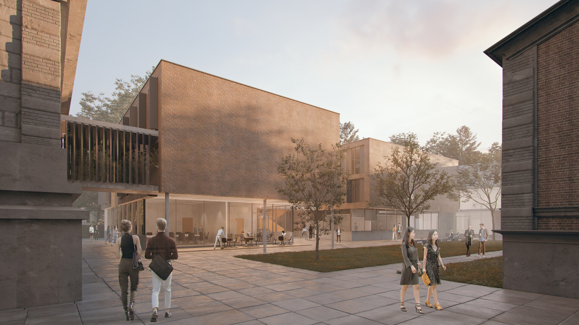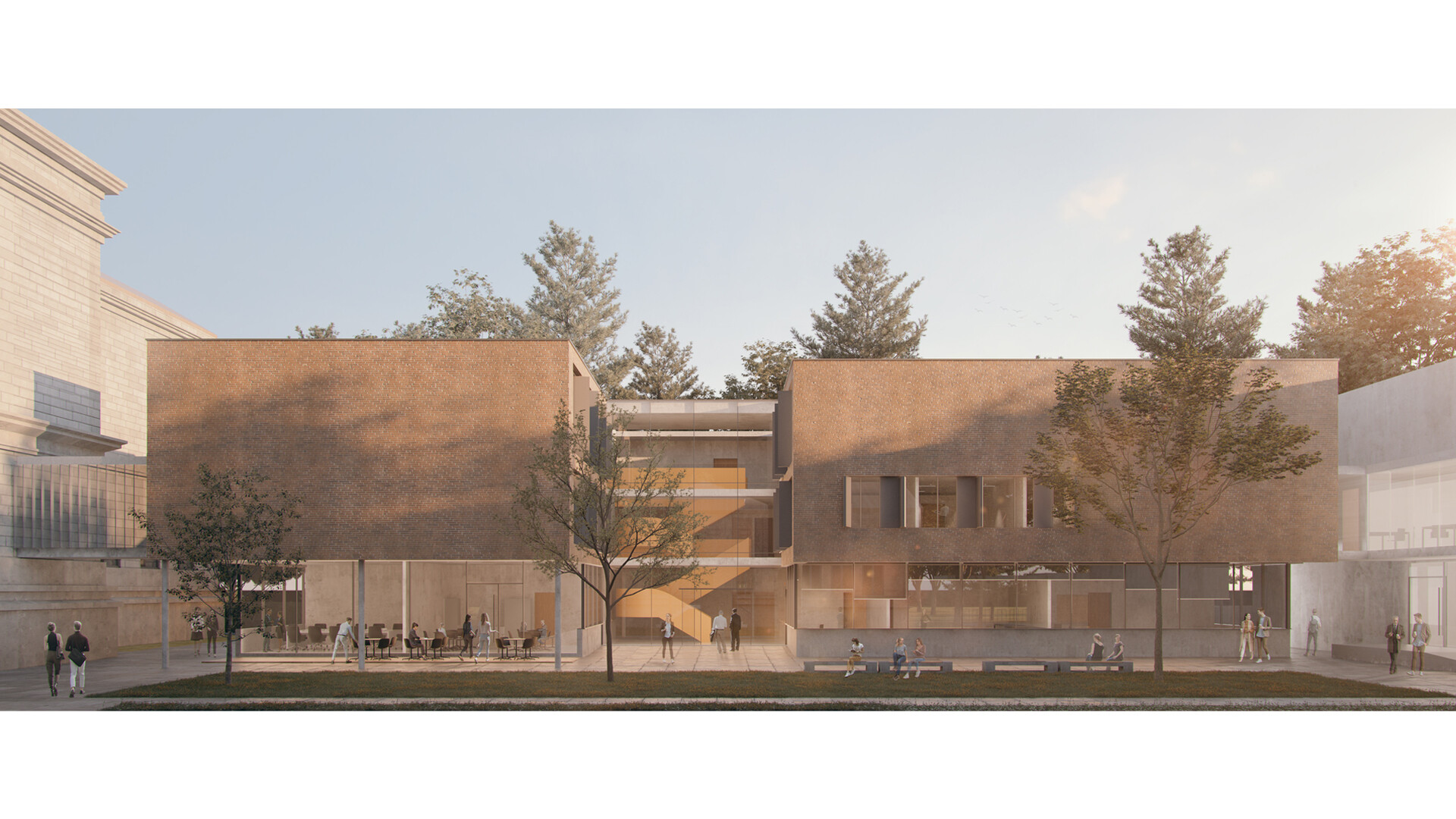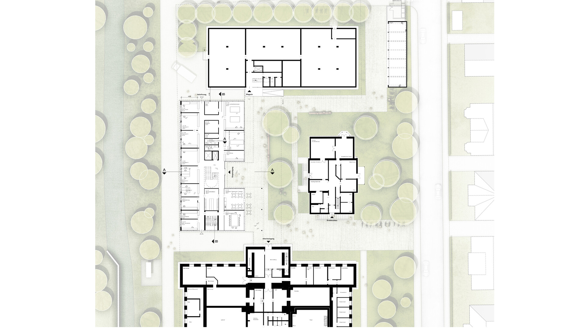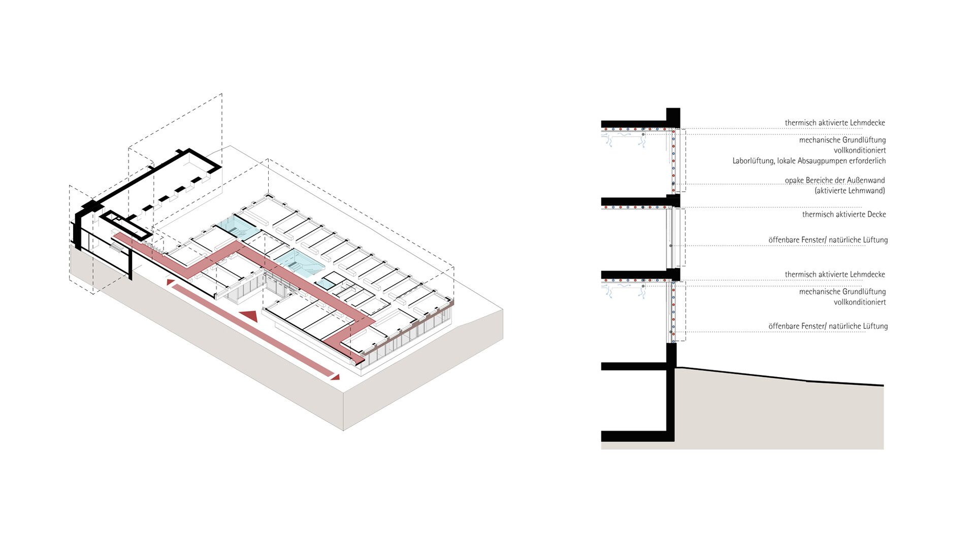 Robuste und langlebige Materialien verleihen dem Gebäude Wertigkeit. Die Betonkonstruktionen können aus recyceltem Beton hergestellt werden um die Co2-Bilanz zu verbessern. Die Holzfenster werden mit gedämmten Fensterläden geschlossen, um die solaren Gewinne entsprechend steuern zu können. Werden die Arbeitsbereiche nicht genutzt wie z.B. in den Nachtstunden oder an Wochenenden, können die Fenster mit den Läden komplett geschlossen werden. Das gewährleistet eine Temperaturkonstanz in den Räumen hält den Energieverbrauch möglichst gering. Die Büroräume und Räume ohne spezielle Anforderungen an das Klima erhalten Öffnungsflügel für die natürliche Belüftung der Räume. Die Decken und Wände in den Räumen werden teilweise mit thermisch aktivierten Lehmputzen verkleidet, um große Schwankungen der Luftfeuchte zu vermeiden. Die opaken Flächen der Fassaden werden mit einer hinterlüfteten Ziegel-Fassade hergestellt. Die raue Backsteinfassade harmoniert mit den alten Gebäuden und verleiht dem Gebäude den Charakter eines Werkstattgebäudes. Das Ensemble nimmt die Sprache des Ortes auf, ohne die Aufmerksamkeit des historischen Bestandes zu überzeichnen. Raumkanten und Baufluchten erzeugen eine eigenständige, in sich ruhende Formsprache mit prägender Charakteristik und Adressbildung.