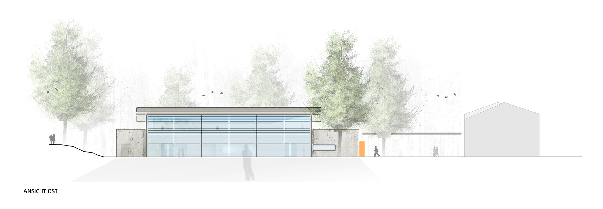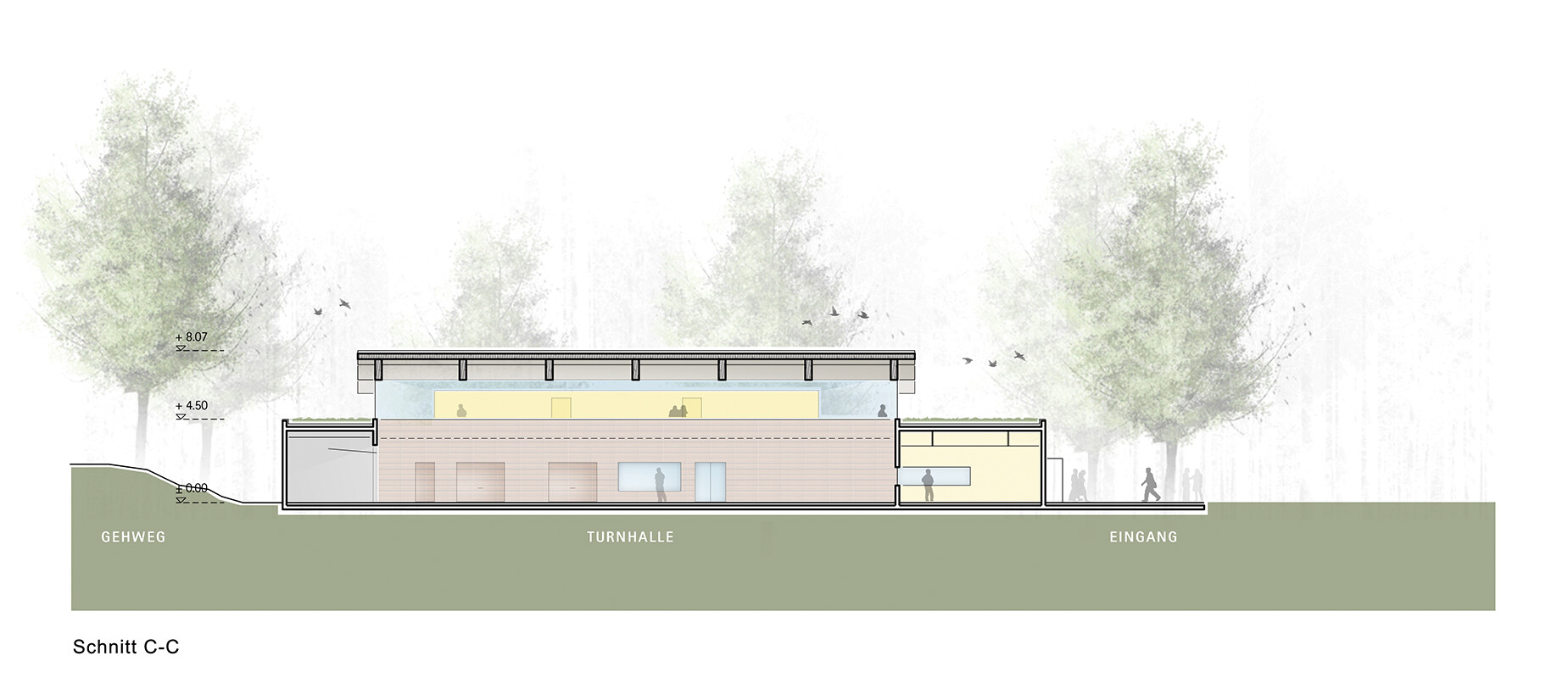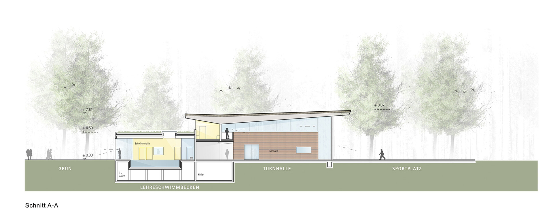 Der Eingangsbereich der neuen Sporthalle befindet sich in räumlicher Nähe zur Schule. Halle und Schule werden über ein breites Dach miteinander verbunden. Über das zentrale Foyer werden die Sporthalle und das Schwimmbad gemeinsam erschlossen. Die beiden Bereiche sind jedoch räumlich klar voneinander getrennt. Das Lehrschwimmbecken mit Umkleiden und Duschen bilden einen in sich geschlossenen Gebäudeteil, sodass der Betrieb von Sport-und Schwimmunterricht ungestört nebeneinander funktioniert. Das Schwimmbad orientiert sich zum Grünbereich und ist vor direkten Einblicken von außen geschützt. Die Einfeldhalle, die neben Schulsport auch als Veranstaltungsraum und Badmintonhalle geeignet ist, ist zum Sportplatz hin ausgerichtet, sodass der Platz bei Veranstaltungen direkt von der Halle aus mitgenutzt werden kann. Für Veranstaltungen ist eine Küche mit Ausgabemöglichkeit in die Halle, in das Foyer und nach außen zum Platz hin vorgesehen. Das kompakte Gebäudevolumen und die Möglichkeit einer rationellen und einfachen Bauweise ermöglichen eine ressourcenschonende Errichtung und Betrieb des Gebäudes.