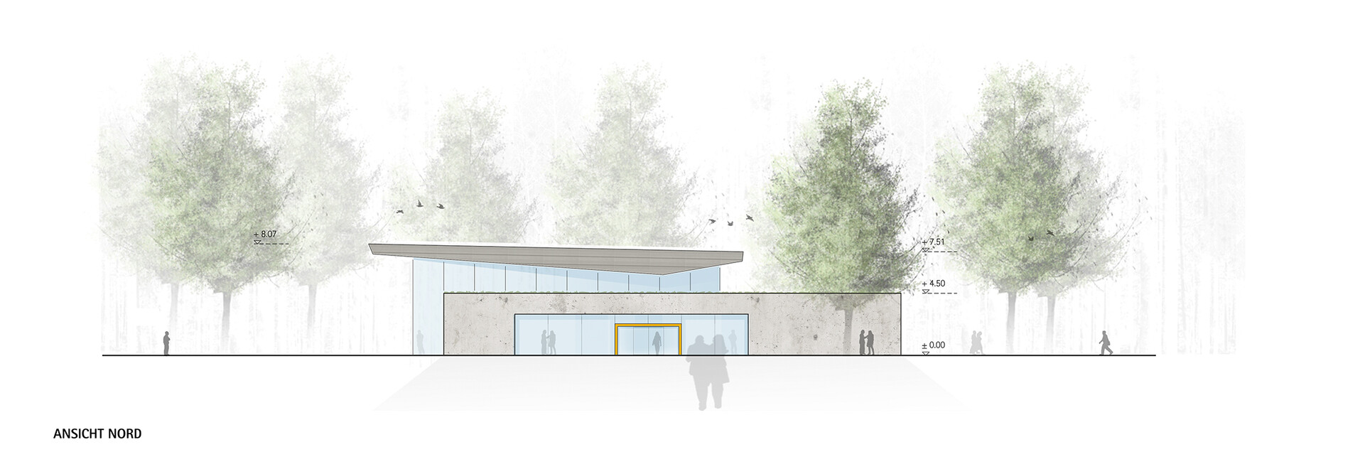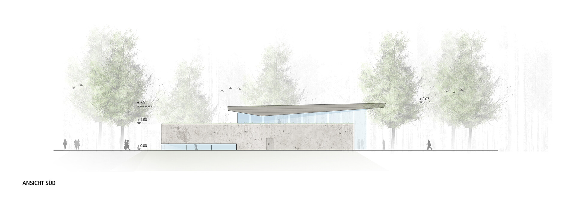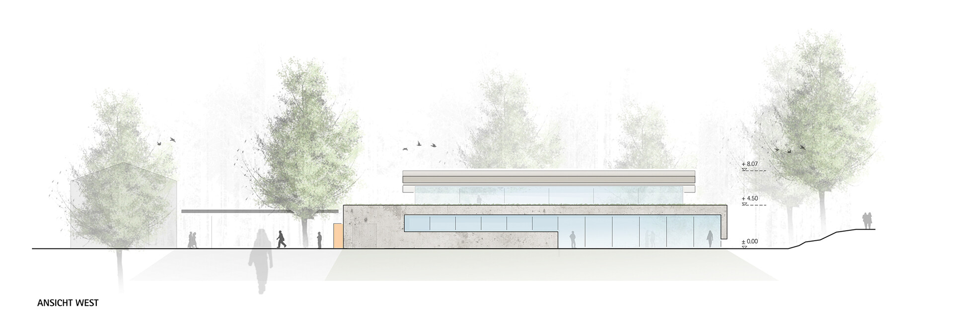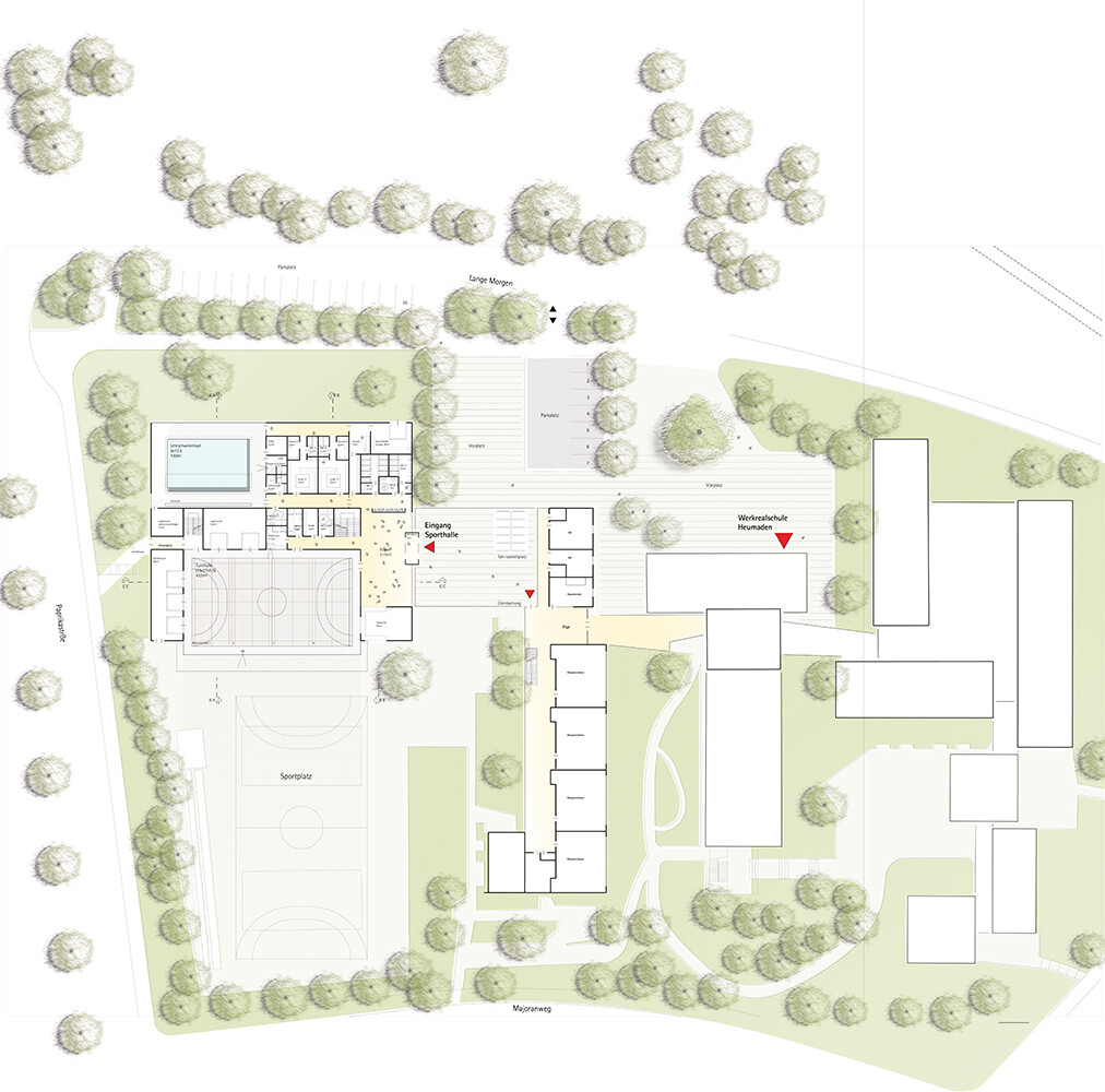 Der Eingangsbereich der neuen Sporthalle befindet sich in räumlicher Nähe zur Schule. Halle und Schule werden über ein breites Dach miteinander verbunden. Über das zentrale Foyer werden die Sporthalle und das Schwimmbad gemeinsam erschlossen. Die beiden Bereiche sind jedoch räumlich klar voneinander getrennt. Das Lehrschwimmbecken mit Umkleiden und Duschen bilden einen in sich geschlossenen Gebäudeteil, sodass der Betrieb von Sport-und Schwimmunterricht ungestört nebeneinander funktioniert. Das Schwimmbad orientiert sich zum Grünbereich und ist vor direkten Einblicken von außen geschützt. Die Einfeldhalle, die neben Schulsport auch als Veranstaltungsraum und Badmintonhalle geeignet ist, ist zum Sportplatz hin ausgerichtet, sodass der Platz bei Veranstaltungen direkt von der Halle aus mitgenutzt werden kann. Für Veranstaltungen ist eine Küche mit Ausgabemöglichkeit in die Halle, in das Foyer und nach außen zum Platz hin vorgesehen. Das kompakte Gebäudevolumen und die Möglichkeit einer rationellen und einfachen Bauweise ermöglichen eine ressourcenschonende Errichtung und Betrieb des Gebäudes.