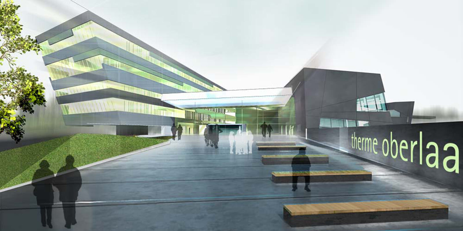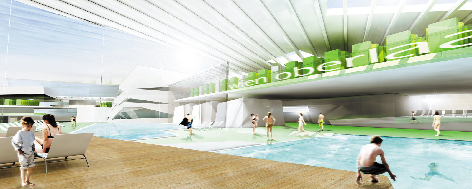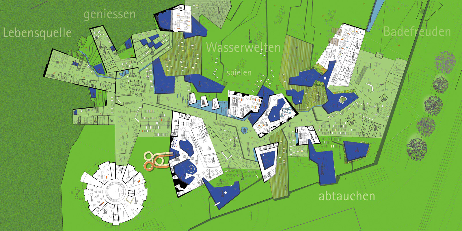 Jede Badehalle beinhaltet eine unterschiedliche Thematik. Einzelne Badehäuser liegen wie große Steine und Felsen in der Parklandschaft, an einem Wasserlauf, der von der Quelle im Park bis zum Eingangsplatz das verbindende Element des Konzepts darstellt. So entstehen natürliche, über-schaubare Bereiche und Zonen, wodurch die Maßstäblichkeit gewahrt wird. Laute und ruhige Natur, harte und weiche Formen schaffen ein abwechslungsreiches Badeerlebnis für die Gäste. Die Landschaft durchdringt das ganze Haus und gewährt interessante Ein-, Aus- und Durchblicke. Wasserträume werden Wasserräume.