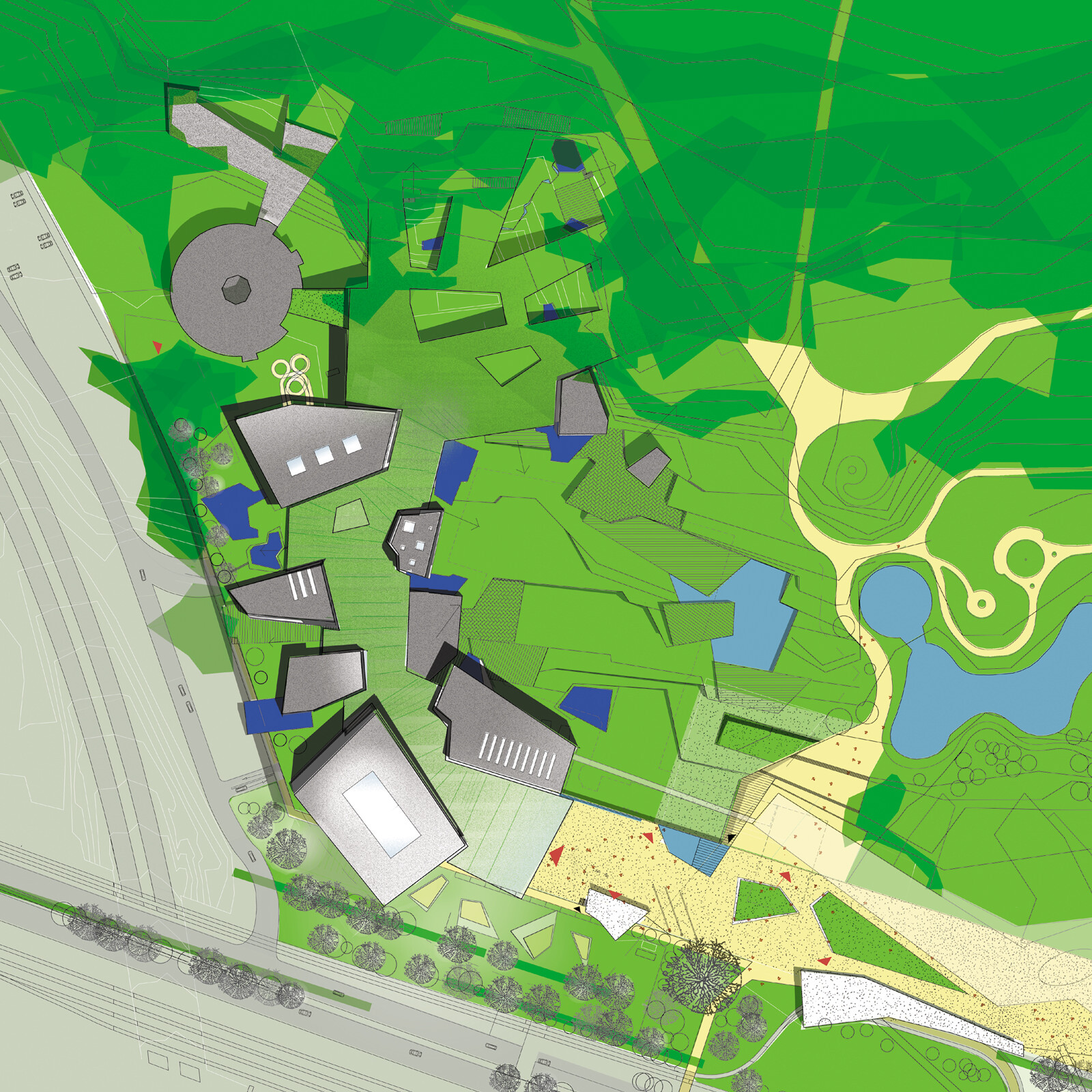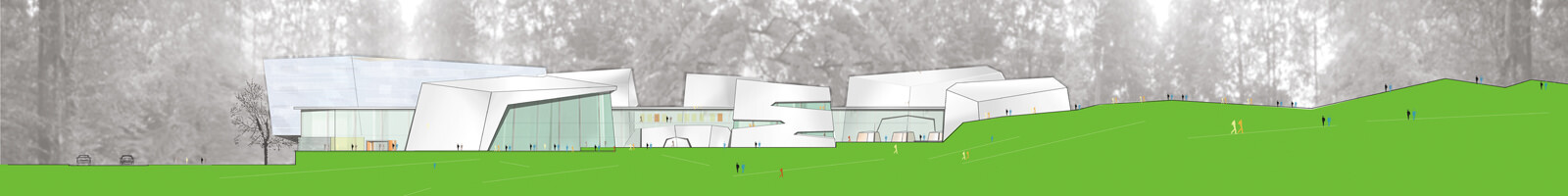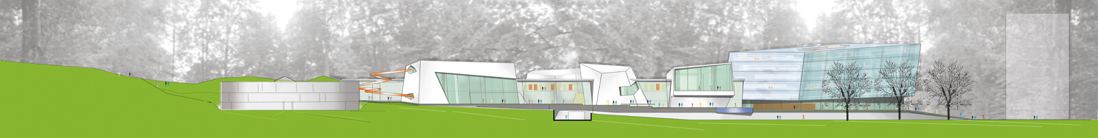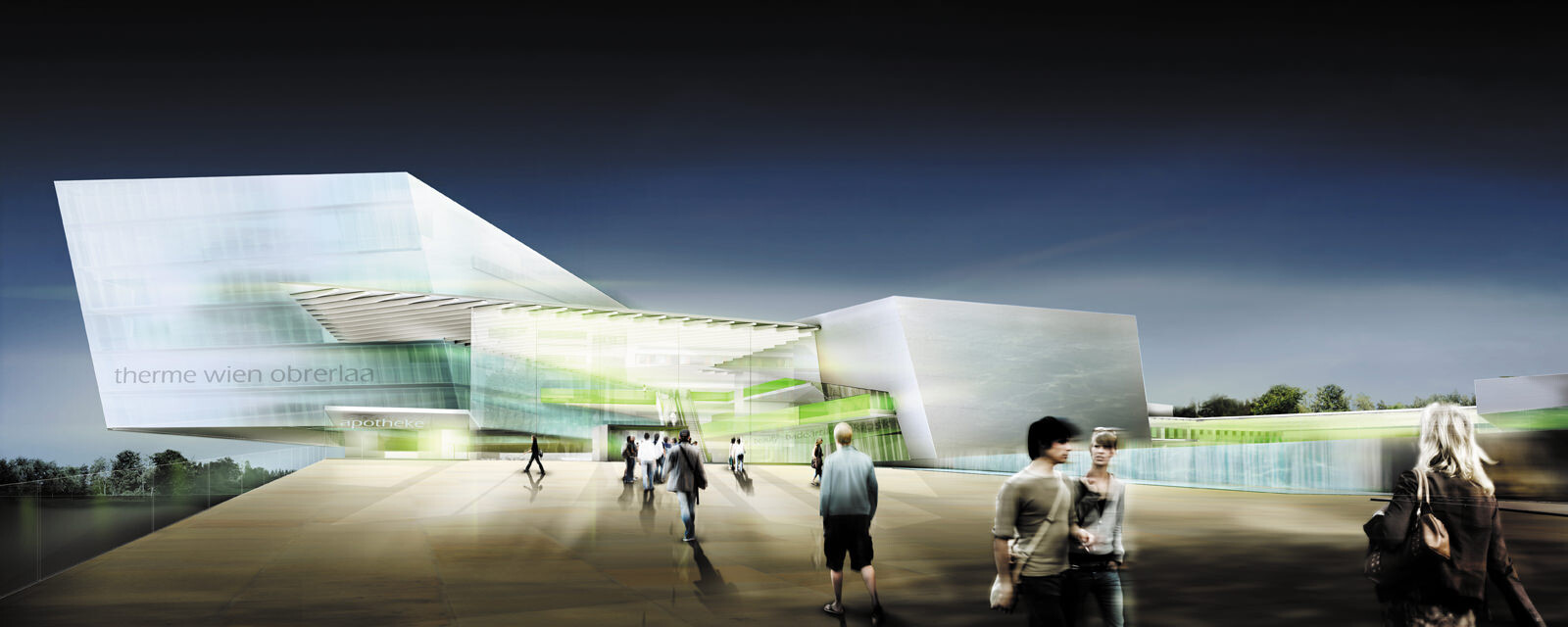 Jede Badehalle beinhaltet eine unterschiedliche Thematik. Einzelne Badehäuser liegen wie große Steine und Felsen in der Parklandschaft, an einem Wasserlauf, der von der Quelle im Park bis zum Eingangsplatz das verbindende Element des Konzepts darstellt. So entstehen natürliche, über-schaubare Bereiche und Zonen, wodurch die Maßstäblichkeit gewahrt wird. Laute und ruhige Natur, harte und weiche Formen schaffen ein abwechslungsreiches Badeerlebnis für die Gäste. Die Landschaft durchdringt das ganze Haus und gewährt interessante Ein-, Aus- und Durchblicke. Wasserträume werden Wasserräume.