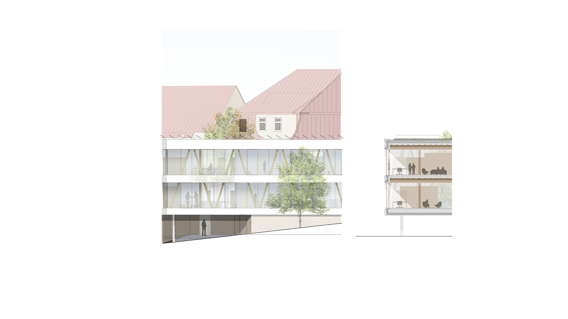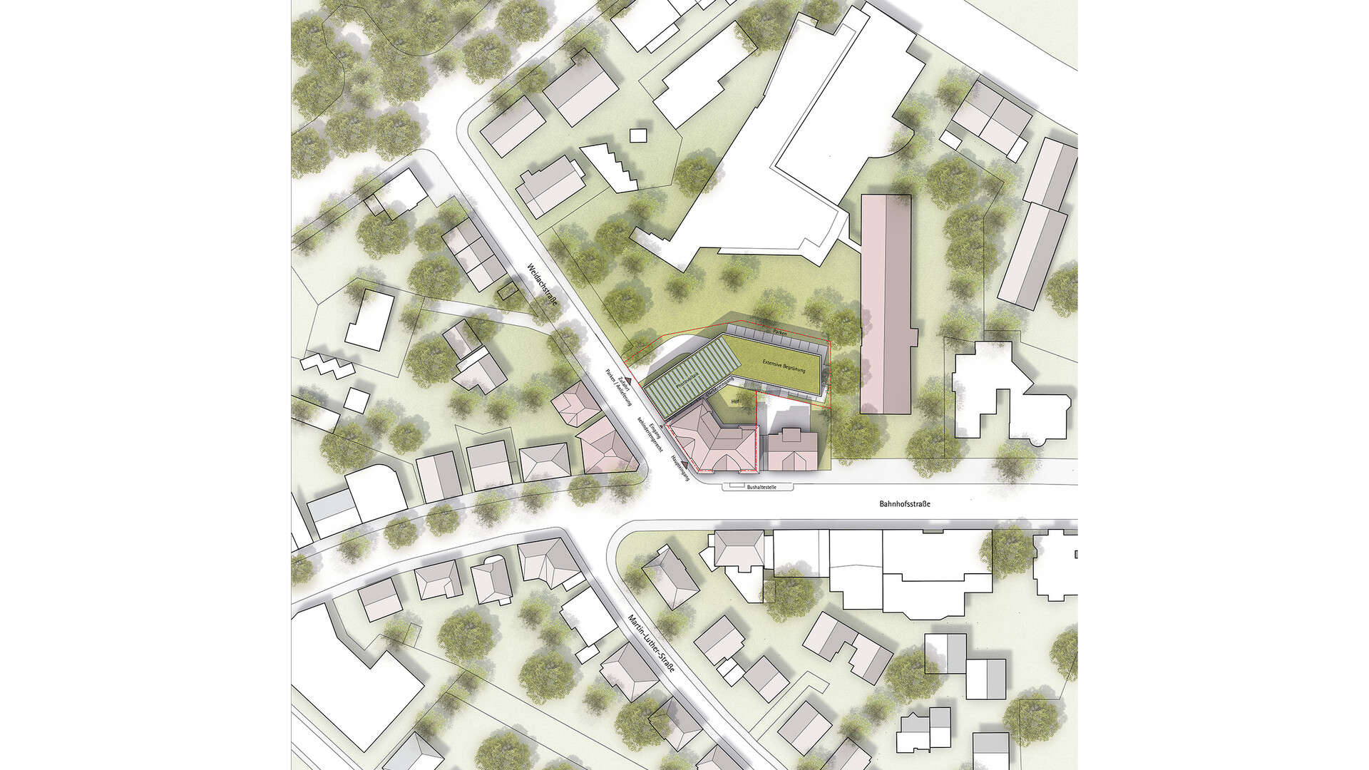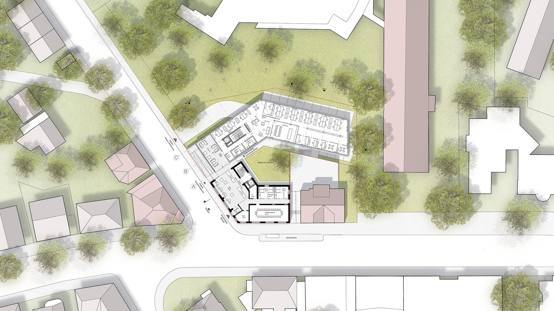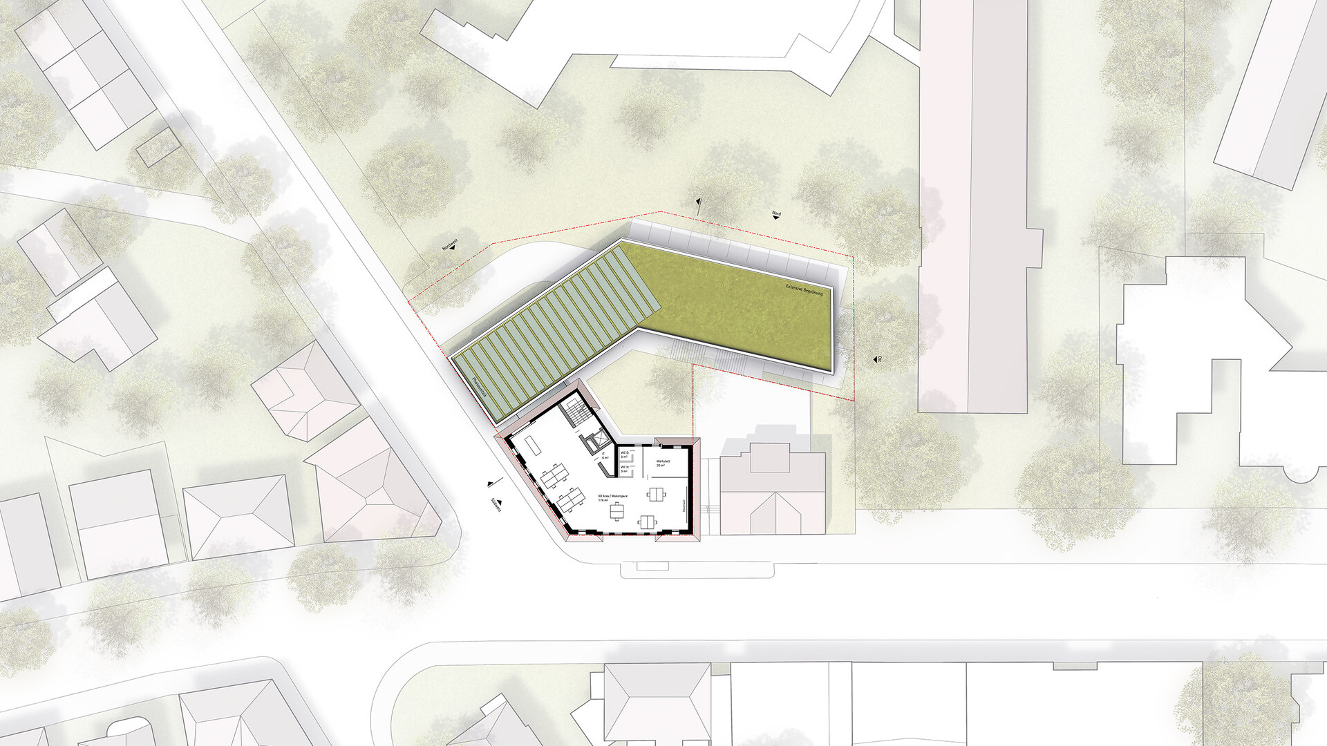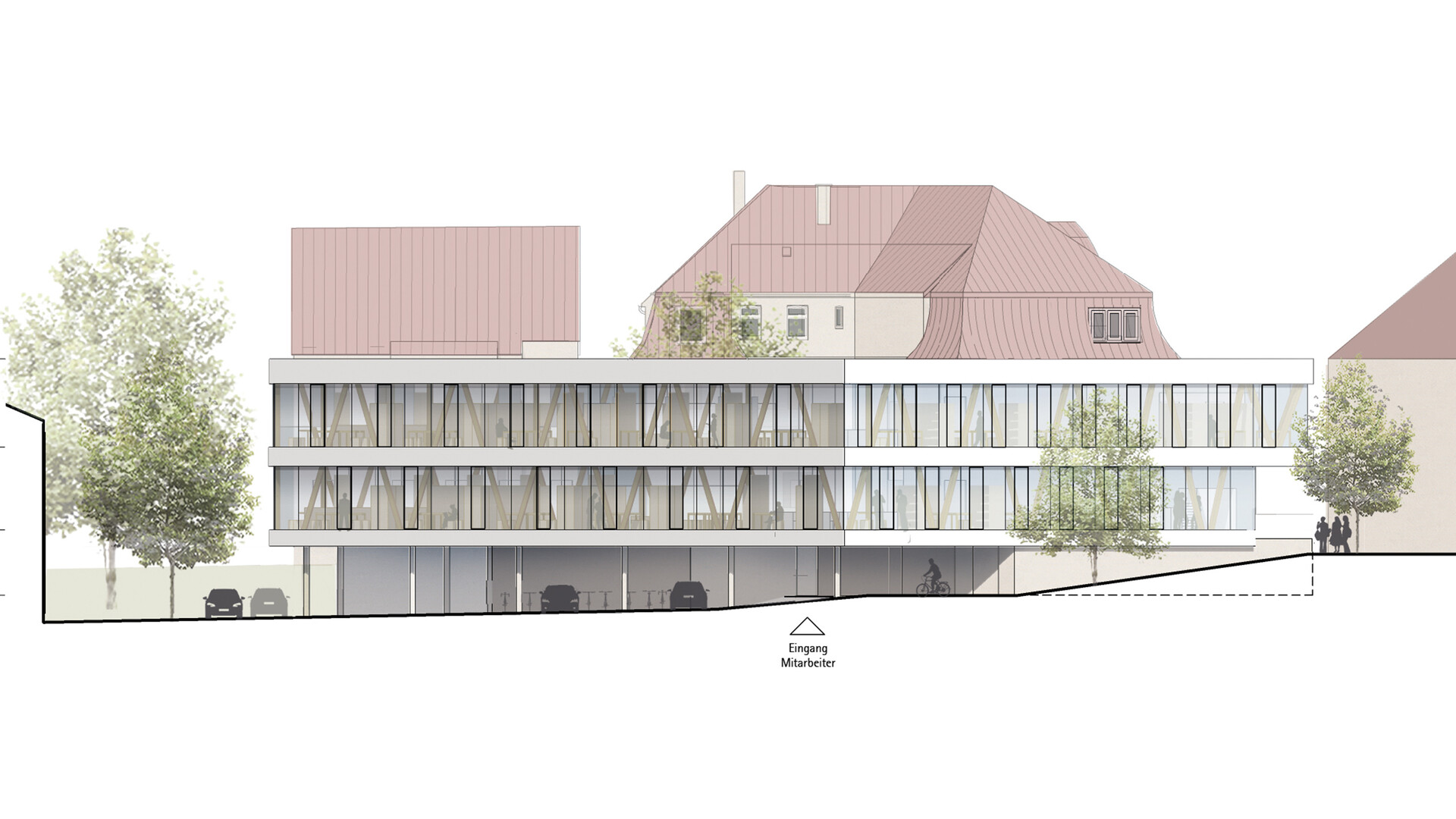Das Bestandsgebäude des Verwaltungssitzes für die Abfall-Wirtschaft Rems Murr in Waiblingen soll an die neue Nutzung angepasst und durch zusätzliche Büroflächen auf dem Grundstück erweitert werden. Im Sinne eines nachhaltigen und ressourcenschonenden Umgangs mit unserer Umwelt und aus städtebaulichen Überlegungen heraus ist ein Abbruch des bestehenden Gebäudes nicht gewünscht. Da sich die bestehende Gebäudestruktur aber nur bedingt an die neuen Nutzungen und die räumlichen Erfordernisse anpassen lässt, wird der Bestand durch einen entsprechenden Zubau auf der Rückseite ergänzt und erweitert. Die niedrigeren Anbauten des Bestandsgebäudes werden rückgebaut. Der Neubau schließt über eine gläserne Fuge an den Bestand an und legt sich mit einem sanften Knick um den Bestand. So entsteht zwischen Alt-und Neubau ein kleiner grüner Hof, um den sich die neuen Räumlichkeiten gruppieren. Unter dem aufgeständerten Neubau befinden sich Parkplätze und Fahrradstellplätze mit E-Ladesäulen. Mit der 2- bzw. 3-Geschossigkeit nimmt der Neubau die Höhen der umliegenden Gebäude auf der Rückseite auf und bleibt unter der Traufhöhe der Straßenraum bildenden Bestandsbebauung.
