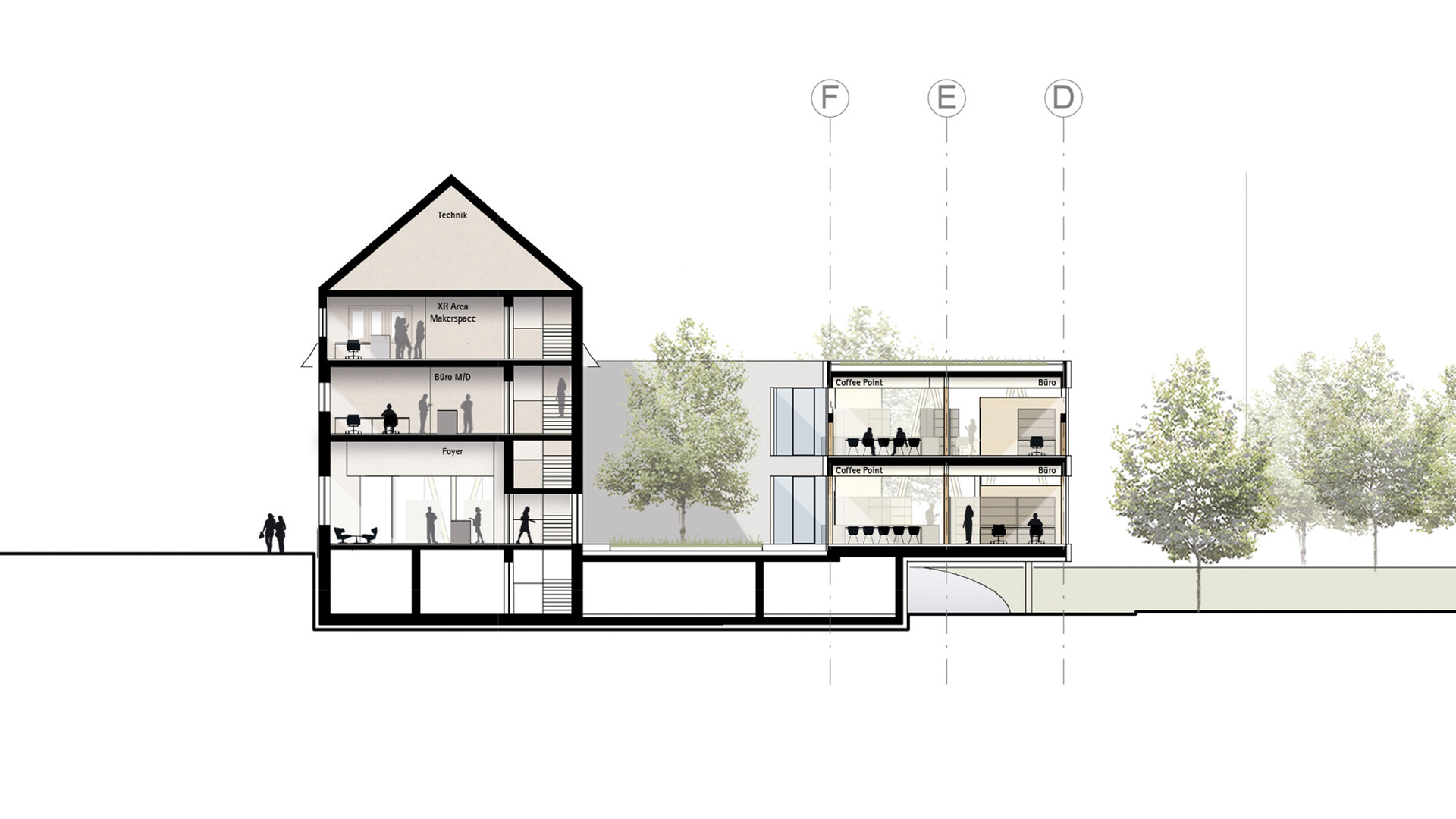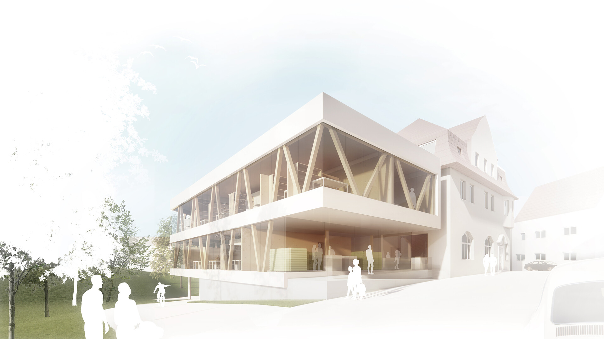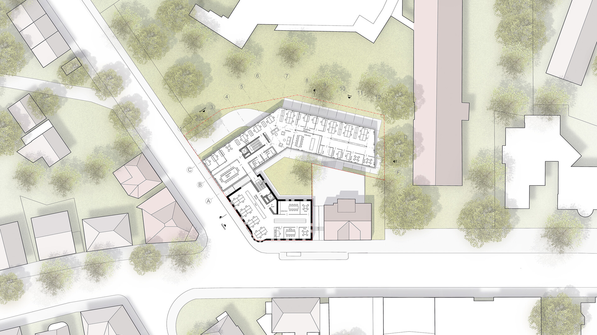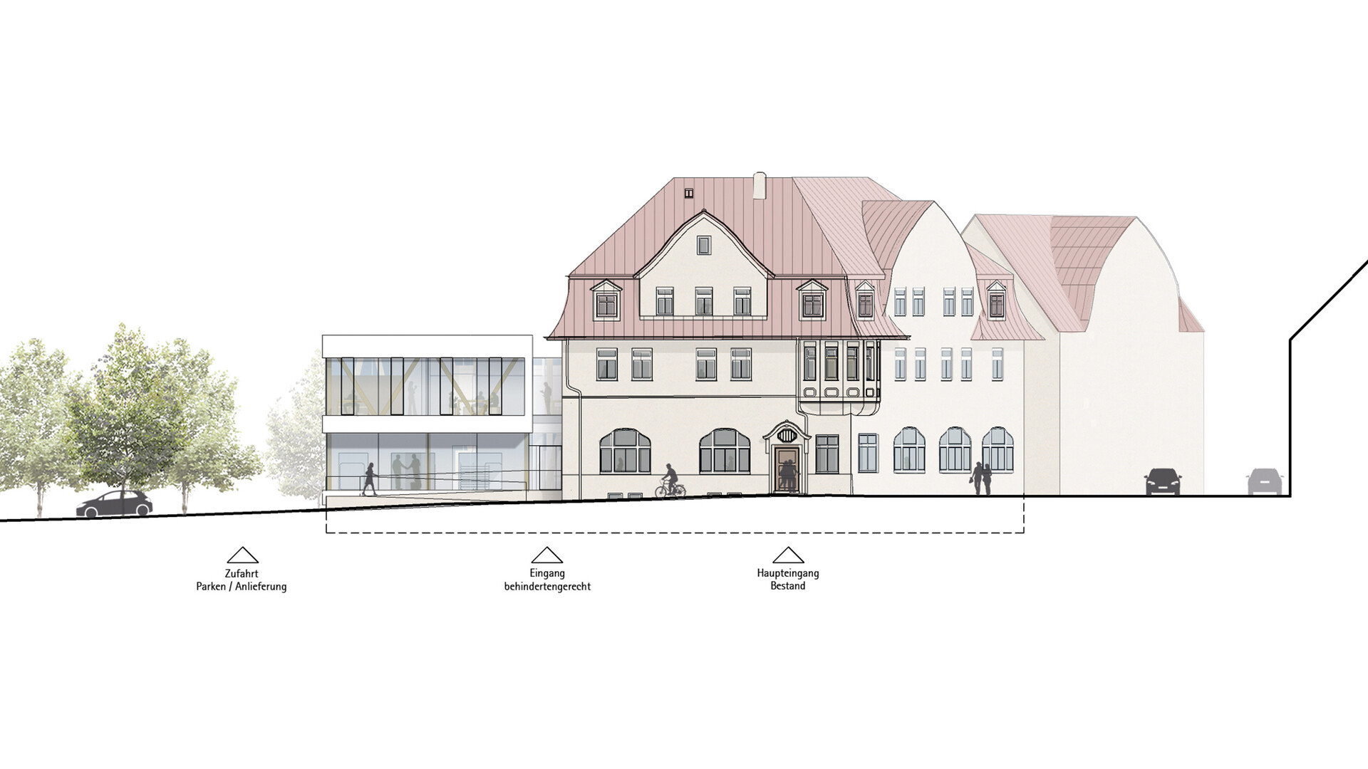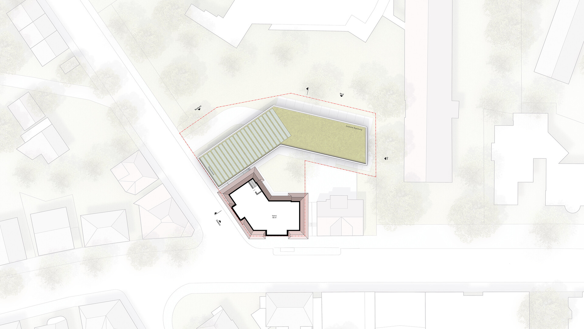 Das Bestandsgebäude des Verwaltungssitzes für die Abfall-Wirtschaft Rems Murr in Waiblingen soll an die neue Nutzung angepasst und durch zusätzliche Büroflächen auf dem Grundstück erweitert werden. Im Sinne eines nachhaltigen und ressourcenschonenden Umgangs mit unserer Umwelt und aus städtebaulichen Überlegungen heraus ist ein Abbruch des bestehenden Gebäudes nicht gewünscht. Da sich die bestehende Gebäudestruktur aber nur bedingt an die neuen Nutzungen und die räumlichen Erfordernisse anpassen lässt, wird der Bestand durch einen entsprechenden Zubau auf der Rückseite ergänzt und erweitert. Die niedrigeren Anbauten des Bestandsgebäudes werden rückgebaut. Der Neubau schließt über eine gläserne Fuge an den Bestand an und legt sich mit einem sanften Knick um den Bestand. So entsteht zwischen Alt-und Neubau ein kleiner grüner Hof, um den sich die neuen Räumlichkeiten gruppieren. Unter dem aufgeständerten Neubau befinden sich Parkplätze und Fahrradstellplätze mit E-Ladesäulen. Mit der 2- bzw. 3-Geschossigkeit nimmt der Neubau die Höhen der umliegenden Gebäude auf der Rückseite auf und bleibt unter der Traufhöhe der Straßenraum bildenden Bestandsbebauung.