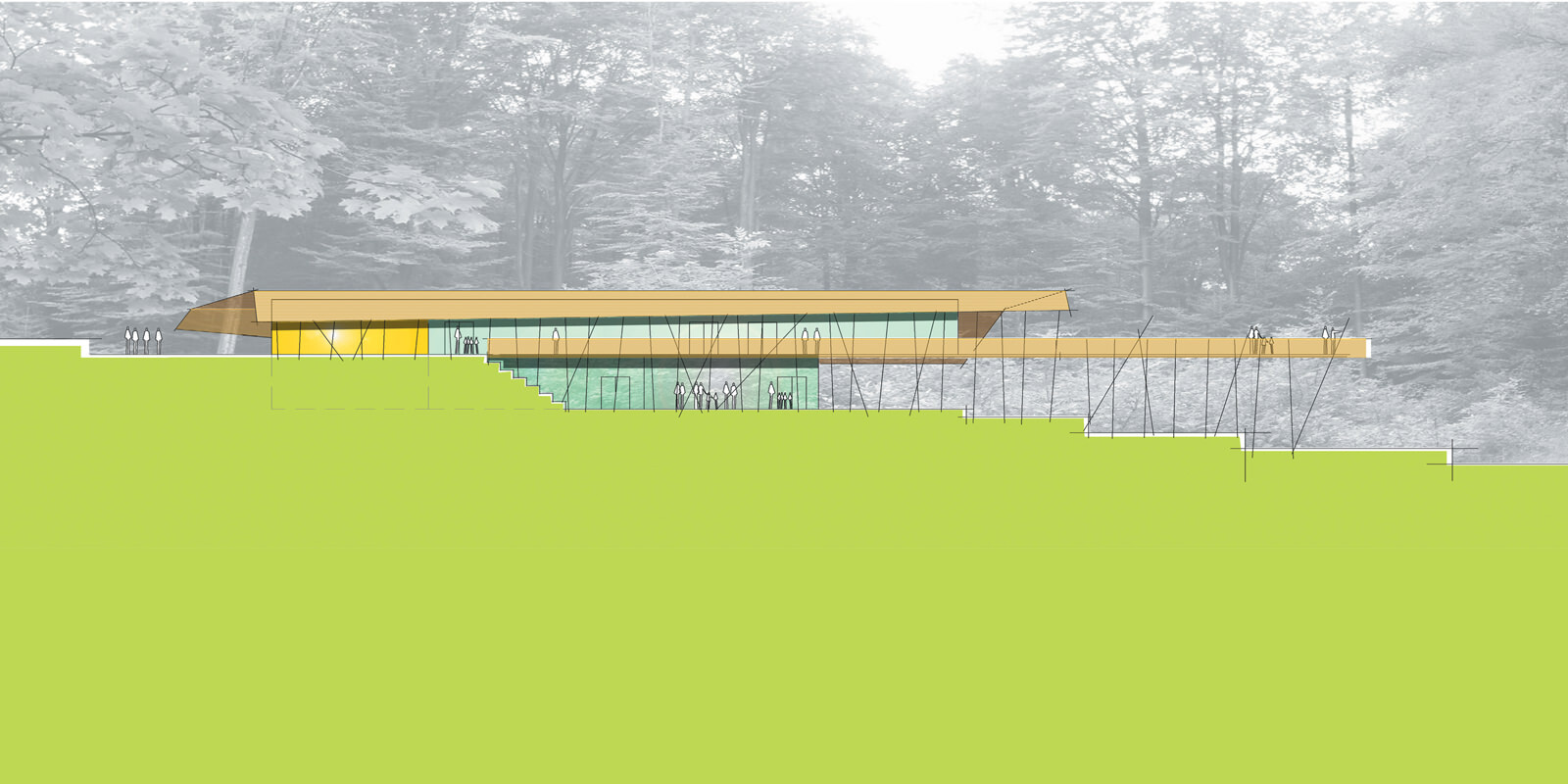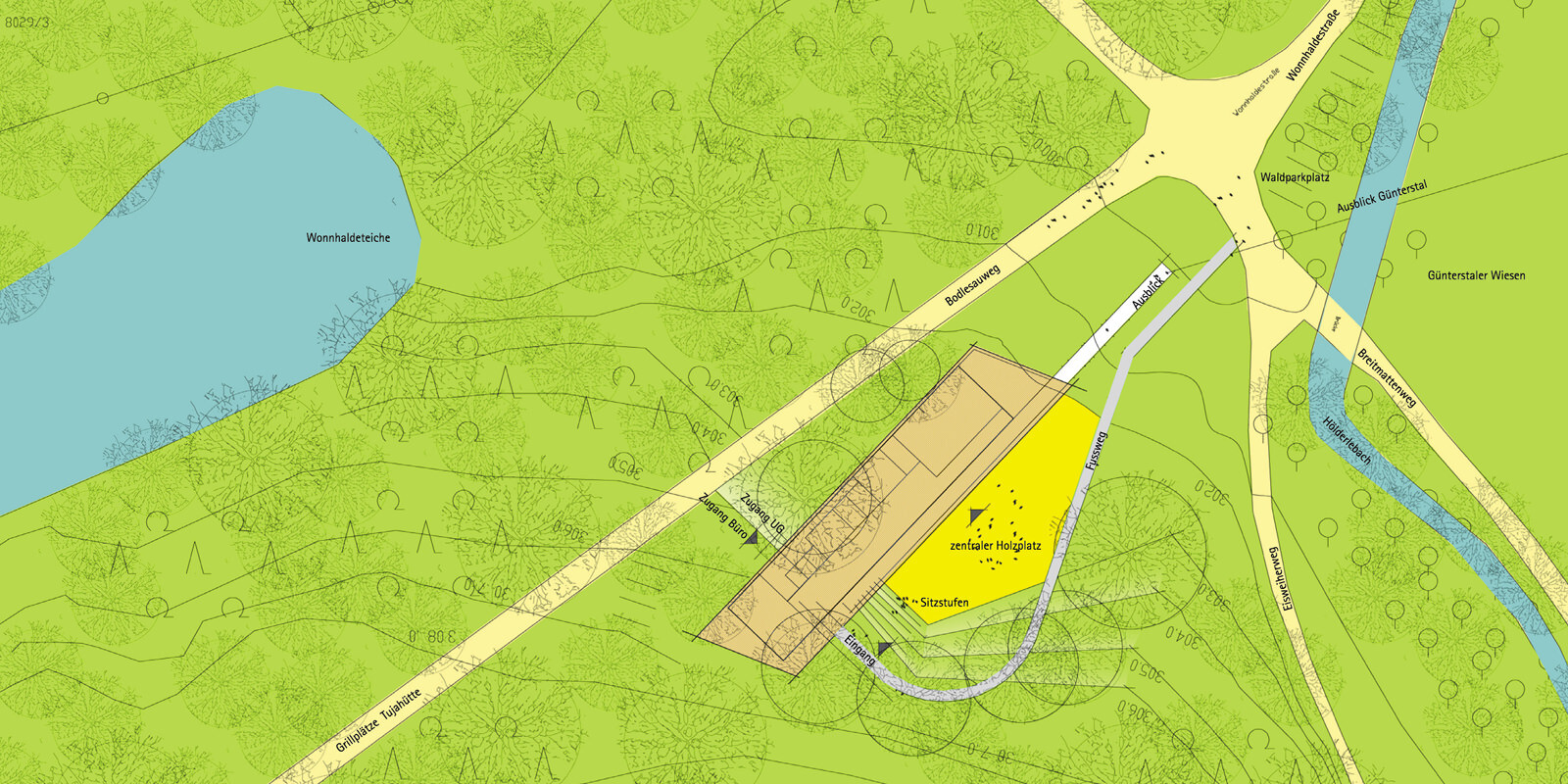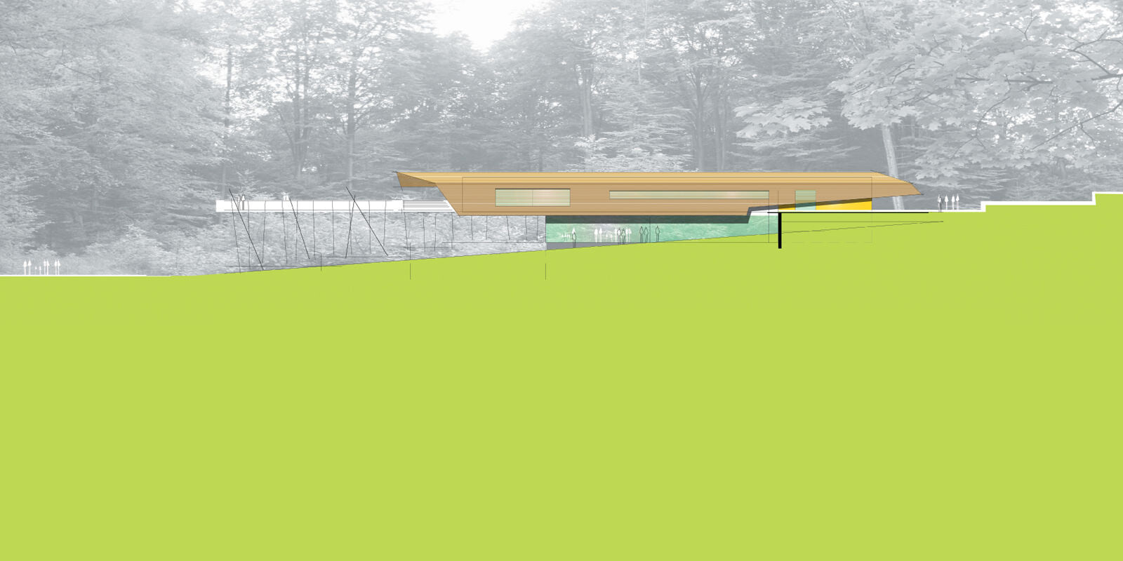Wie ein großer Langholzstapel liegt das Gebäude in einer Lichtung am Rand des Freiburger Stadtwaldes und thematisiert architektonisch die Inhalte des Hauses: Wald, Holz, Ökologie. Die verglasten Ausstellungsbereiche in der unteren Gebäudeebene orientieren sich um den zentralen Holzplatz. Das Foyer erweitert sich auf den langen Holzsteg hinaus, auf dem der Besucher fast in Höhe der Baumkronen zum Aussichtspunkt gelangt. Durch die Transparenz des Sockels scheint die Eingangsebene über dem Hang zu schweben, das Gebäude wirkt leicht und dynamisch.