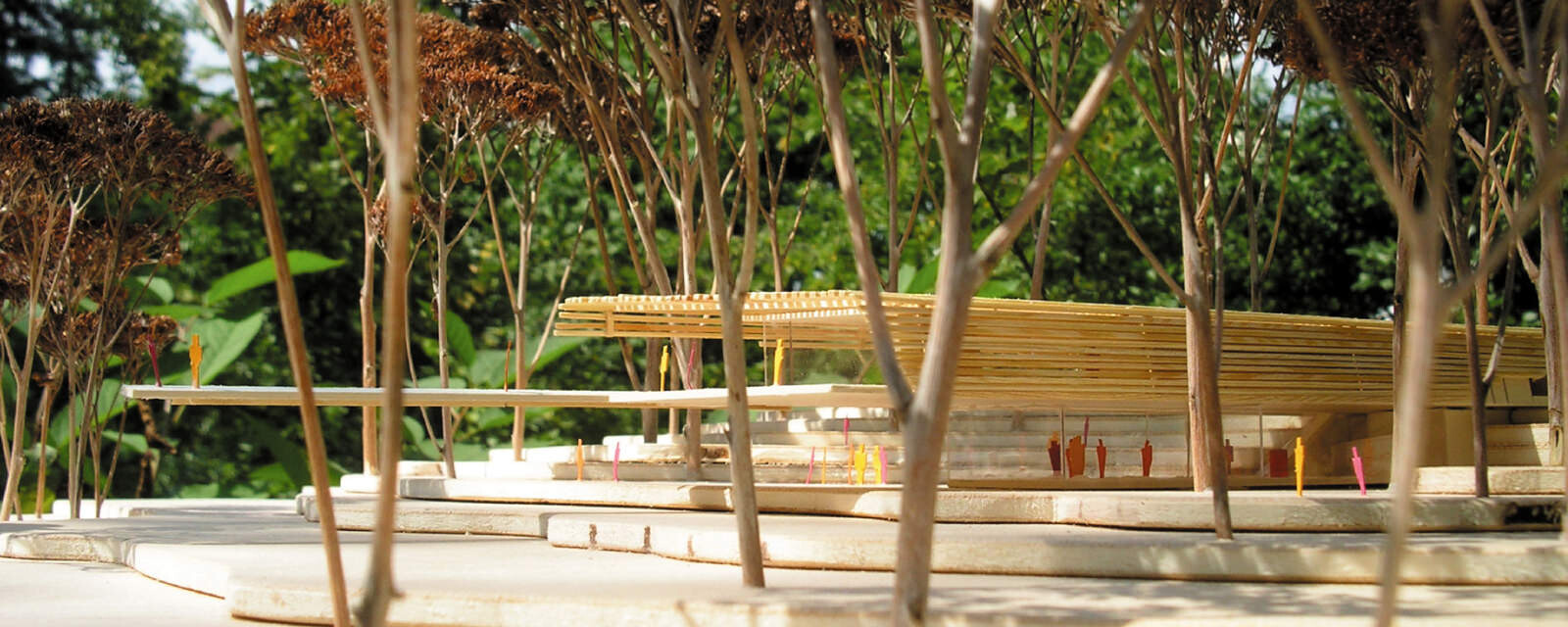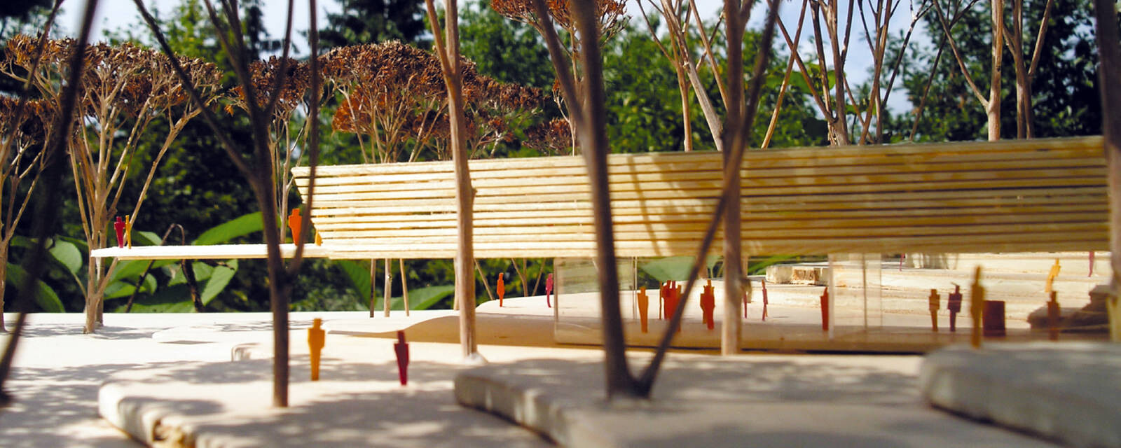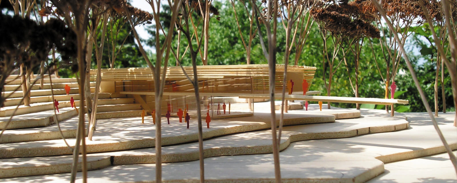 Wie ein großer Langholzstapel liegt das Gebäude in einer Lichtung am Rand des Freiburger Stadtwaldes und thematisiert architektonisch die Inhalte des Hauses: Wald, Holz, Ökologie. Die verglasten Ausstellungsbereiche in der unteren Gebäudeebene orientieren sich um den zentralen Holzplatz. Das Foyer erweitert sich auf den langen Holzsteg hinaus, auf dem der Besucher fast in Höhe der Baumkronen zum Aussichtspunkt gelangt. Durch die Transparenz des Sockels scheint die Eingangsebene über dem Hang zu schweben, das Gebäude wirkt leicht und dynamisch.